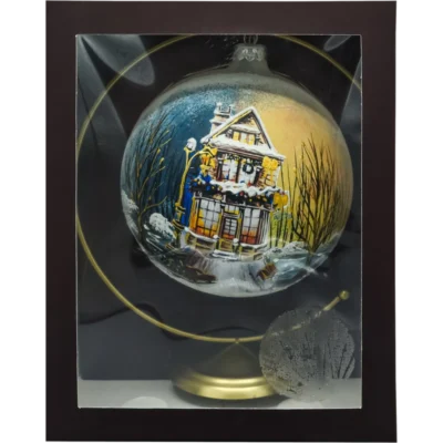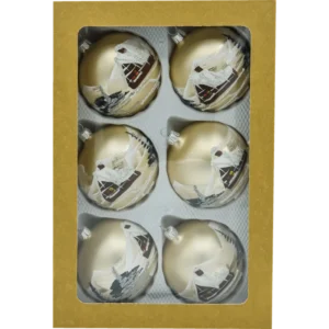 Elegancki komplet 6 ręcznie dmuchanych i ręcznie malowanych bombek szklanych 8 cm w kolorze szampańskiego złota. Każda sztuka przedstawia nastrojową scenę zimowego domku z ośnieżonym dachem, choinkami i połyskującym śniegiem akcentowanym srebrnym brokatem. Delikatna, satynowa powłoka pięknie odbija światło lampek, a malunek 360° sprawia, że bombka zachwyca z każdej strony. Zestaw zapakowany jest w kraftowe pudełko z okienkiem – gotowe na prezent i bezpieczne przechowywanie.