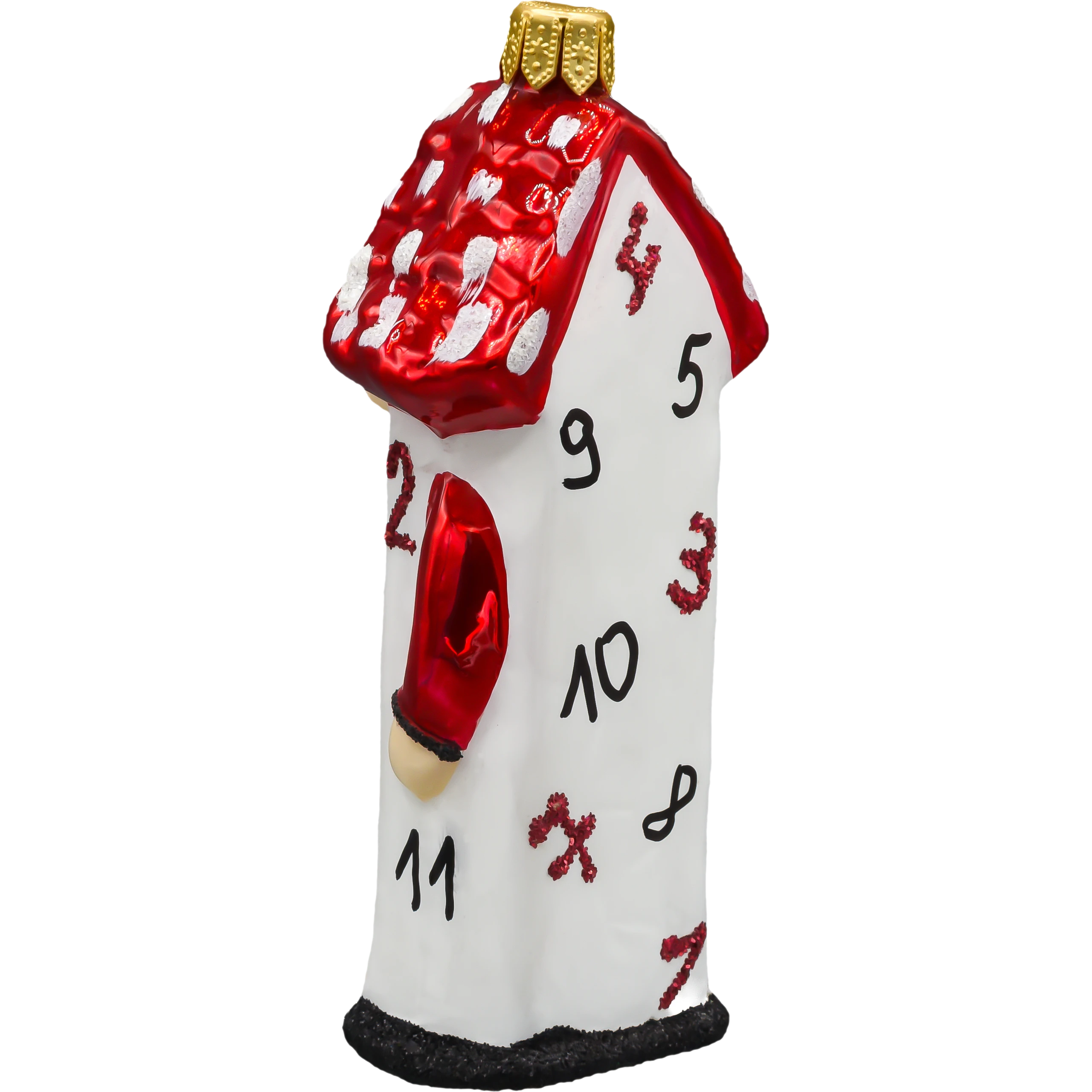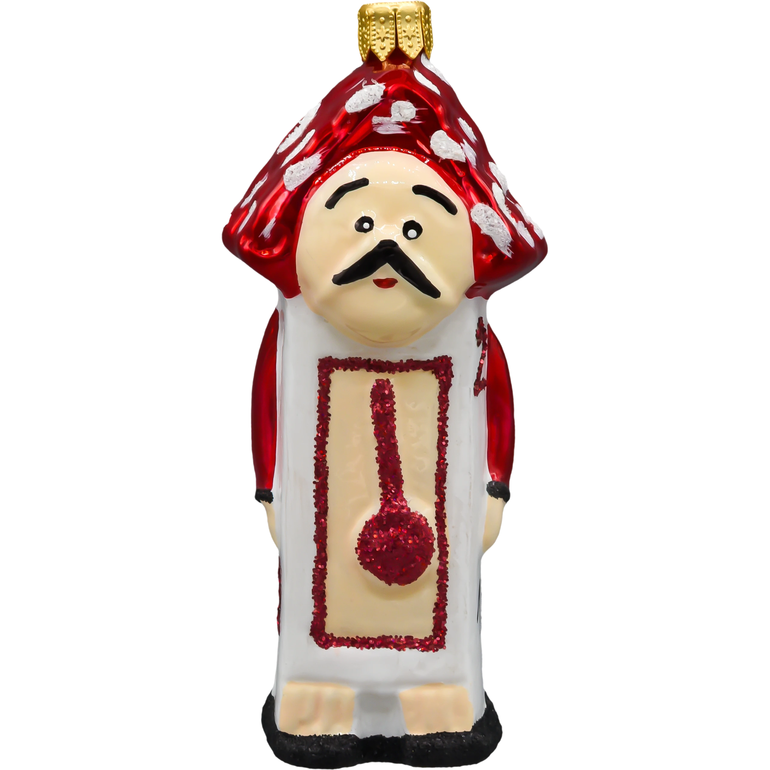 Bombka przedstawia zegar z ludzką twarzą, charakterystycznym wąsem i wyrazistymi oczami, ubrany w biały strój z czerwonymi rękawami i ozdobny czerwony kapelusz w kropki, przypominający grzyb muchomora. Na bokach bombki widoczne są cyfry zegarowe (od 1 do 12), a na froncie – błyszcząca brokatowa wskazówka i tarcza w kontrastującym kolorze czerwieni. Całość wykończona została złotą zawieszką i detalami z czerwonego brokatu, które pięknie odbijają światło lampek choinkowych.