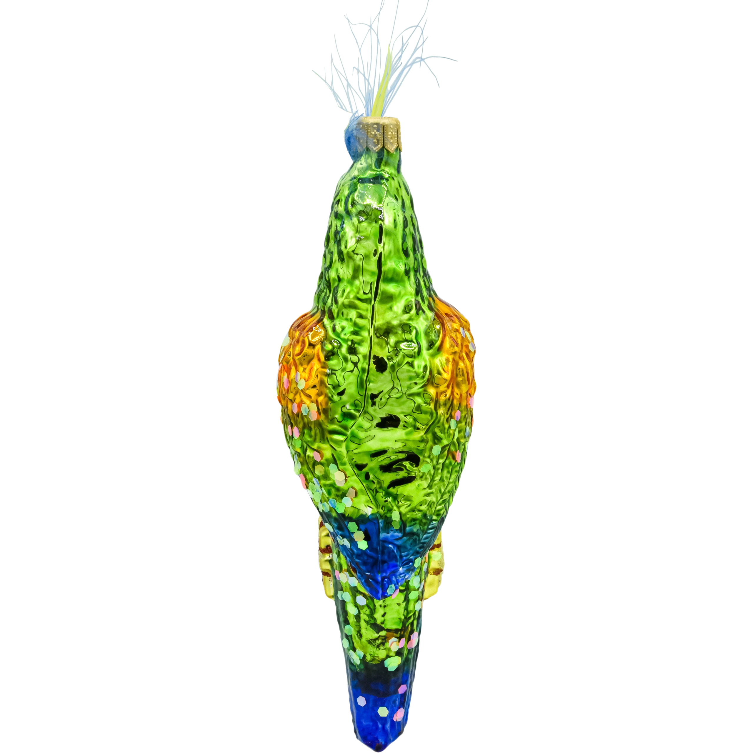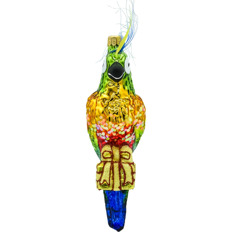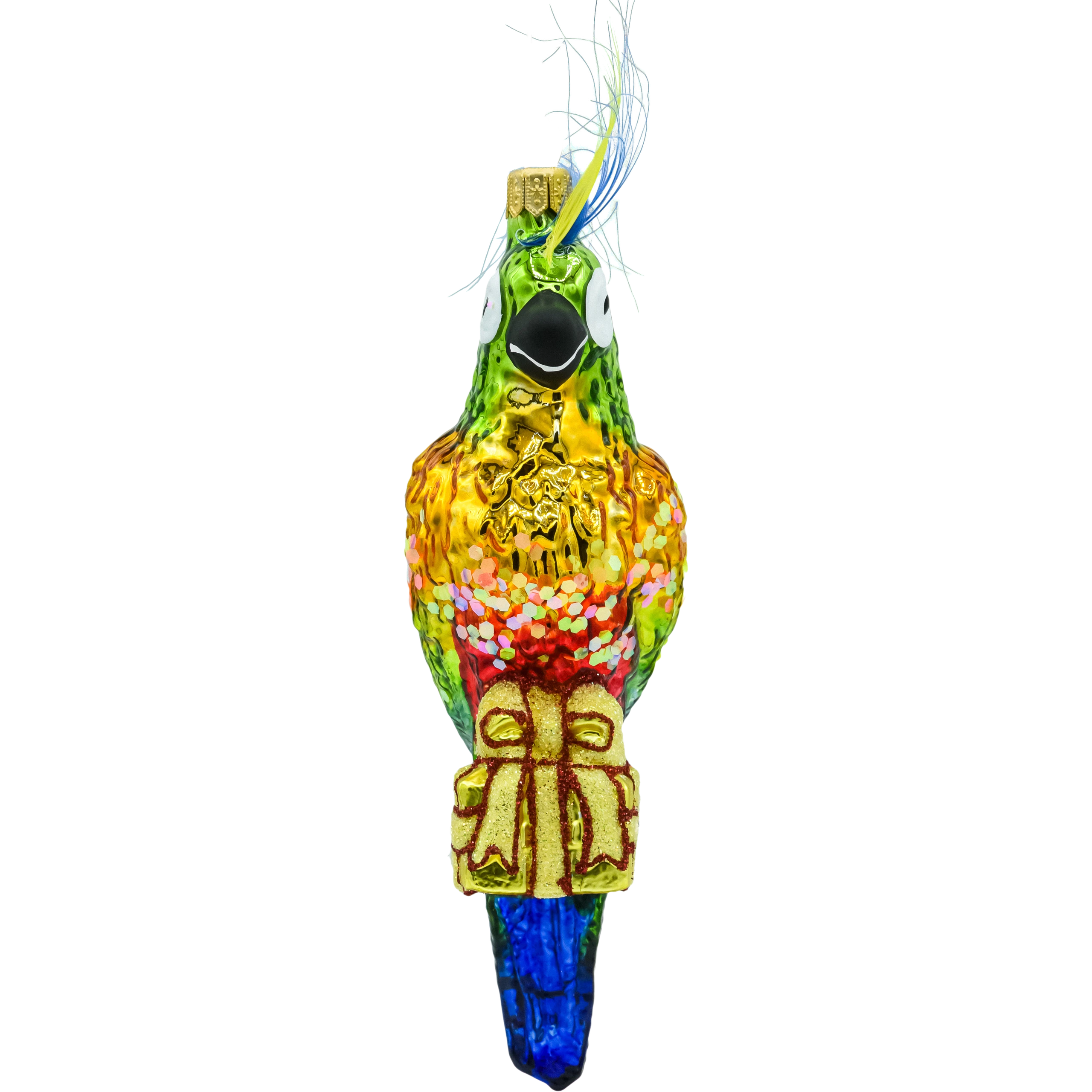Kolorowa bombka szklana – Papuga z prezentem. Ręcznie dmuchana, ręcznie malowana i bogato zdobiona brokatem oraz konfetti, z piórkowym czubkiem. Polska produkcja. Idealna ozdoba choinkowa dla miłośników ptaków i egzotycznych motywów – efektowny, błyszczący akcent w świątecznych aranżacjach.