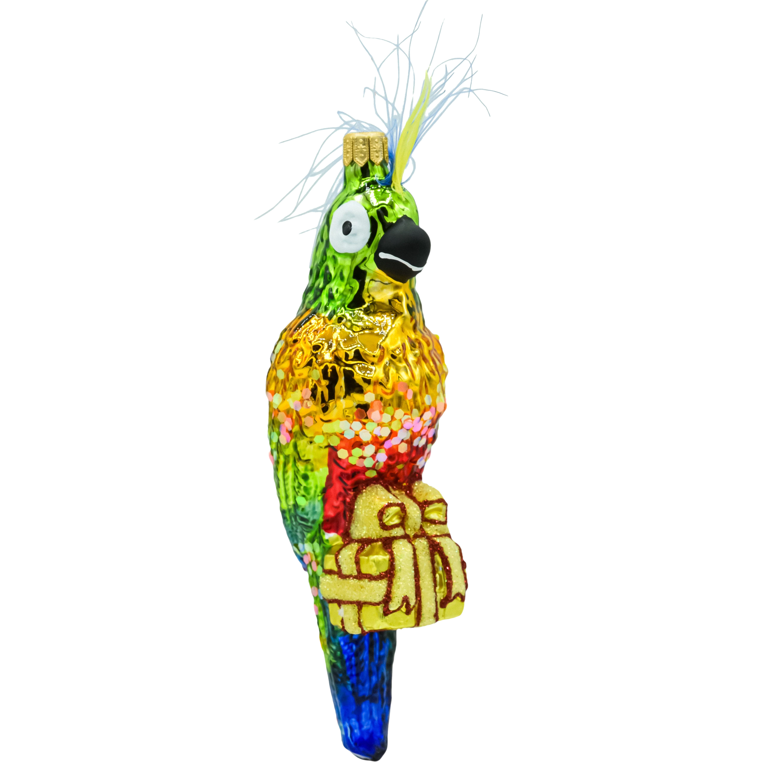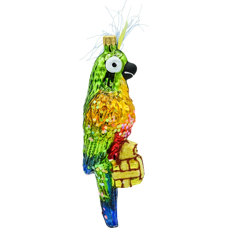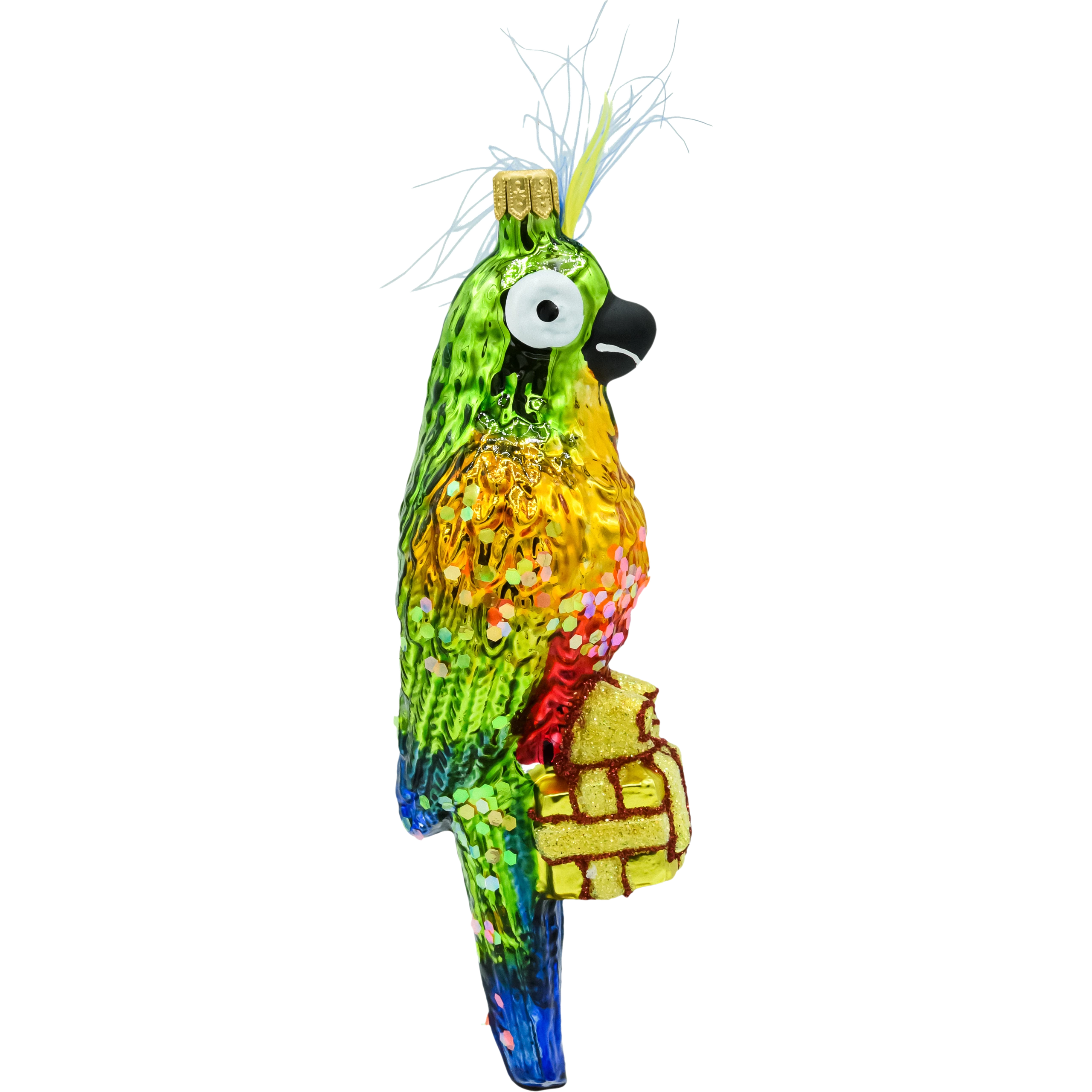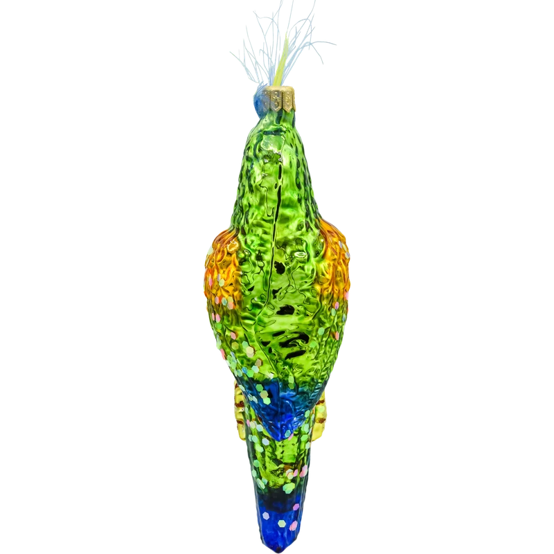 Kolorowa bombka szklana – Papuga z prezentem. Ręcznie dmuchana, ręcznie malowana i bogato zdobiona brokatem oraz konfetti, z piórkowym czubkiem. Polska produkcja. Idealna ozdoba choinkowa dla miłośników ptaków i egzotycznych motywów – efektowny, błyszczący akcent w świątecznych aranżacjach.