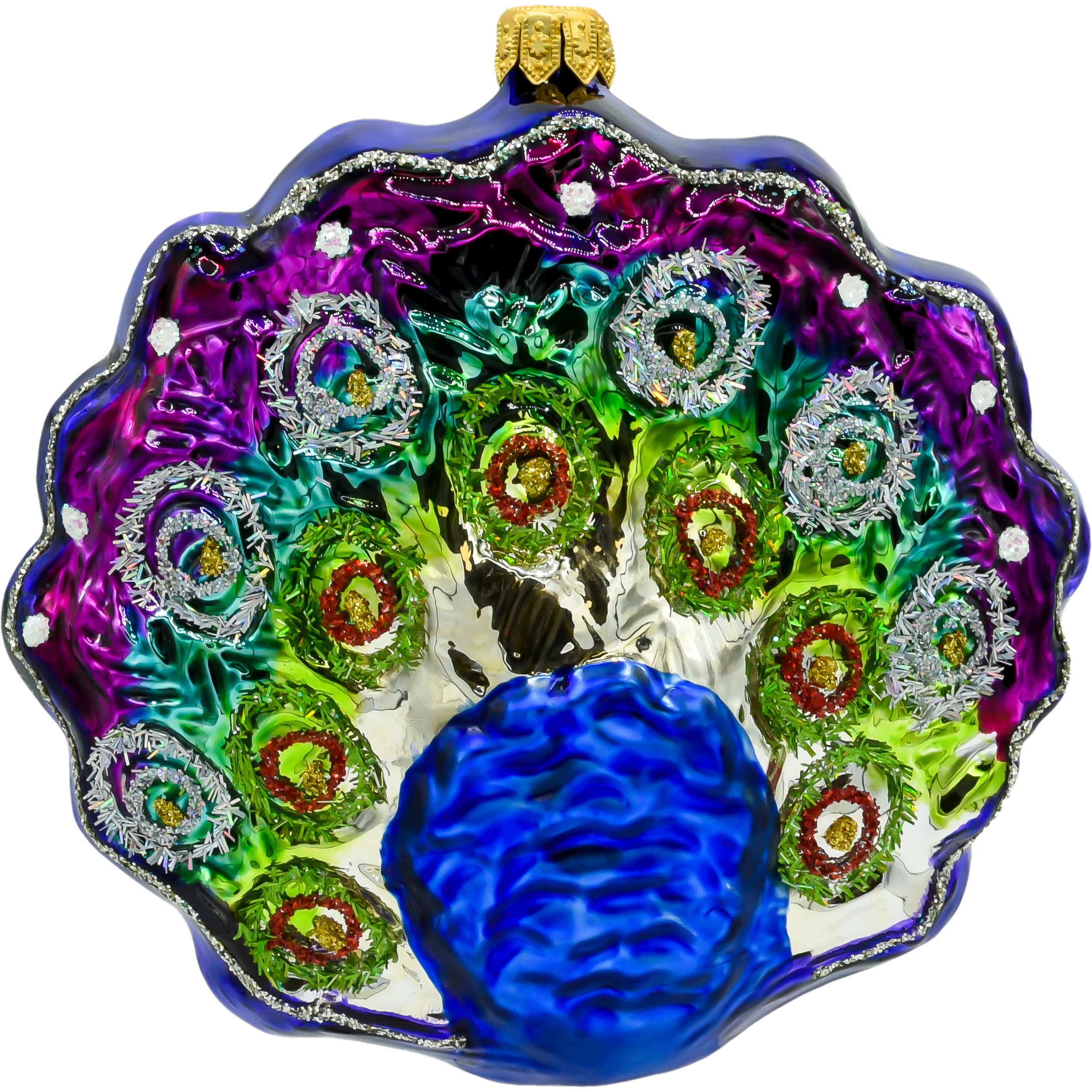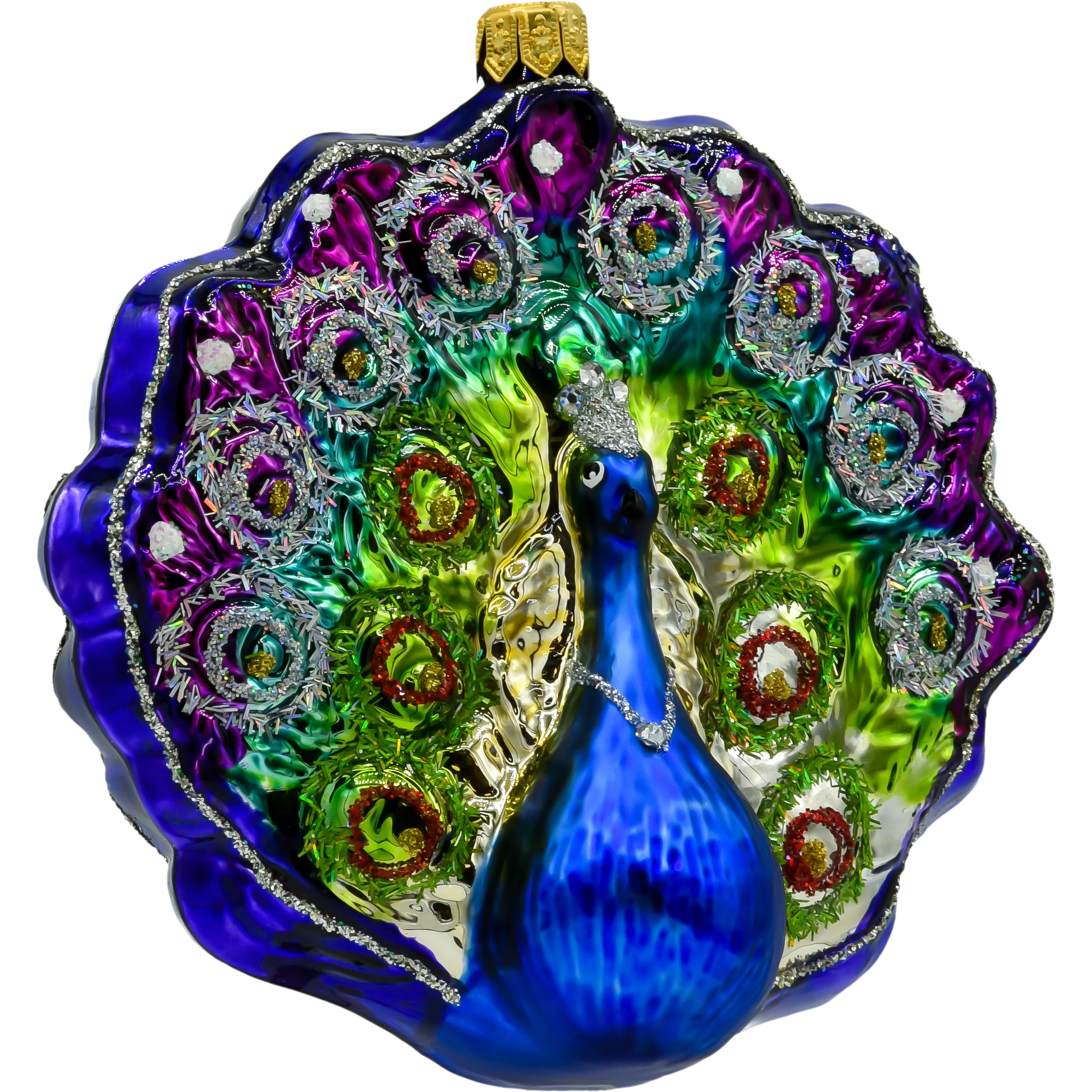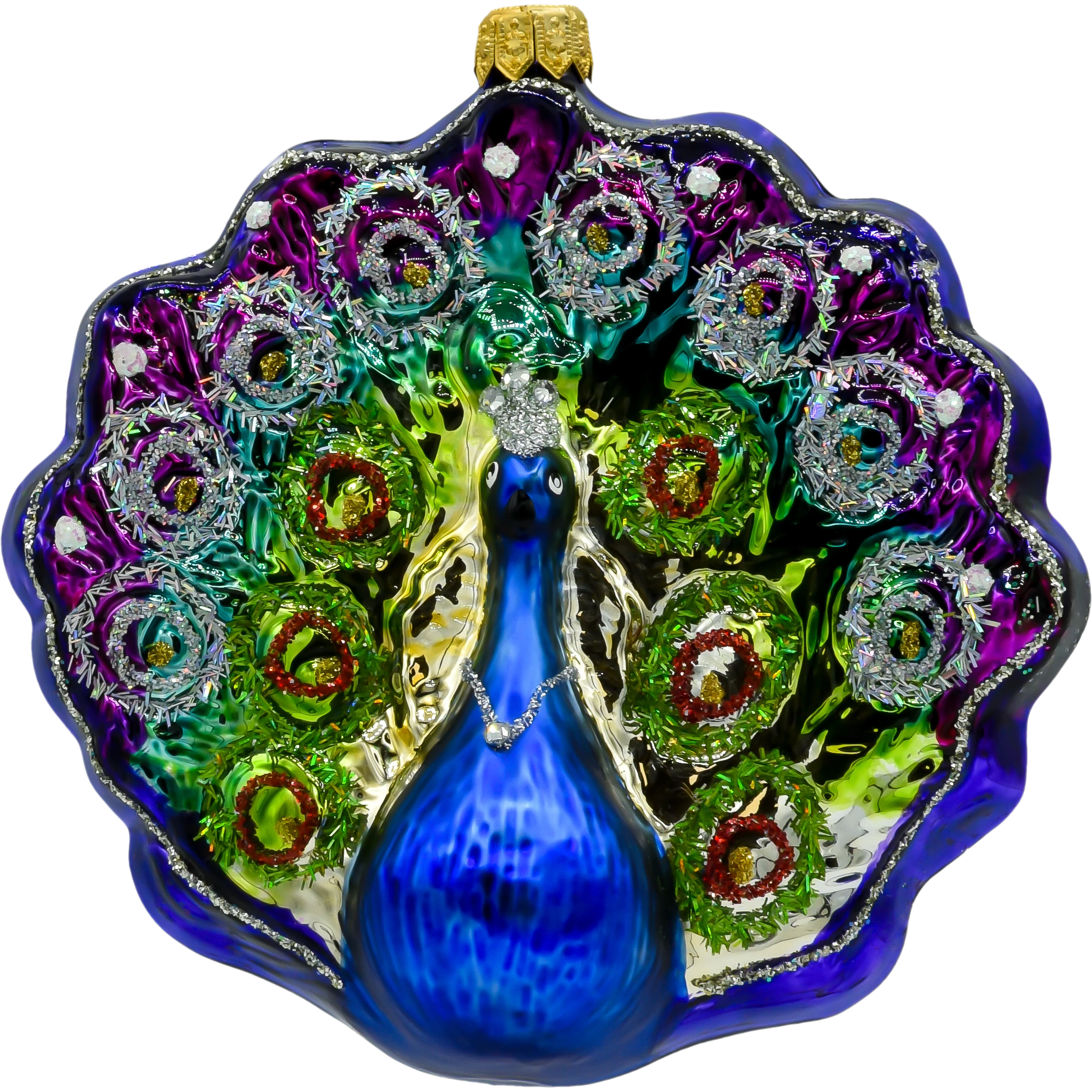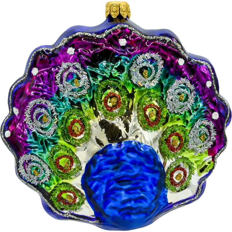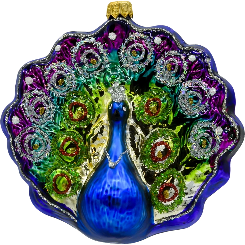 Bombka przedstawia pawia z rozłożonym ogonem, pełnym kolorowych, błyszczących piór, które mienią się odcieniami zieleni, fioletu, złota i różu. Centralnym punktem jest intensywnie niebieski korpus pawia, który dodaje bombce głębi i kontrastu. Każde pióro zostało starannie zdobione brokatem, co sprawia, że bombka lśni i przyciąga wzrok, stając się centralnym elementem świątecznej dekoracji.