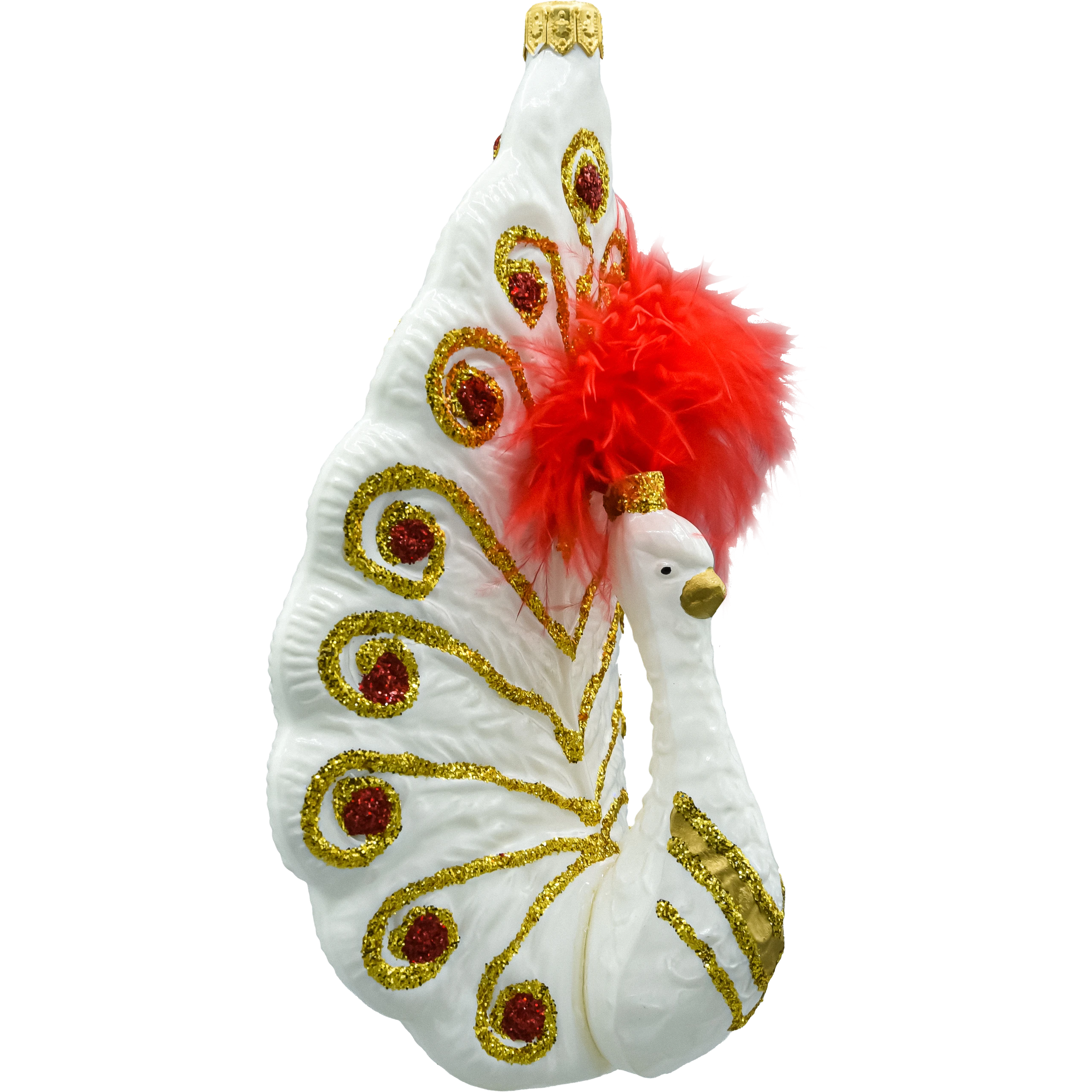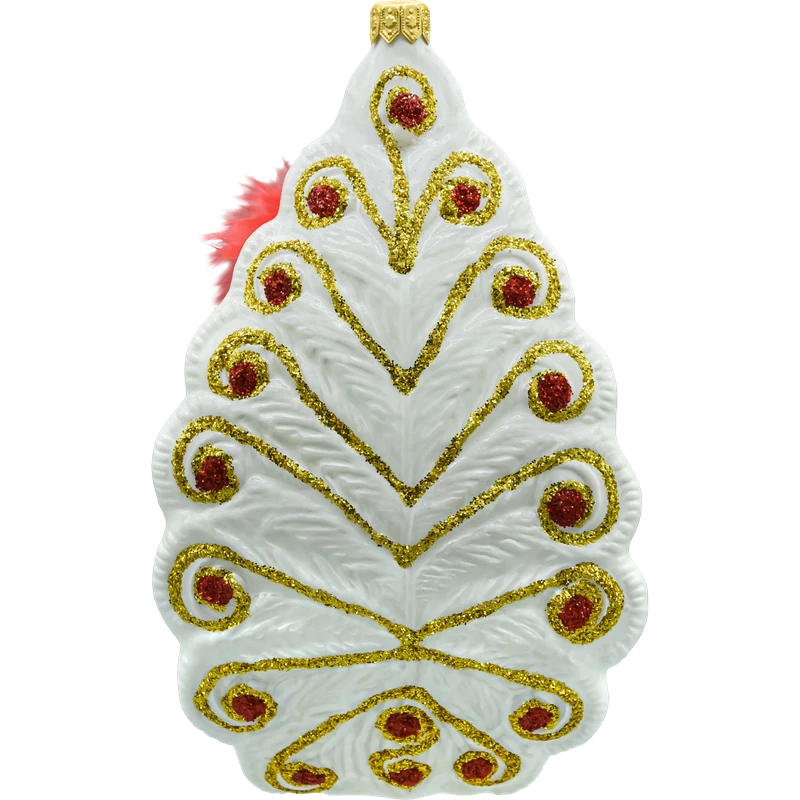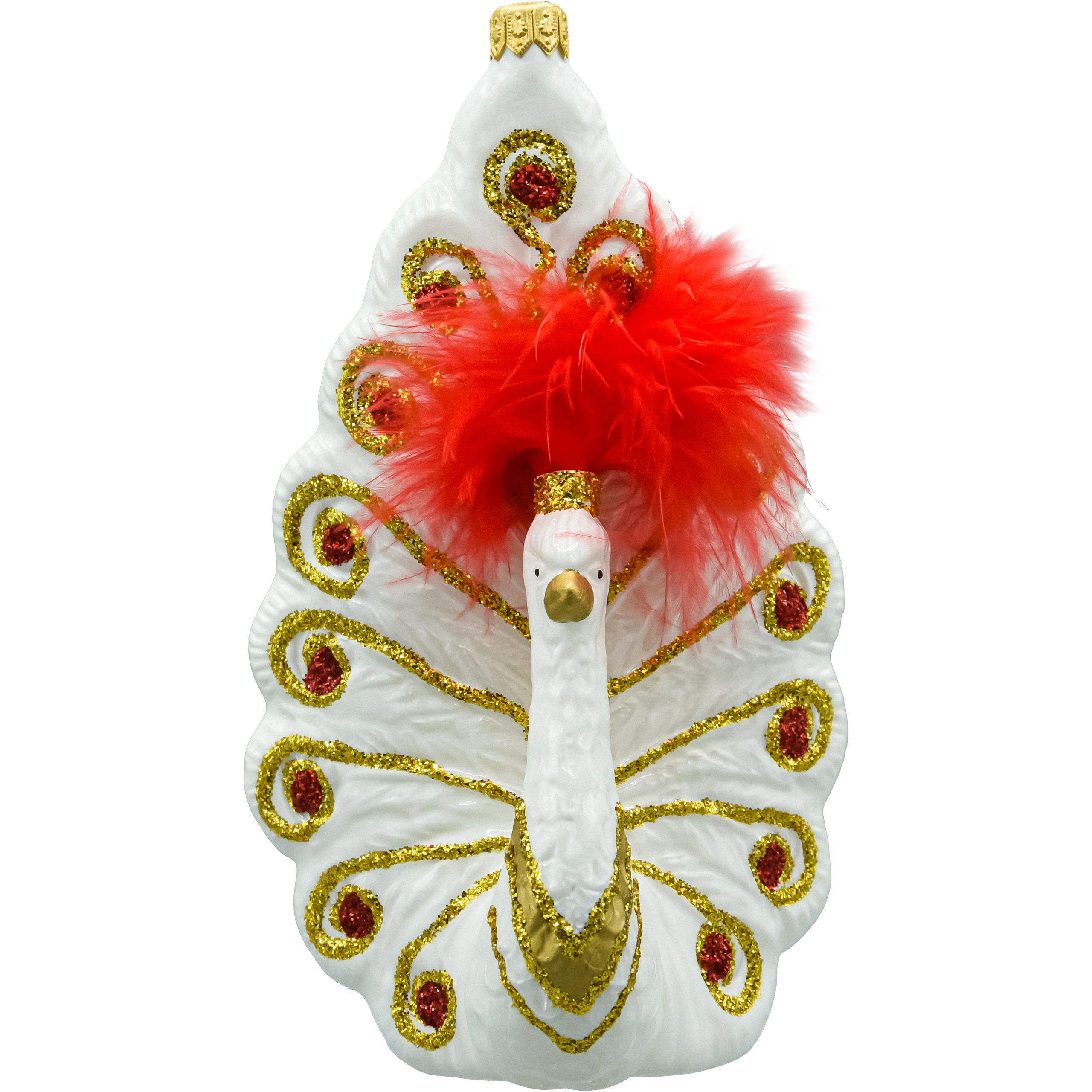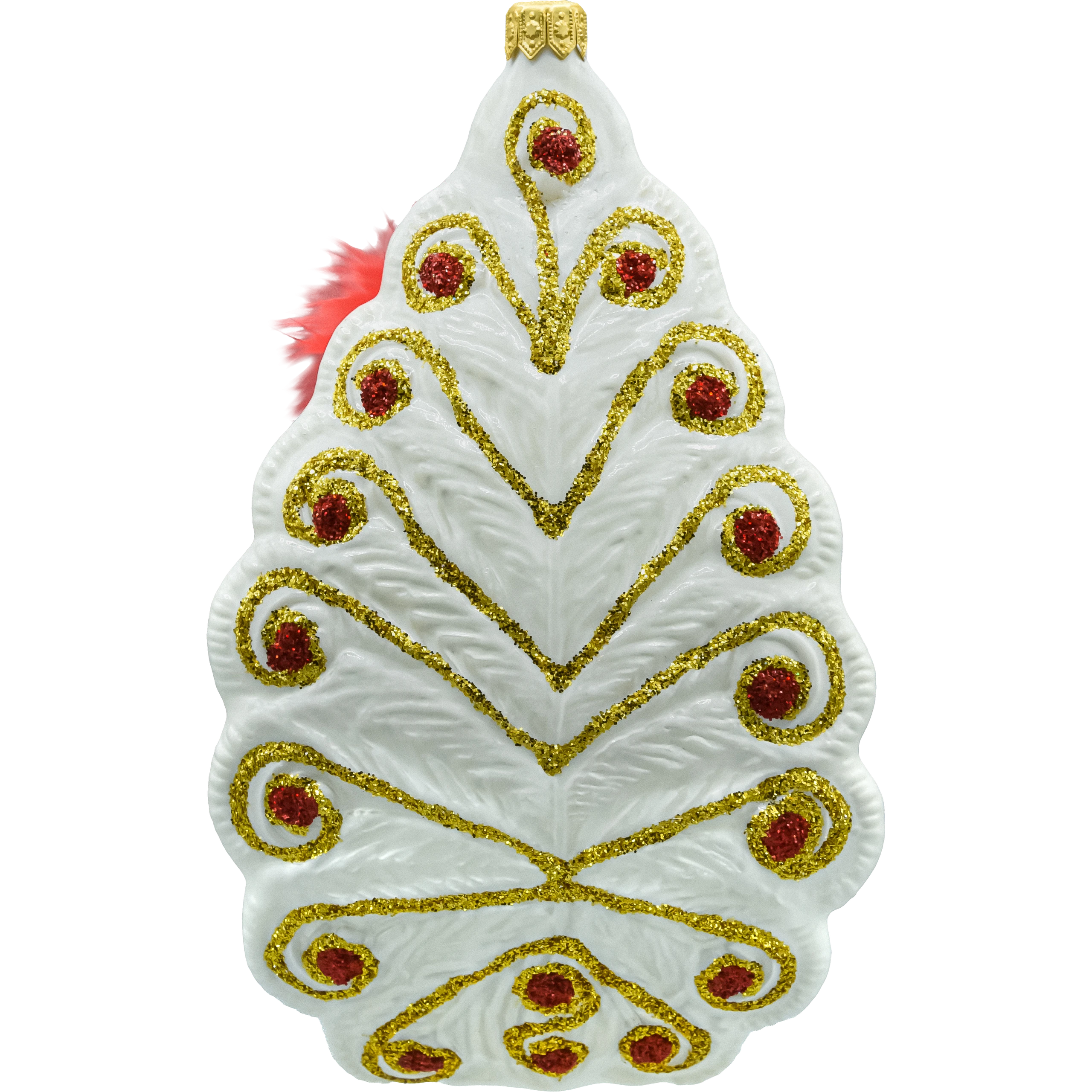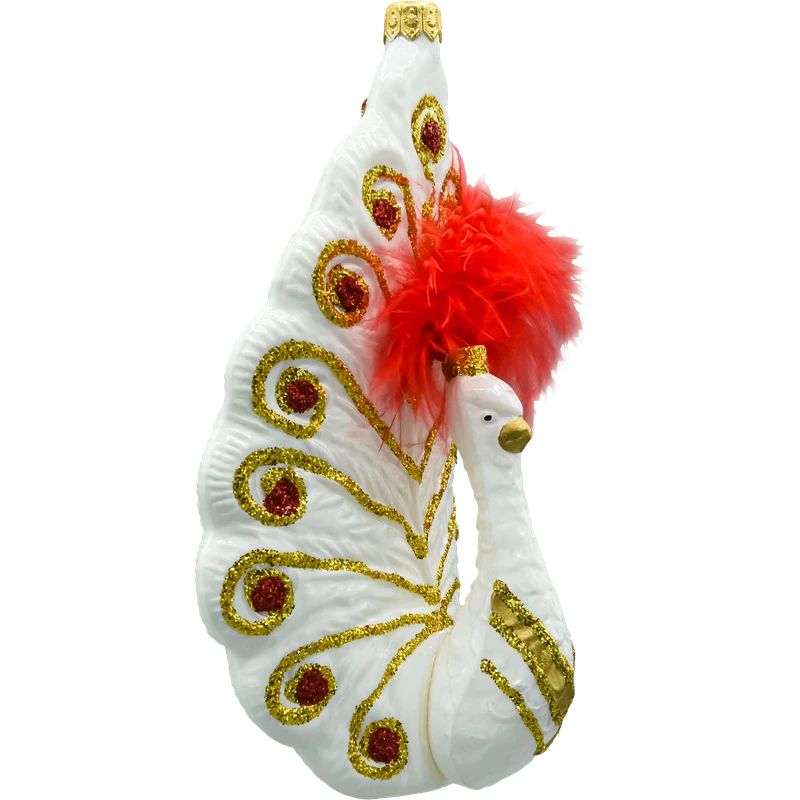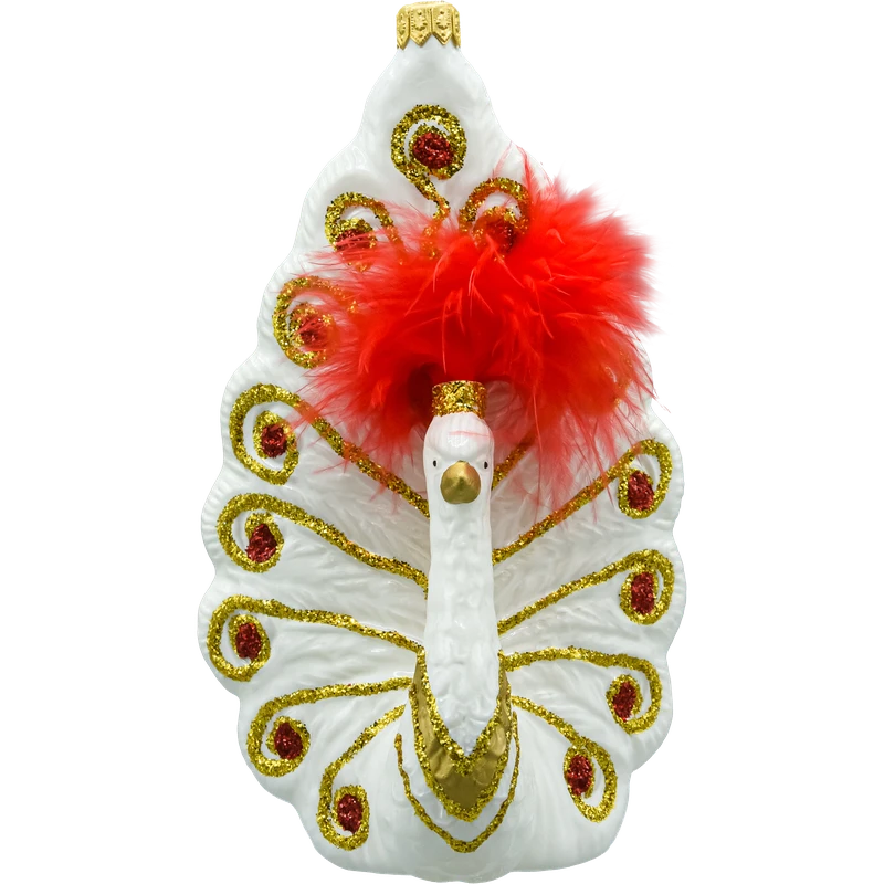 Biżuteryjna elegancja na świątecznym drzewku. Szklana bombka „Paw biały glamour” zachwyca wachlarzem ogona w perłowej bieli, poprowadzonymi ręcznie złotymi ornamentami i „oczkami” w czerwonym brokacie. Nad głową ptaka osadzono miękkie pióro w intensywnej czerwieni, które dodaje całości teatralnego, świątecznego blasku. Smukła szyja, subtelne cieniowania i wypukłe reliefy pięknie łapią światło lampek – to ozdoba, która natychmiast staje się centrum kompozycji.