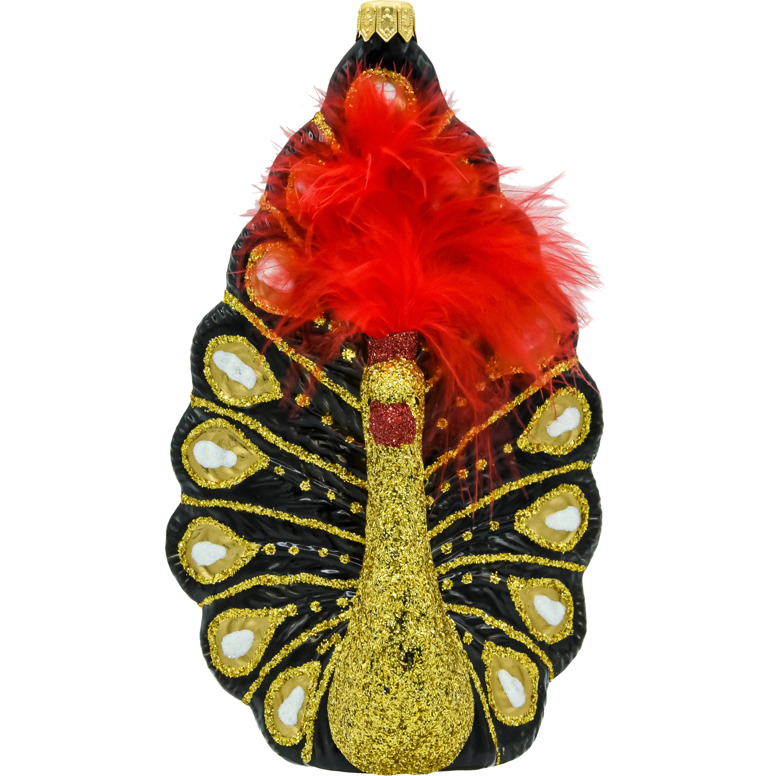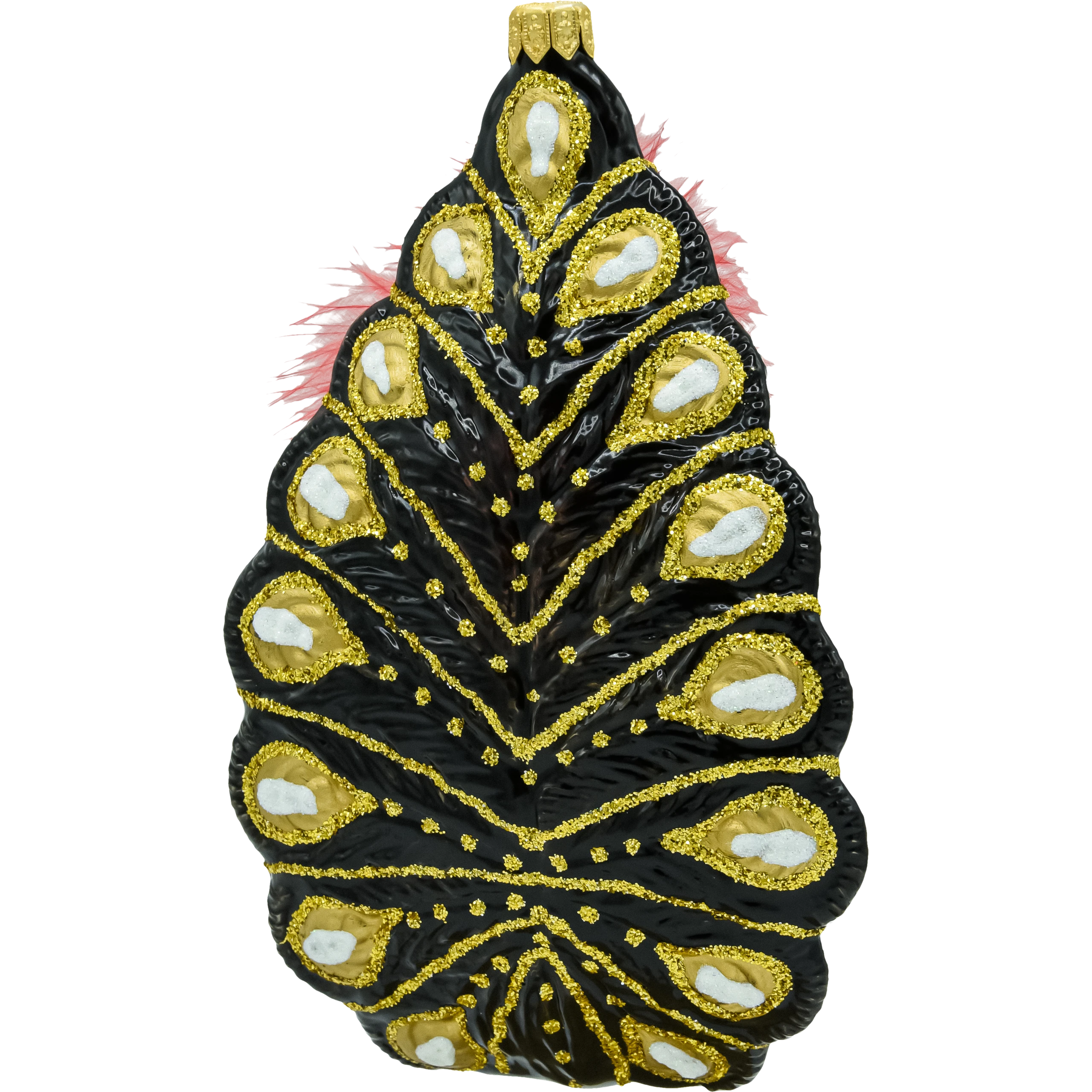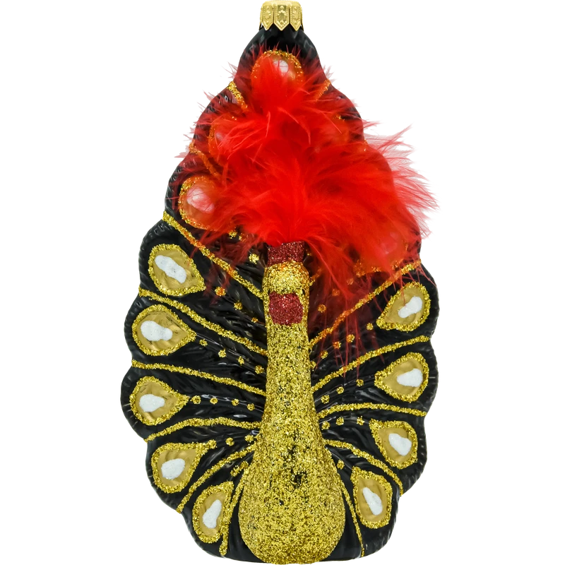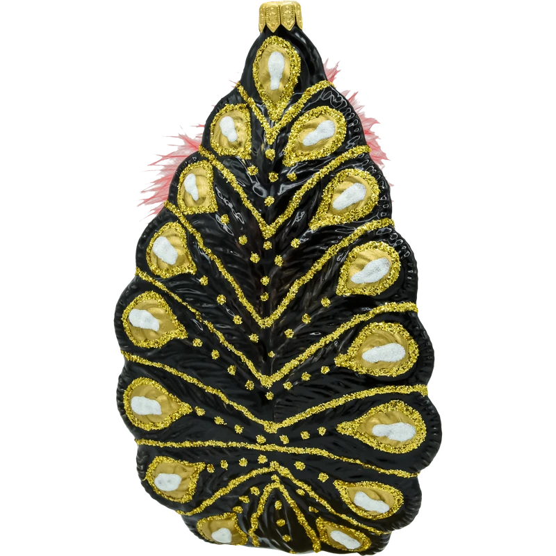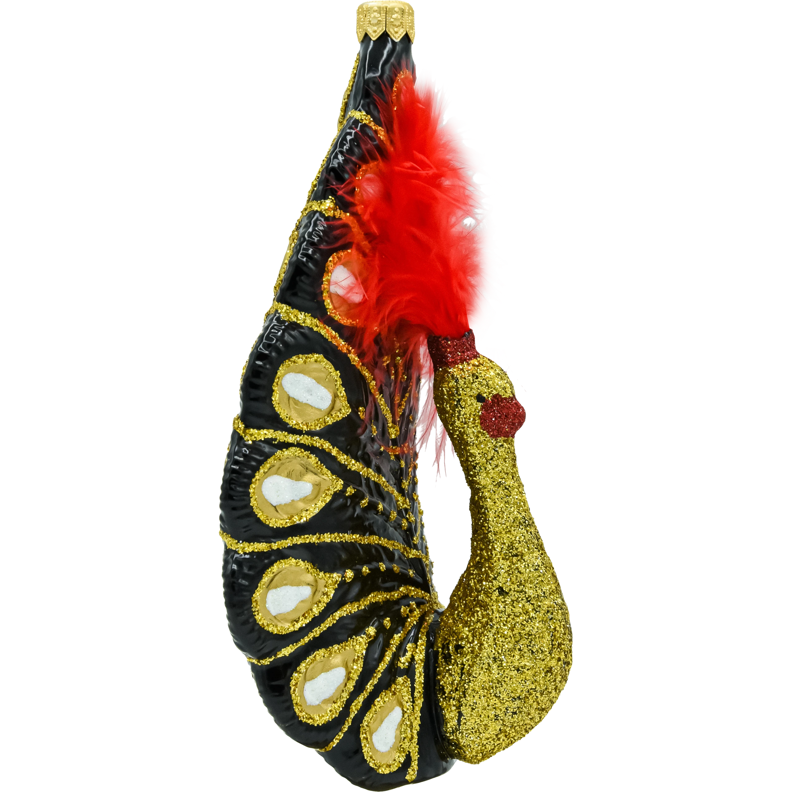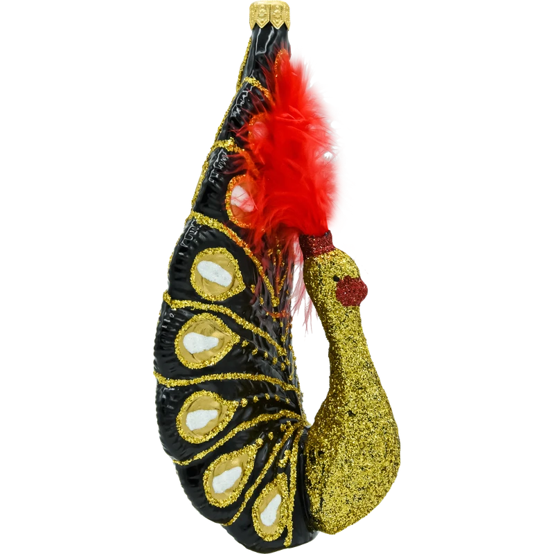 Efekt „wow” gwarantowany! Ta szklana bombka choinkowa przedstawia pawia z rozłożonym, wachlarzowym ogonem w eleganckiej czarno-złotej kolorystyce. Każde „oczko” ogona zostało podkreślone drobnym brokatem i metalicznym złotem, a środek zdobi miękkie, czerwone piórko, które dodaje kompozycji teatralnego blasku. Smukła szyja i korpus ptaka pokryte są gęstym, iskrzącym zdobieniem – ornament pięknie odbija światło lampek, tworząc luksusowy akcent w stylu glamour. To ręcznie malowana bombka dla osób, które lubią dekoracje wyraziste, kolekcjonerskie i dopracowane w najmniejszym detalu.