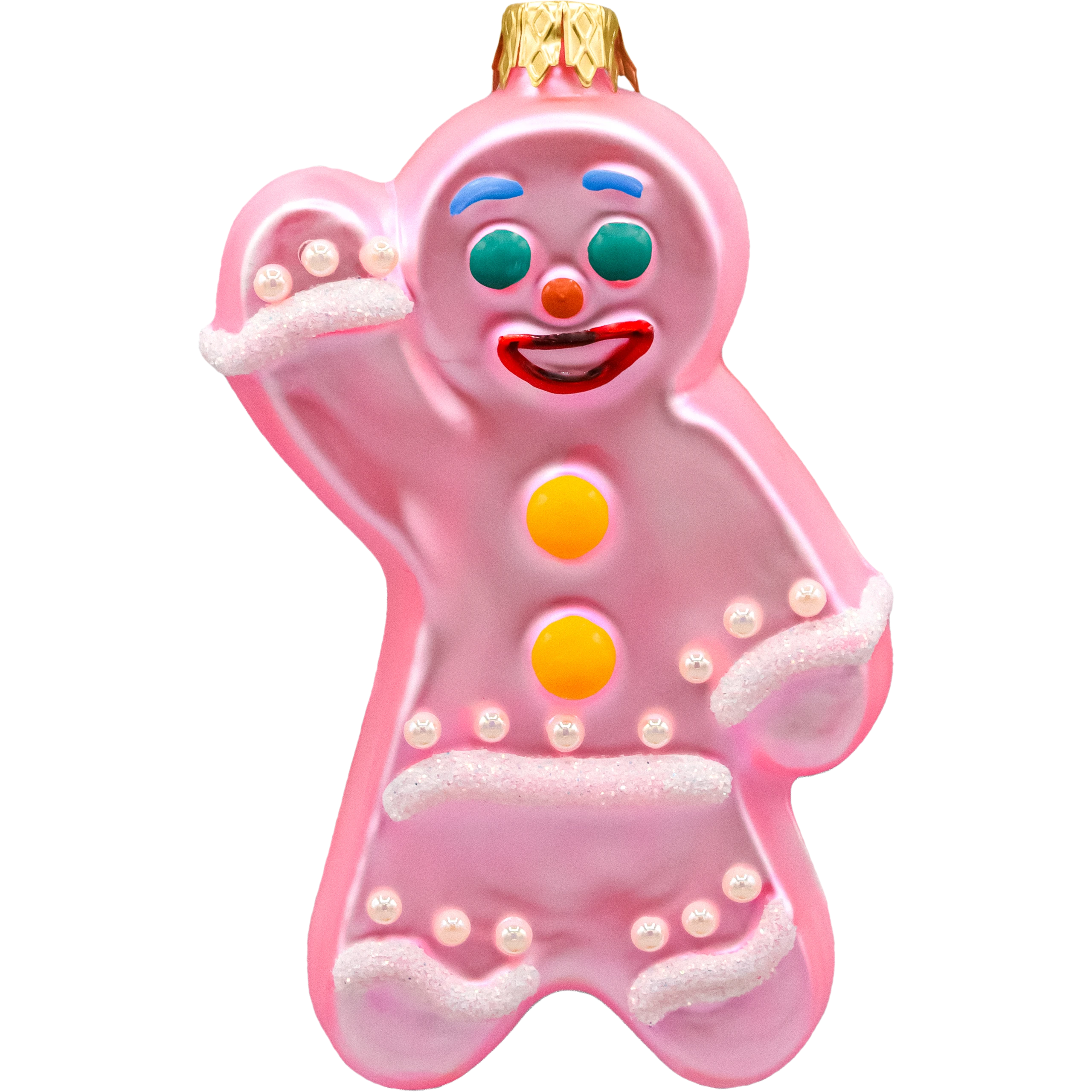 Kolorystyka: Subtelny, różowy odcień ludzika z kontrastującymi, żywymi kolorami – zielonymi oczami, czerwonym uśmiechem oraz żółtymi i czerwonymi guziczkami. Wykończenia z białego brokatu dodają blasku i elegancji, tworząc efekt śnieżnego lukru, który doskonale wpisuje się w świąteczny klimat.