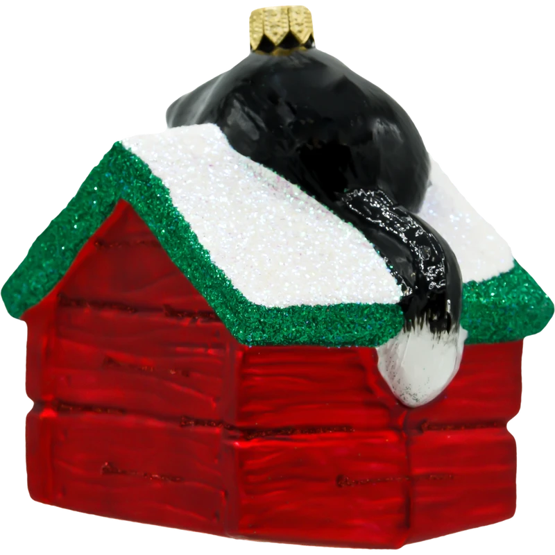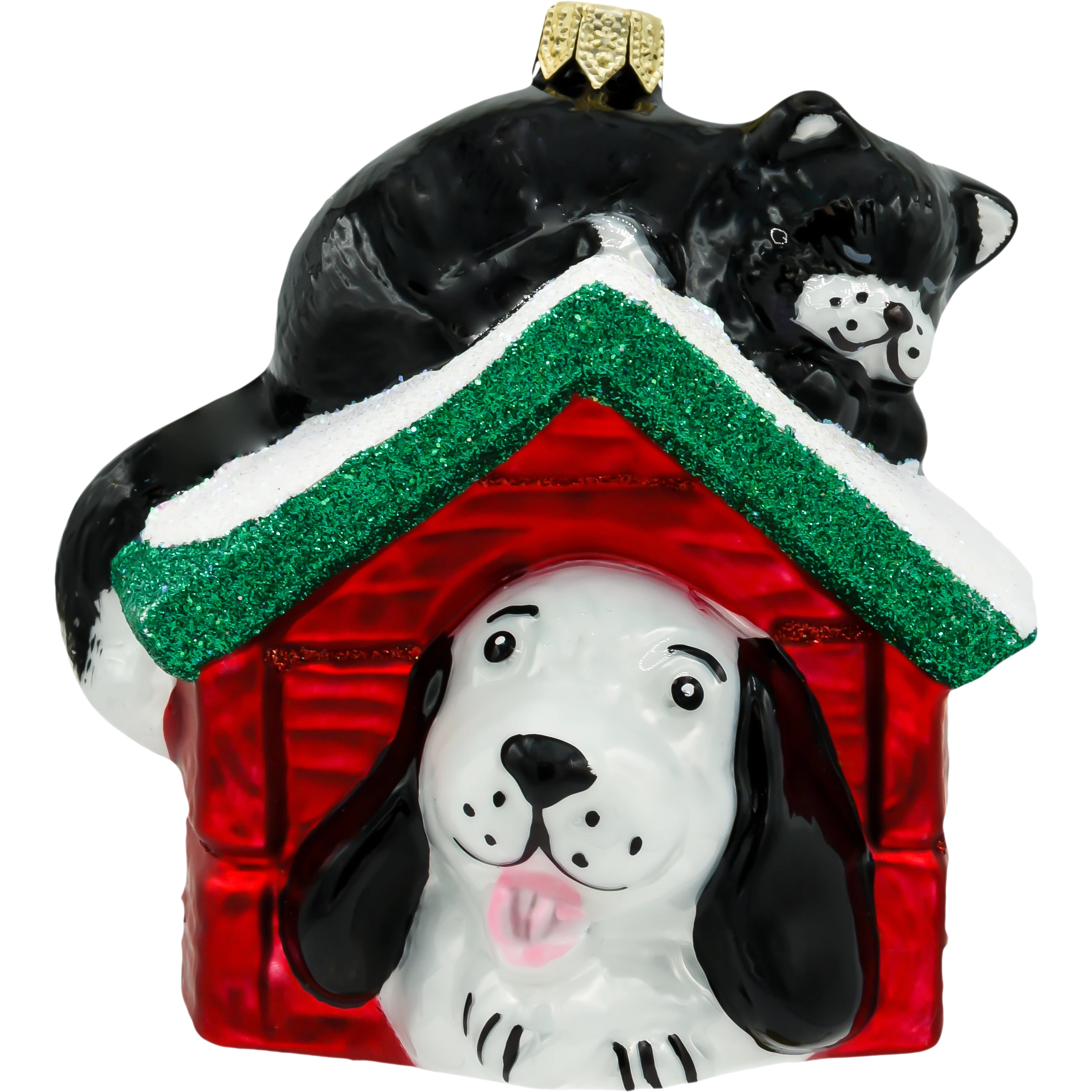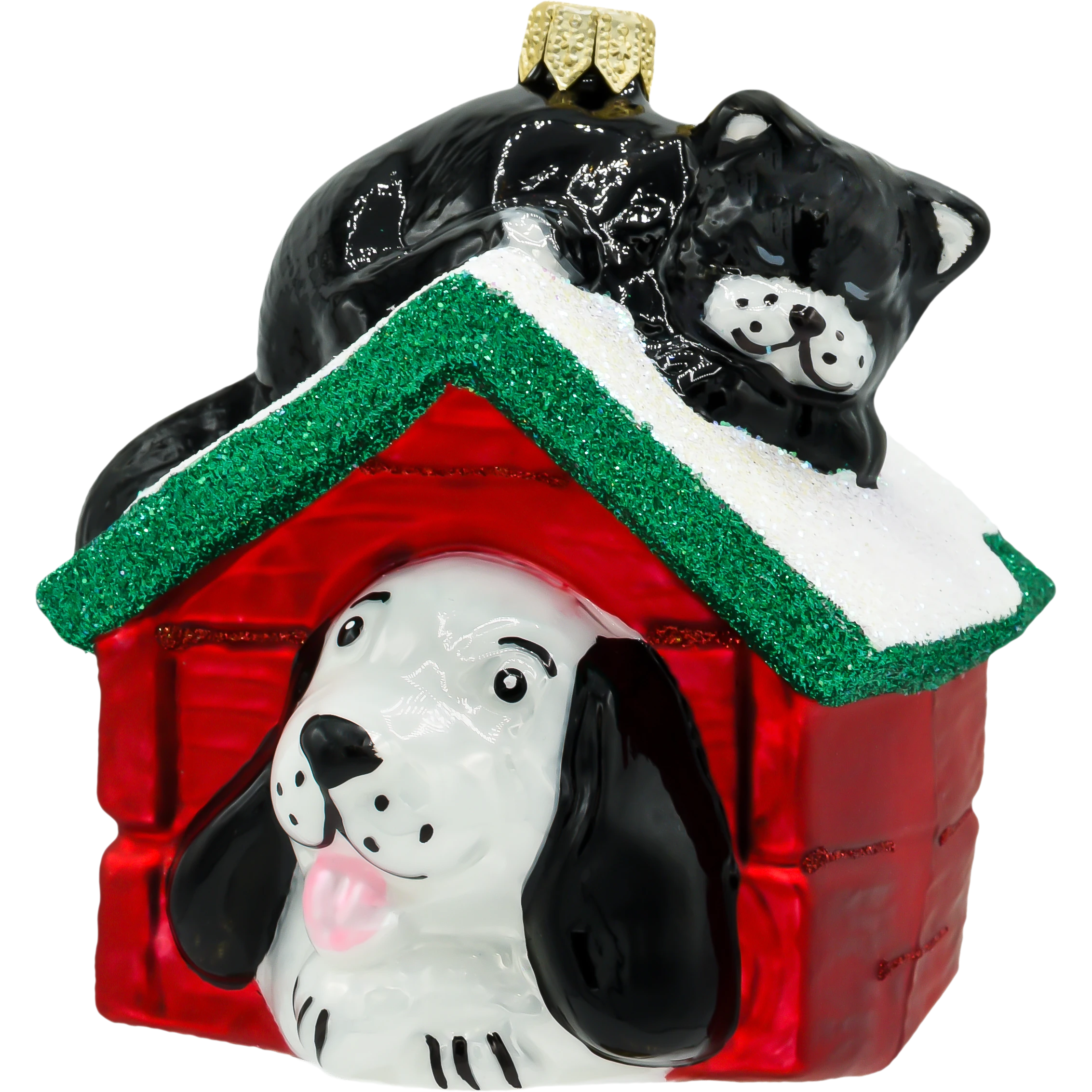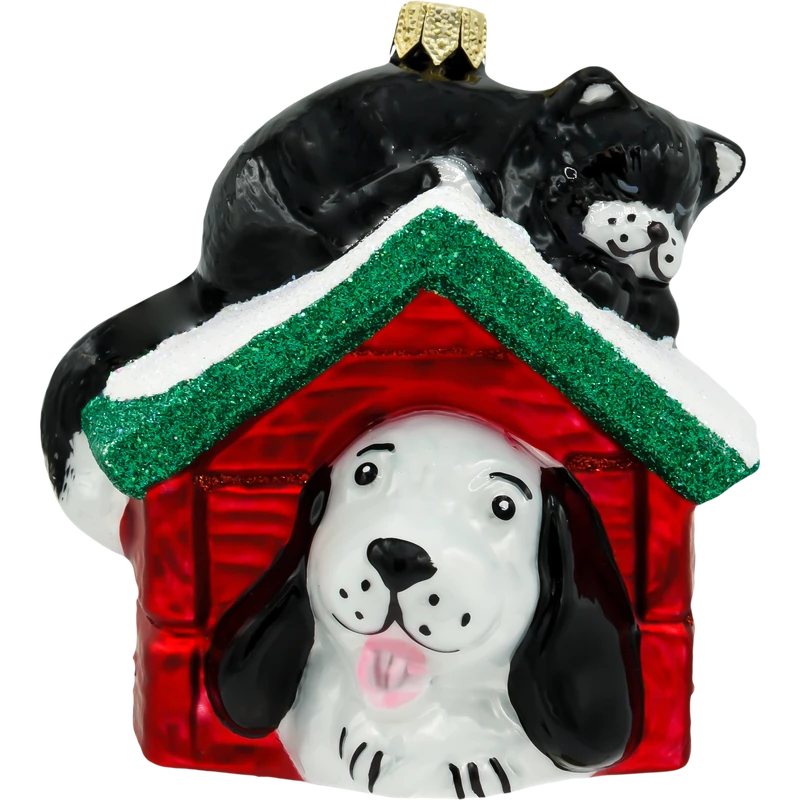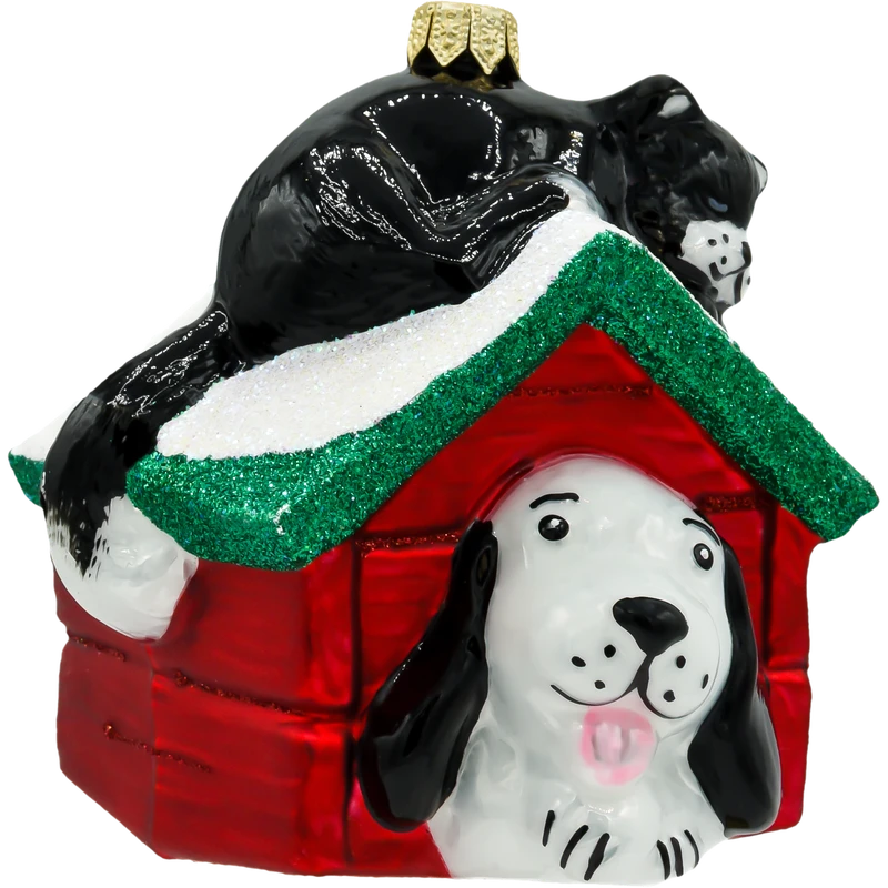 Szklana bombka choinkowa „Pies i kot w budzie” to urocza i pełna humoru dekoracja świąteczna, która zachwyci wszystkich miłośników zwierząt. Przedstawia czarnego kota wylegującego się na ośnieżonym dachu czerwonej budy oraz białego psa z czarnymi uszami wyglądającego radośnie z jej wnętrza. Ten wyjątkowy projekt łączy w sobie ciepło, przyjaźń i świąteczną atmosferę — idealnie oddając rodzinny charakter Bożego Narodzenia.