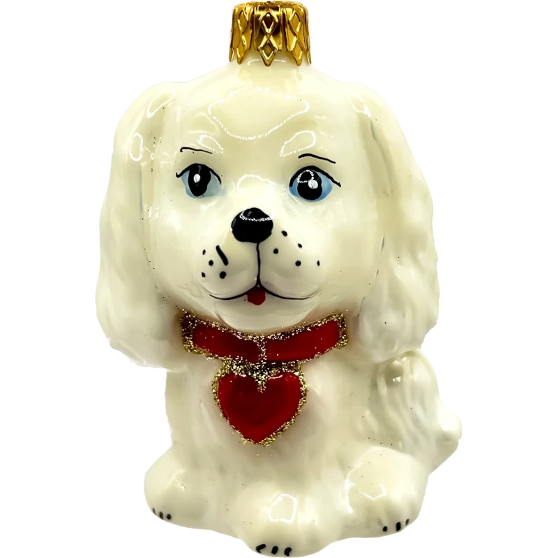 Piesek ma urocze, duże oczy i nosi na szyi czerwoną kokardkę w kształcie serca, ozdobioną brokatem. Jego sierść jest w kolorze beżowym z delikatnym połyskiem.