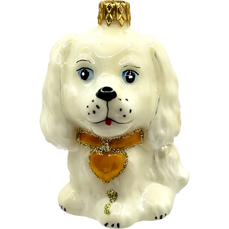 Piesek ma urocze, duże oczy i nosi na szyi pomarańczową kokardkę w kształcie serca, ozdobioną brokatem. Jego sierść jest w kolorze beżowym z delikatnym połyskiem.