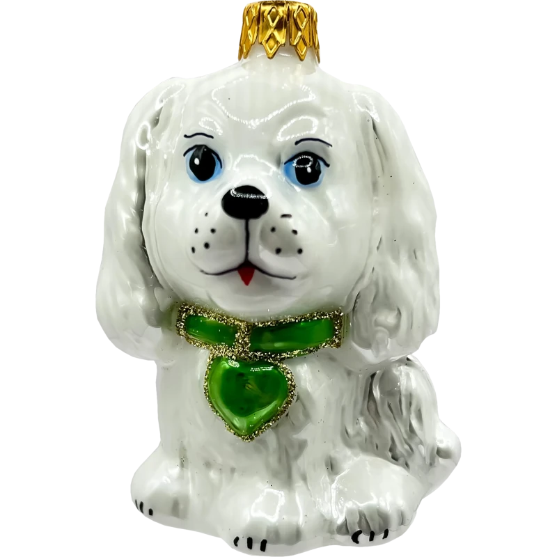 Piesek ma urocze, duże oczy i nosi na szyi zieloną kokardkę w kształcie serca, ozdobioną brokatem. Jego sierść jest w kolorze bieli z delikatnym połyskiem.