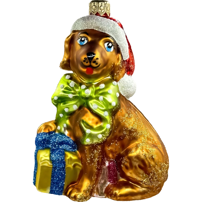 Ta urocza szklana ozdoba świąteczna w kształcie pieska z pewnością doda magii i ciepła Twoim świątecznym dekoracjom. Piesek ubrany w świąteczną czapkę oraz dużą, zieloną kokardę ozdobioną białymi kropkami wygląda niezwykle przyjaźnie i radośnie. Ozdoba przedstawia psa trzymającego niebiesko-żółty prezent, co doskonale wpisuje się w świąteczny nastrój pełen prezentów i niespodzianek. Wykonany z wysokiej jakości szkła, piesek jest delikatnie połyskujący, co sprawia, że pięknie odbija światło i staje się wyjątkowym akcentem na choince.