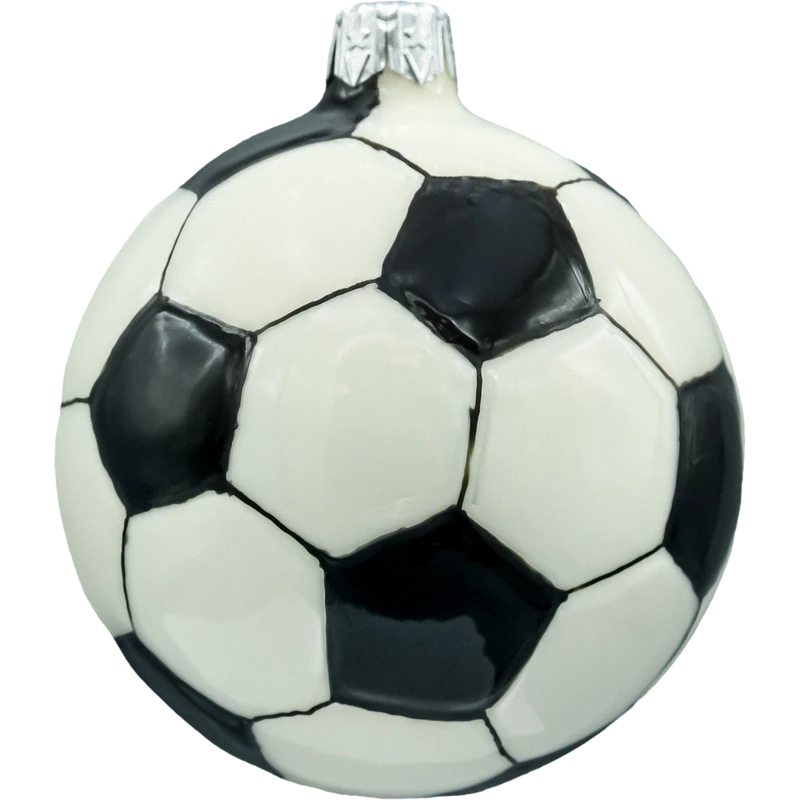 Klasyk dla fanów futbolu! Szklana bombka w kształcie piłki nożnej to dopracowana ozdoba choinkowa, która łączy sportowy charakter z elegancją ręcznego rzemiosła. Forma wiernie odwzorowuje bryłę piłki (pięciokąty/czarny – sześciokąty/biały), a gładka, błyszcząca emalia podkreśla kontrast czerni i bieli oraz pięknie odbija światło lampek. Bombka została dmuchana do formy, następnie ręcznie malowana i wykończona srebrną czapeczką z oczkiem – gotowa do zawieszenia na choince, girlandzie czy stojaku.