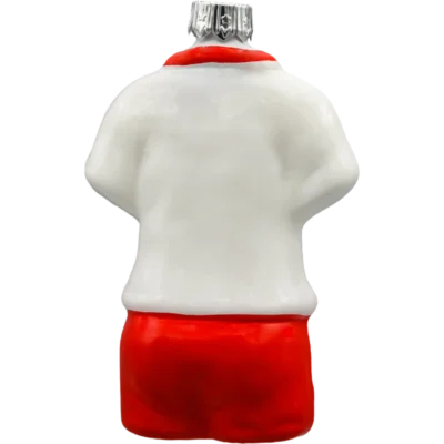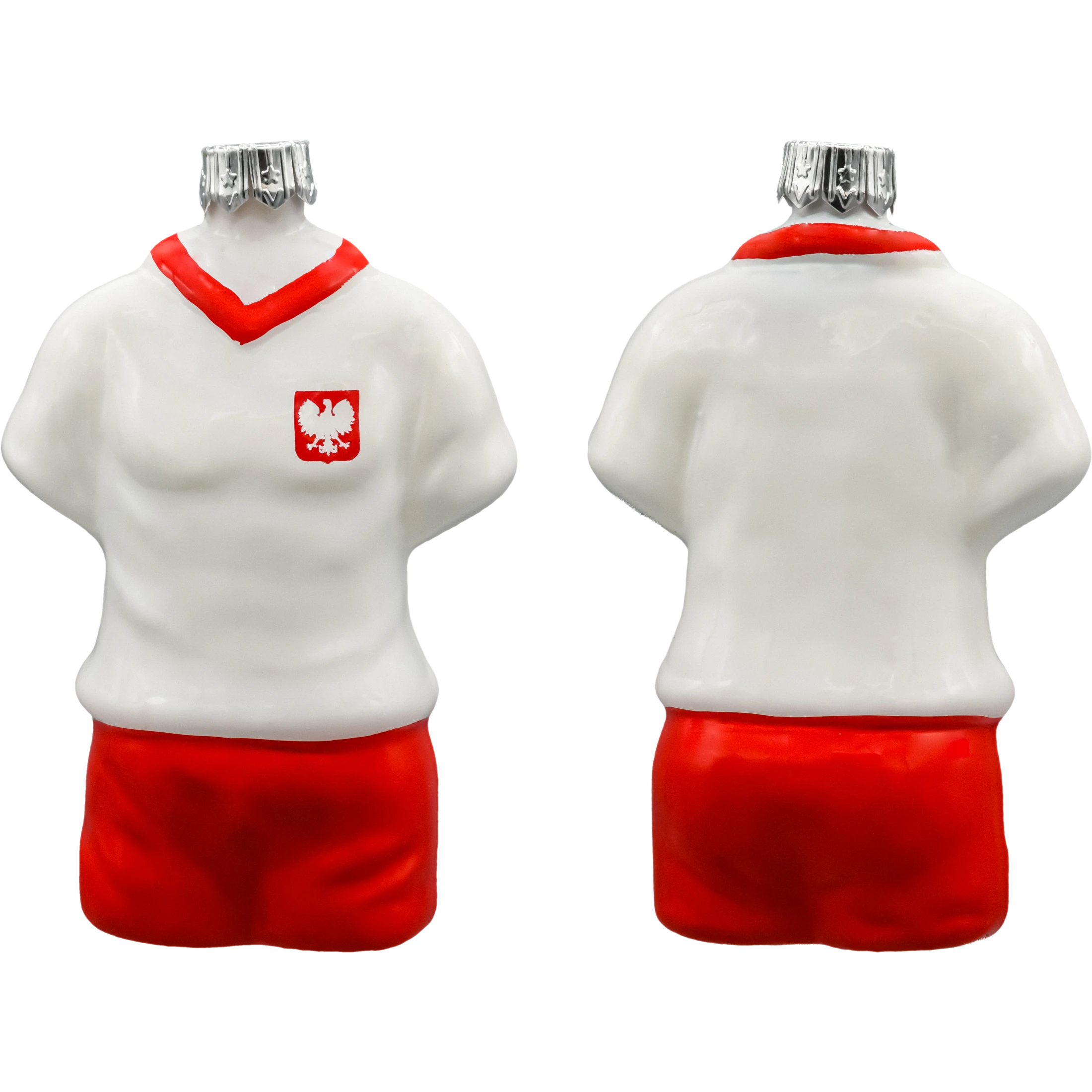 Druga bombka przedstawia biało-czerwony strój reprezentacji Polski z godłem – stylizowaną koszulkę z szortami. Została precyzyjnie uformowana i ręcznie malowana z dbałością o każdy szczegół – od konturów torsu po herb z orłem. Trójwymiarowa forma sprawia, że dekoracja wygląda jak miniaturowy trykot sportowy zawieszony na choince.