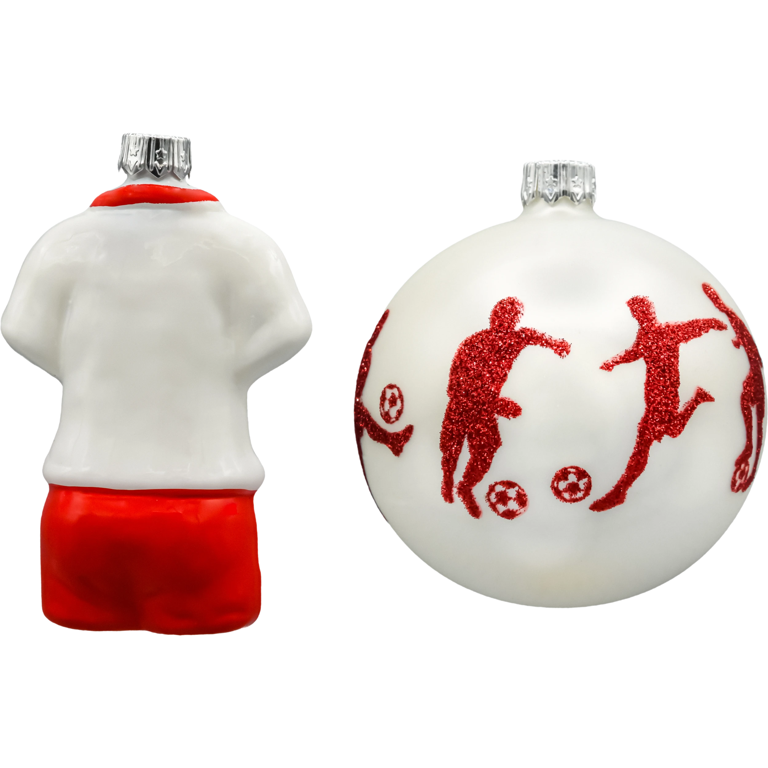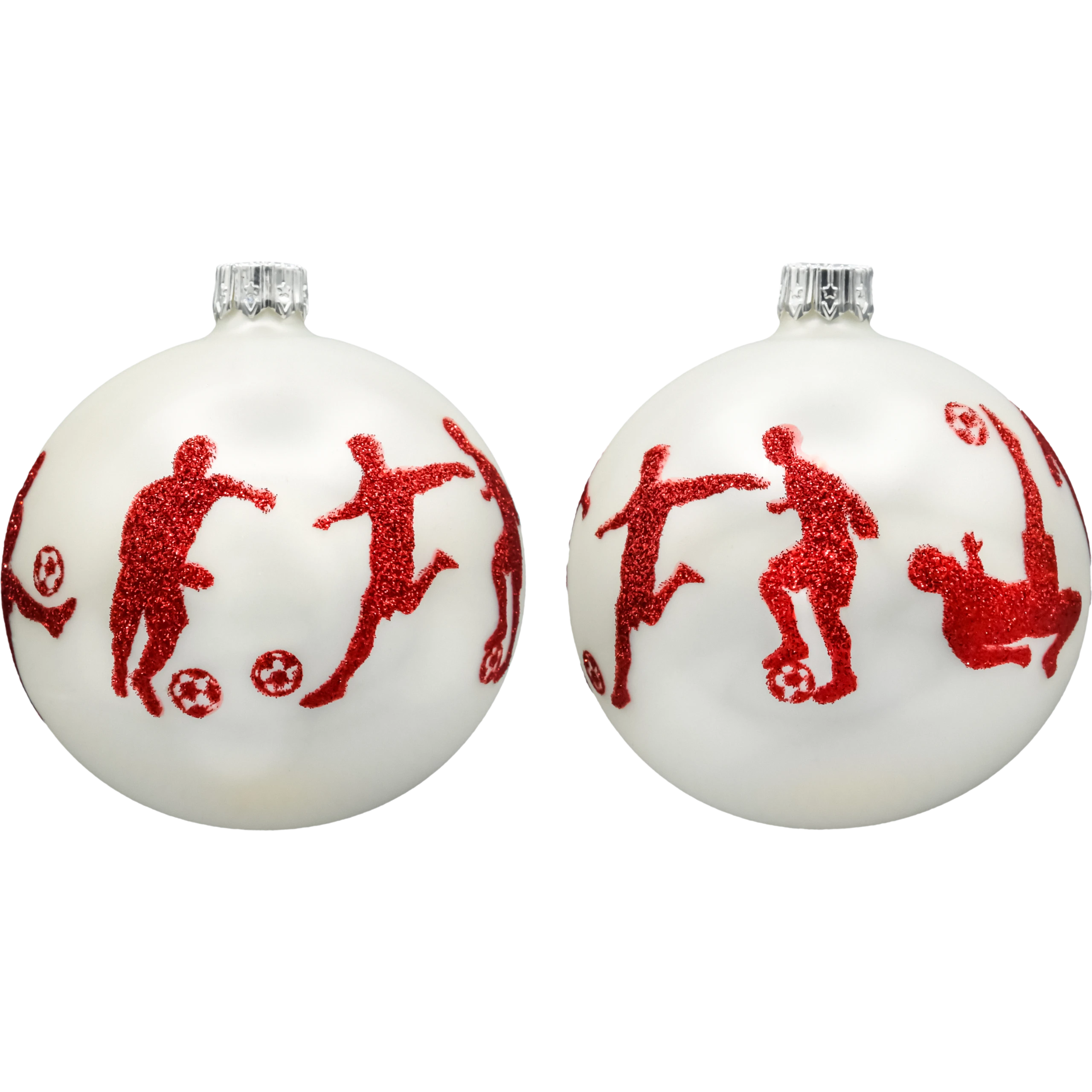 Pierwsza bombka to klasyczna kula o średnicy ok. 80 mm, ozdobiona dynamicznymi sylwetkami piłkarzy wykonanych z czerwonego brokatu. Każda postać została uchwycona w ruchu – podczas dryblingu, podania czy strzału – tworząc spójną kompozycję pełną energii i sportowych emocji. Satynowo-biała powierzchnia bombki doskonale kontrastuje z czerwonymi detalami, nawiązując do barw narodowych.
