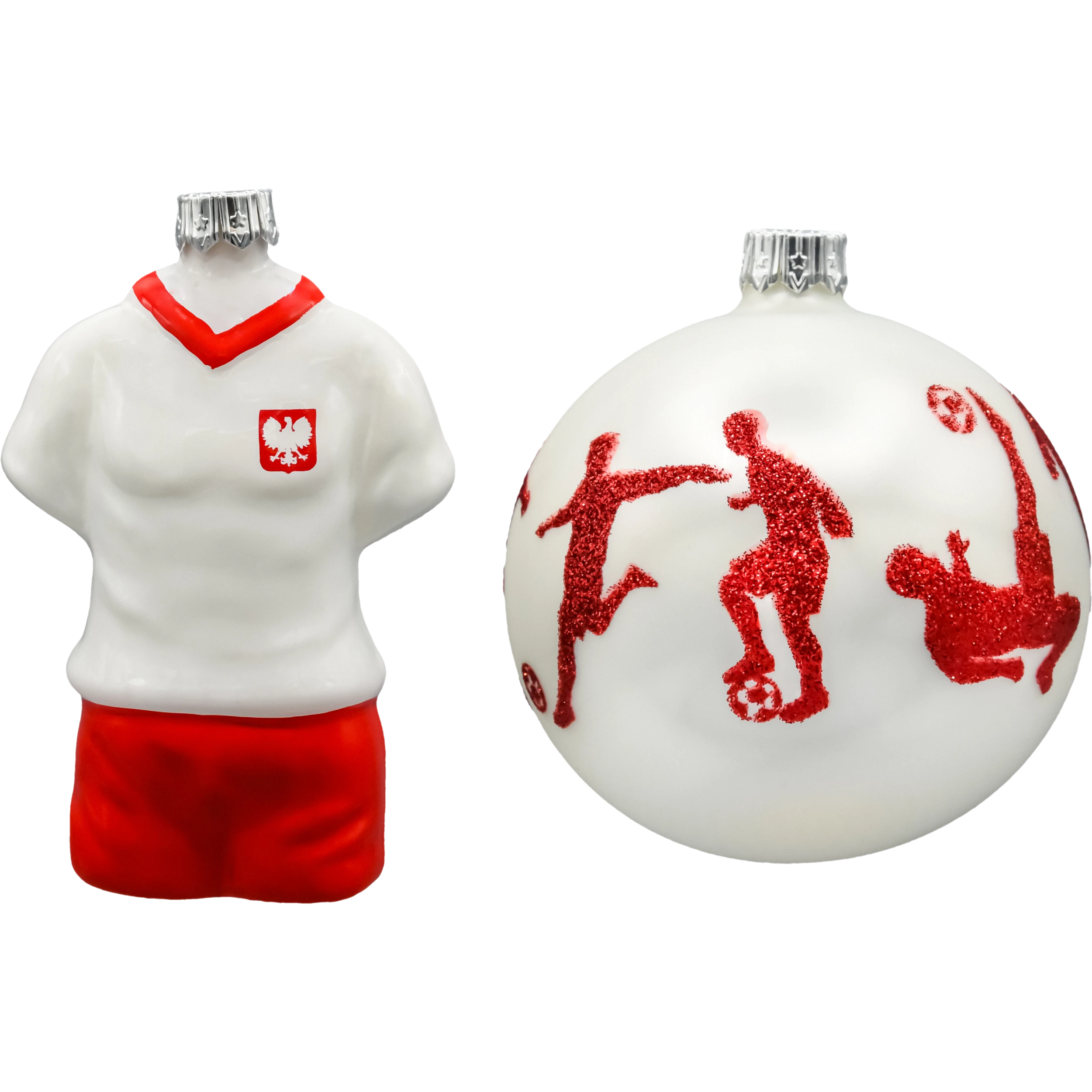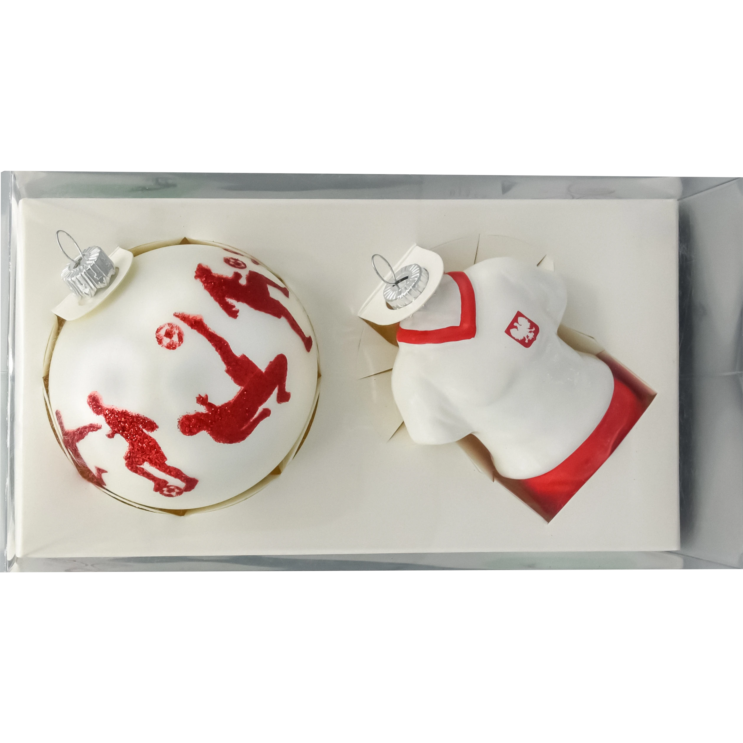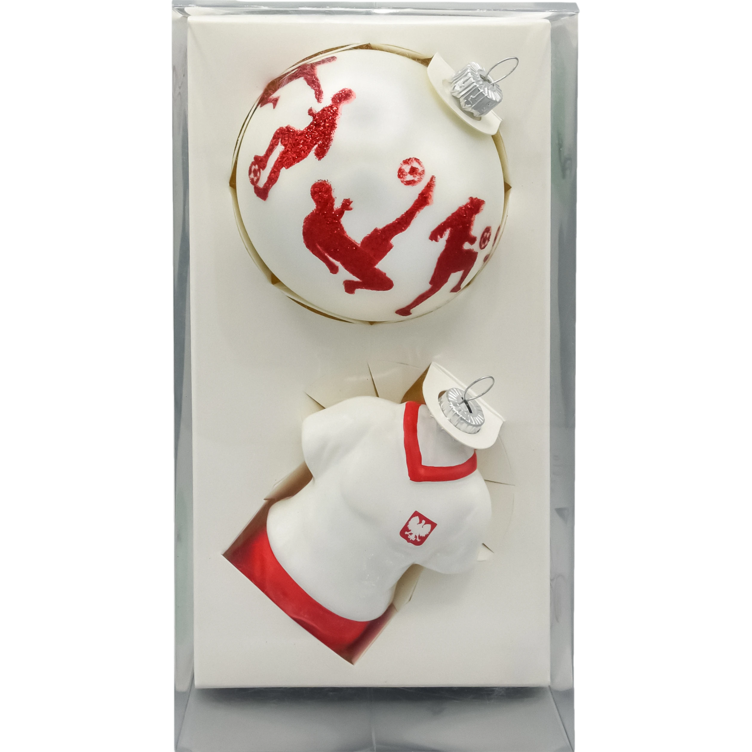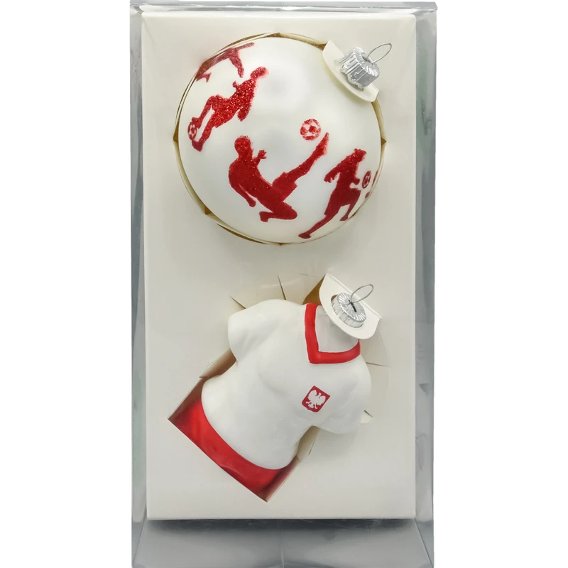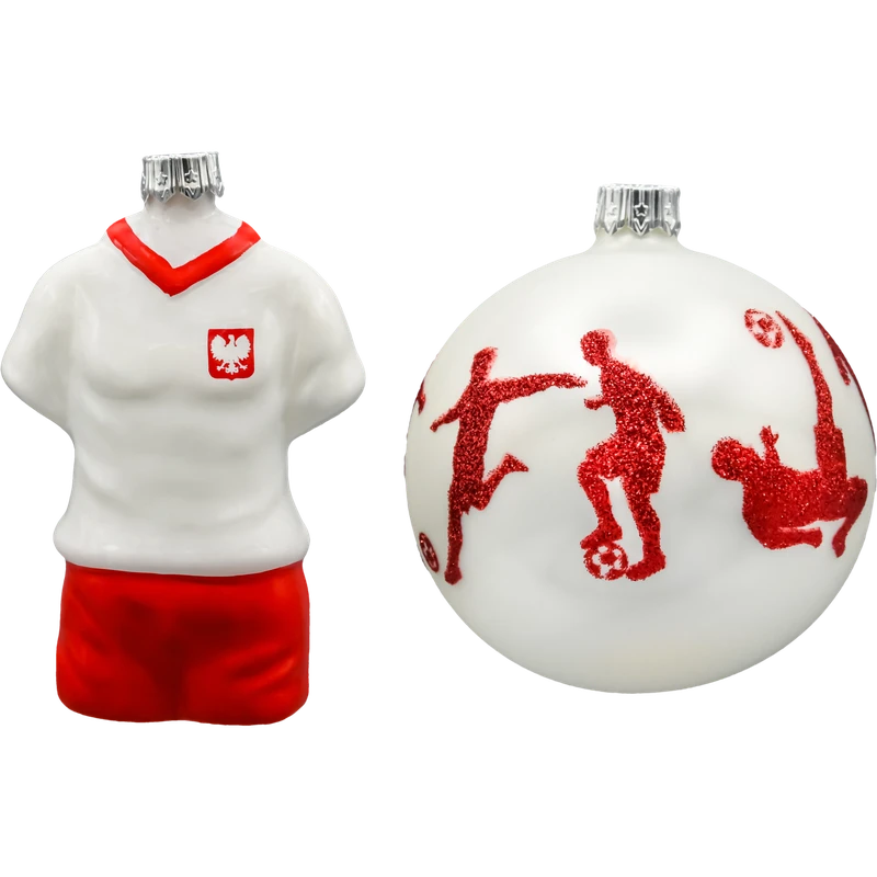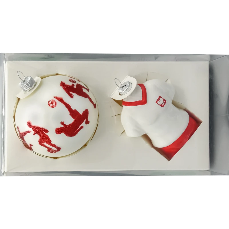 Zestaw dwóch wyjątkowych szklanych bombek choinkowych inspirowanych pasją do piłki nożnej i narodową dumą. To propozycja idealna dla kibiców reprezentacji Polski oraz miłośników oryginalnych dekoracji świątecznych z charakterem.