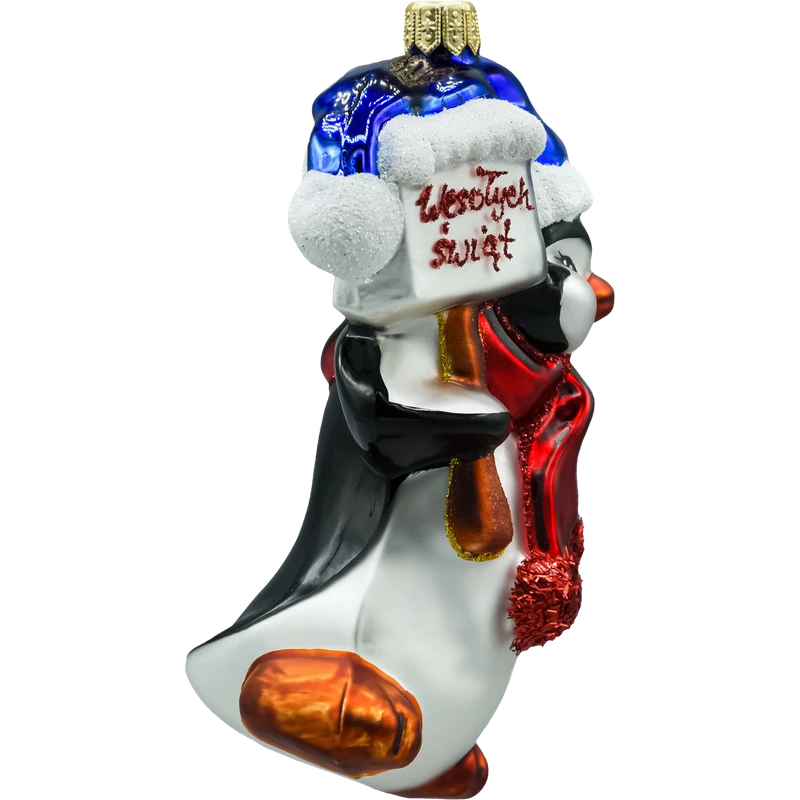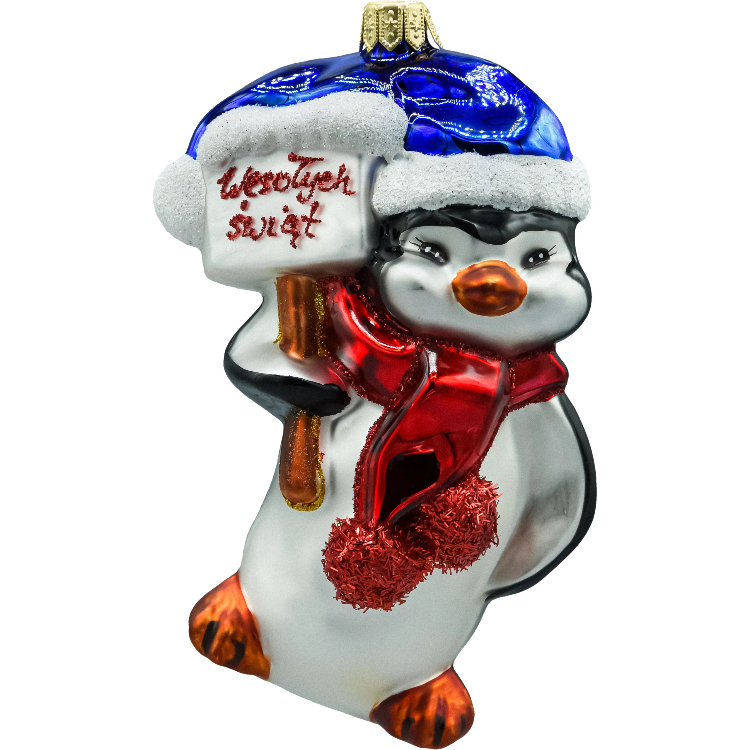 „Pingwin z tabliczką – Wesołych Świąt” to szklana, ręcznie malowana bombka choinkowa z granatową czapką, czerwonym szalikiem i brokatowym napisem. Urocza ozdoba choinkowa dla całej rodziny, która wnosi na drzewko dużo koloru i zimowego humoru.