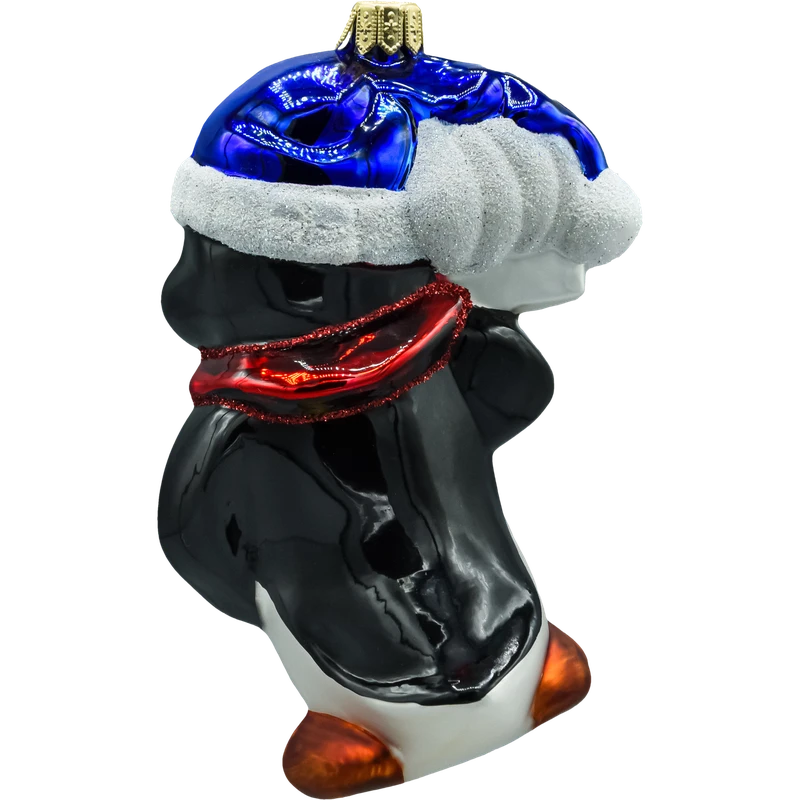 Radosny akcent prosto z lodowej krainy! Szklana bombka „Pingwin z tabliczką” przedstawia uśmiechniętego pingwinka w granatowej czapce Mikołajkowej z „śnieżnym” futerkiem oraz w błyszczącym czerwonym szaliku z puchatymi pomponami. W łapce trzyma tabliczkę z napisem „Wesołych Świąt” wykreślonym czerwonym brokatem. Lustrzane lakiery, perłowe biele i iskrzące wykończenia sprawiają, że figurka pięknie odbija światło lampek i od razu przyciąga wzrok na choince.