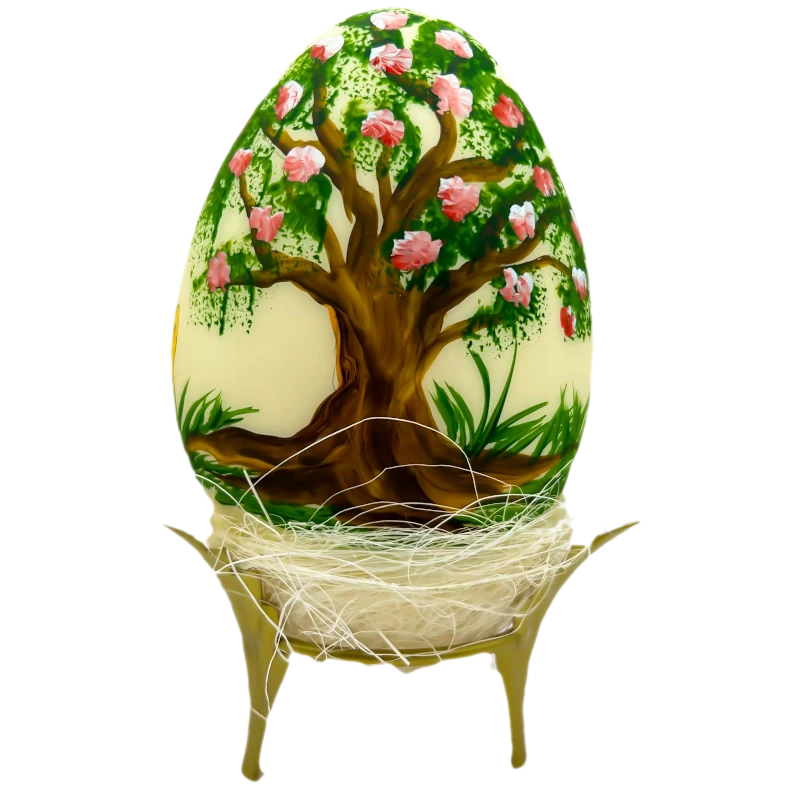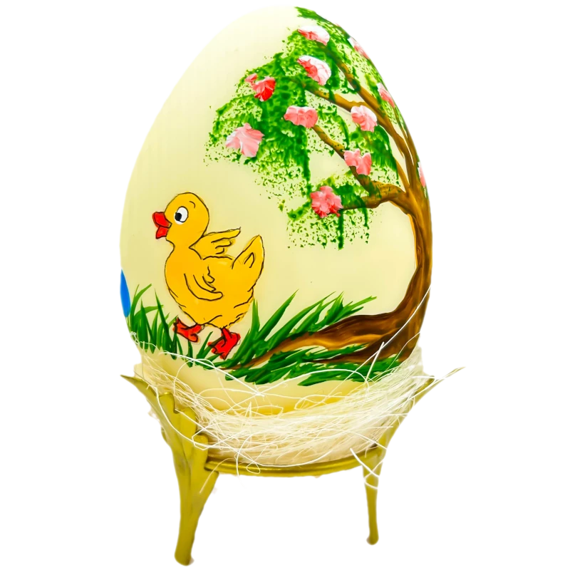Kremowa ozdoba w kształcie wielkanocnej pisanki. Przedstawia uroczą kaczuszkę na tle pięknego drzewka z różowymi kwiatami.