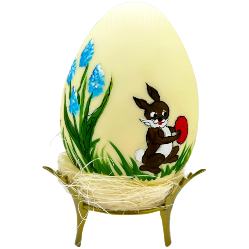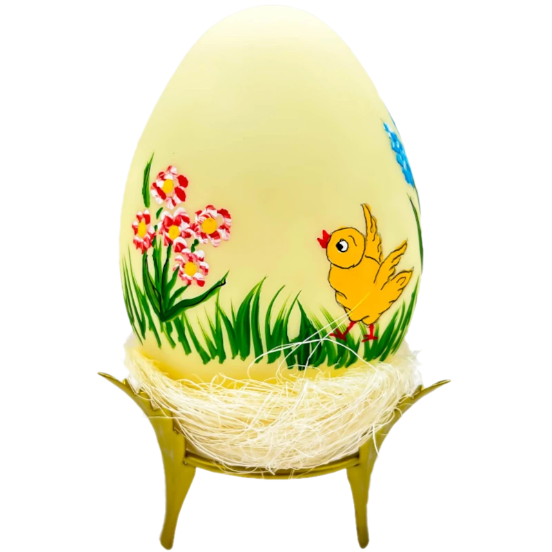 Kremowa ozdoba w kształcie wielkanocnej pisanki. Przedstawia uroczą kaczuszkę pędzącą w stronę żonkili wraz z zajączkiem wielkanocnym trzymającym czerwoną pisankę.