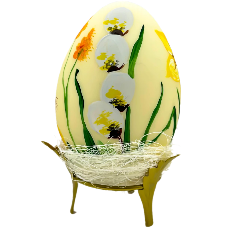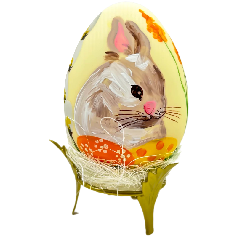 Kremowa ozdoba w kształcie wielkanocnej pisanki. Przedstawia zajączka pilnującego swoich święconych jajek wielkanocnych na tle pełnym kwiatów.