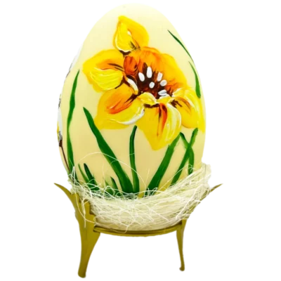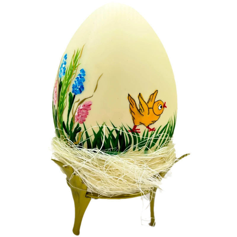 Kremowa ozdoba w kształcie wielkanocnej pisanki. Przedstawia małą kaczuszkę pędzącą w stronę zajączka wielkanocnego na tle pięknych i kolorowych kwiatów.