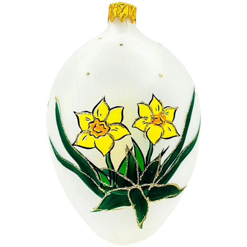 Bombka wielkanocna przedstawiająca pisklątko w towarzystwie ogromnej pisanki. Nasze maleństwo dumnie balansuje na powierzchni złotego jajka wielkanocnego. Druga strona szklanej ozdoby przedstawia symbol wiosny – żonkile.