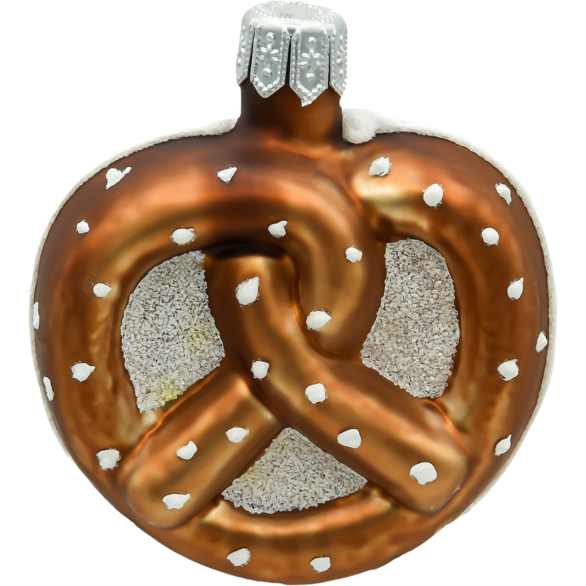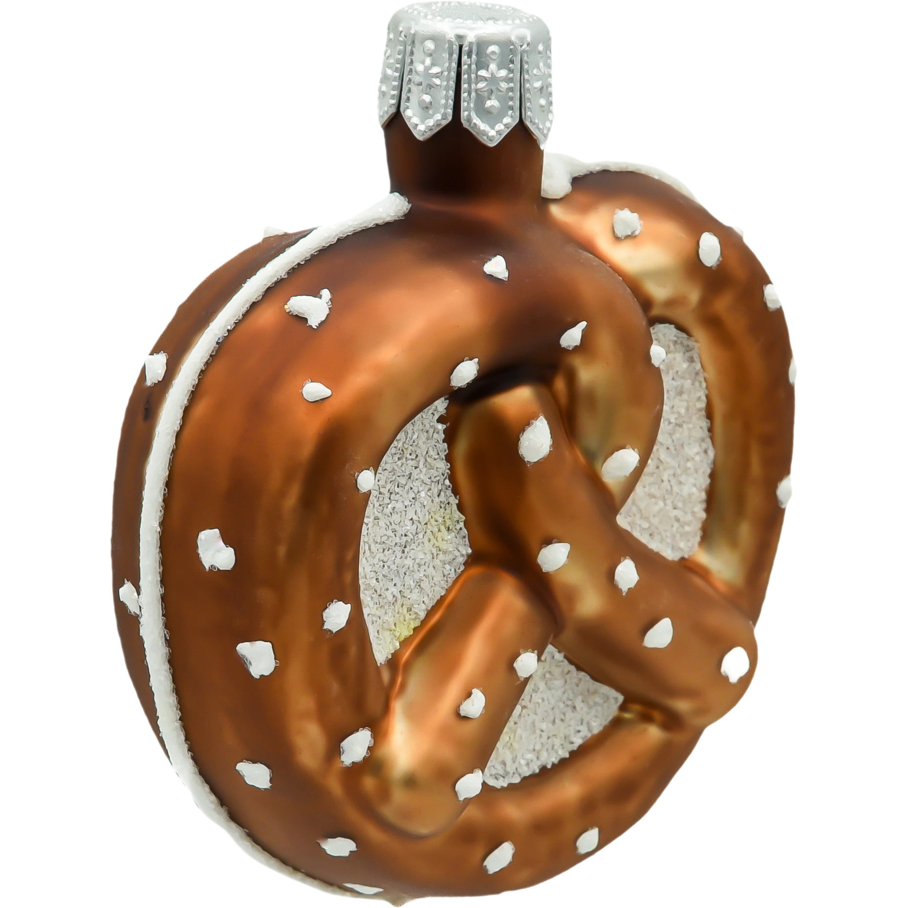 Szklana bombka choinkowa w kształcie precla z efektem soli. Ręcznie malowana ozdoba świąteczna o realistycznym wyglądzie – idealna dla fanów kuchni i nietuzinkowych dekoracji.