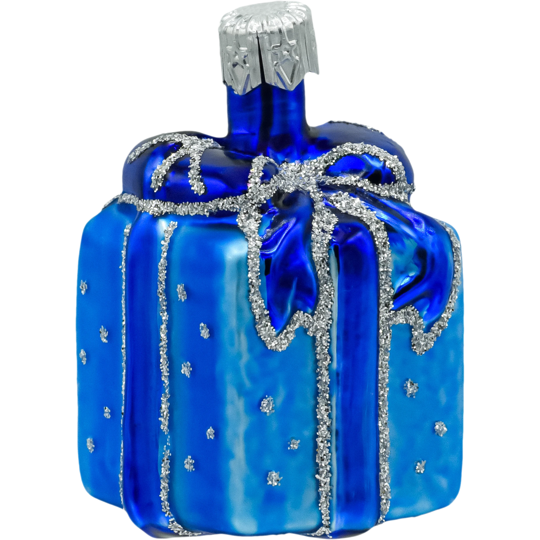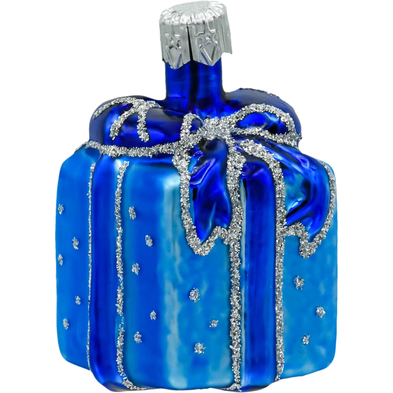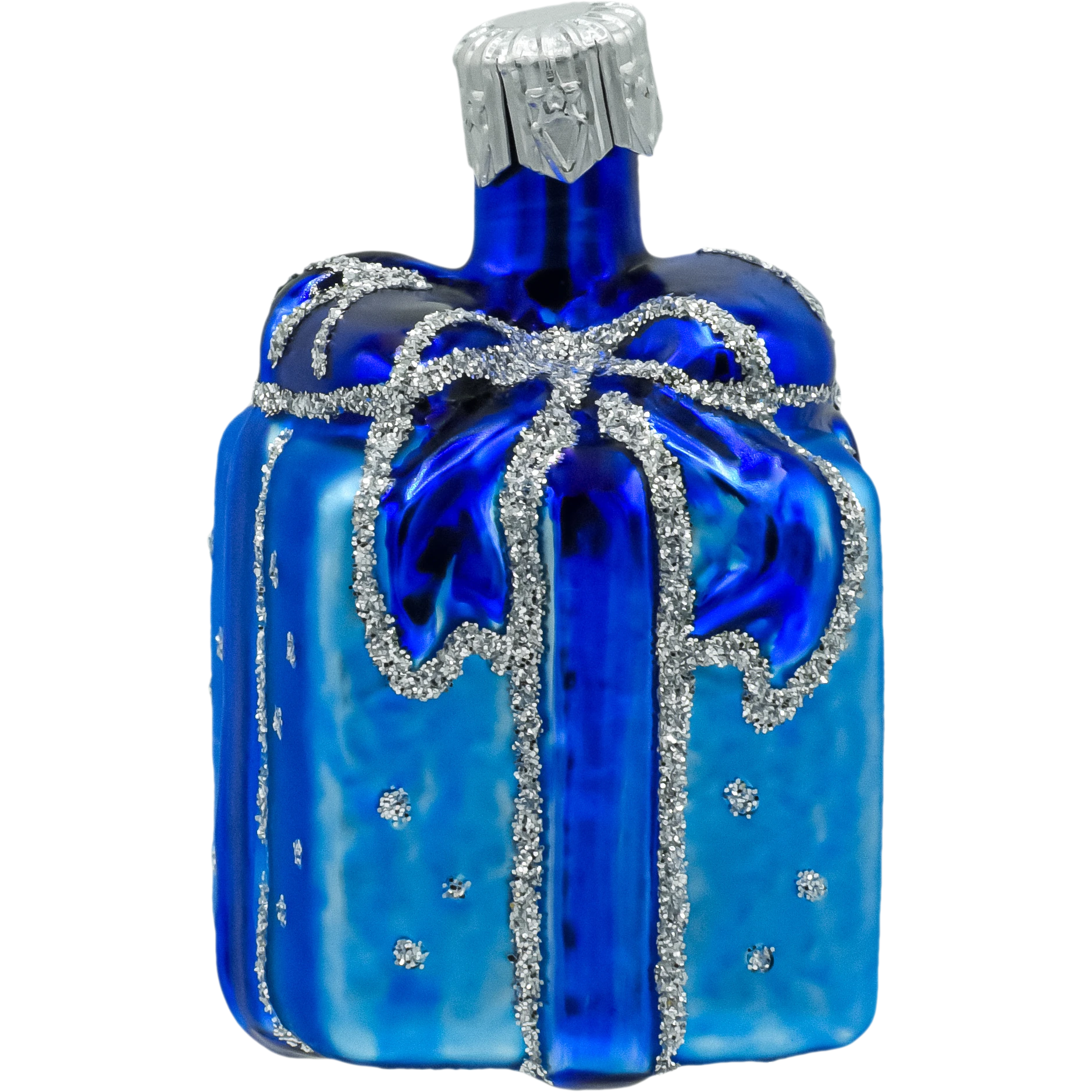 Szklana bombka choinkowa prezent w kolorze niebieskim z brokatową kokardą. Elegancka ozdoba świąteczna, idealna do nowoczesnych i klasycznych dekoracji bożonarodzeniowych