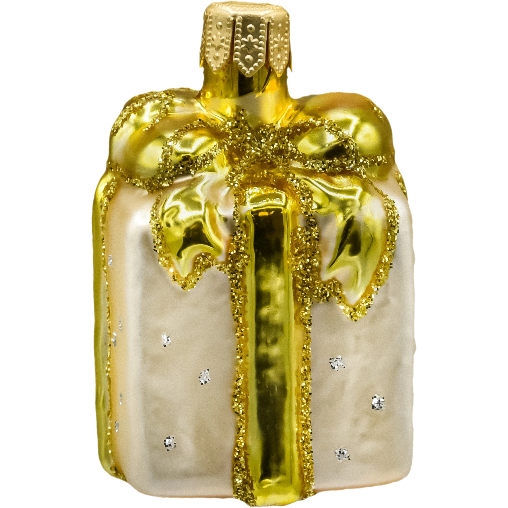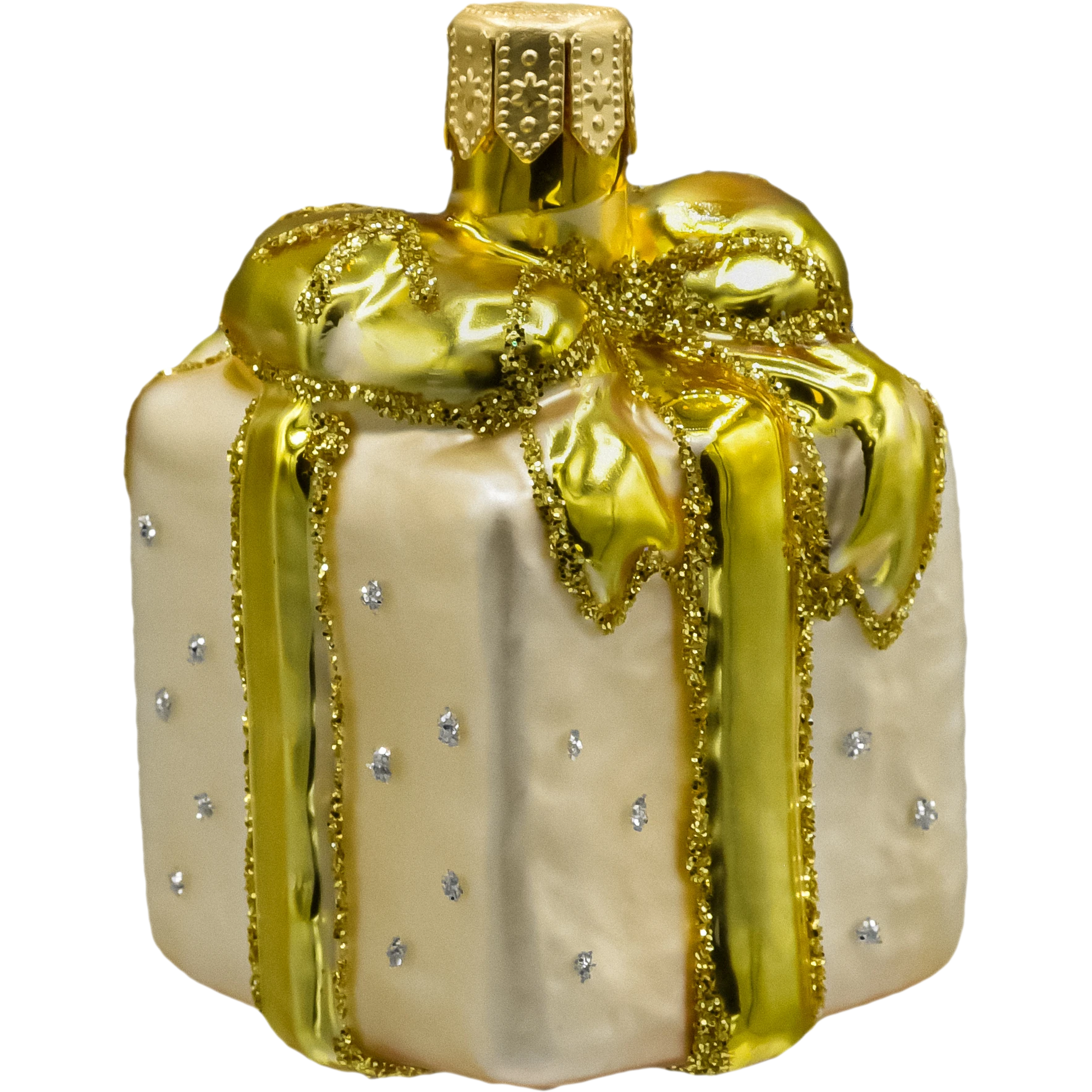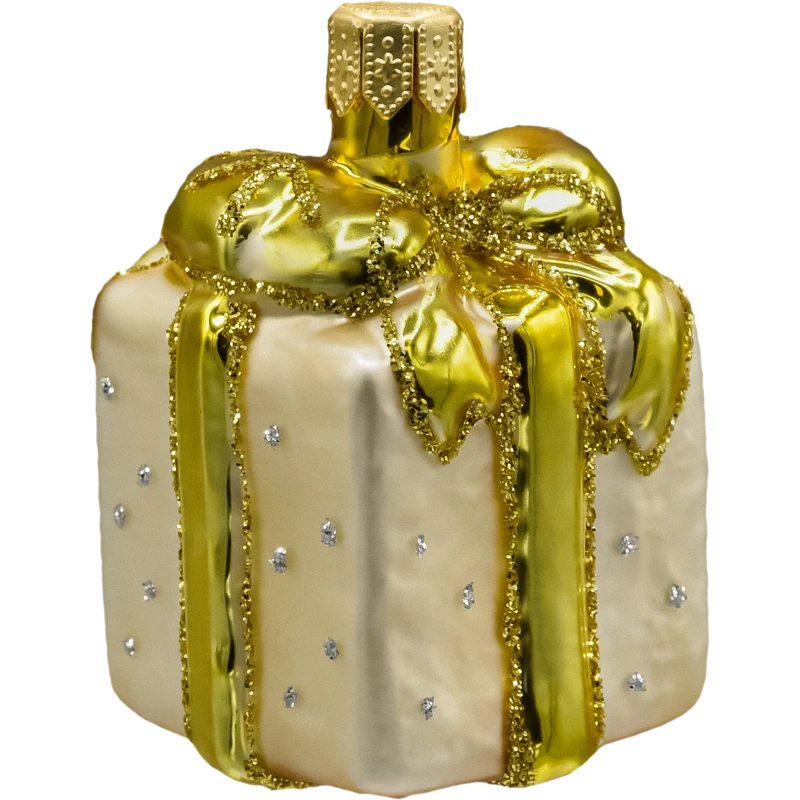 Ekskluzywna szklana bombka choinkowa w kształcie prezentu z perłowym lakierem i złotą kokardą. Ręcznie zdobiona, elegancka ozdoba świąteczna – idealna do klasycznych i glamour aranżacji.