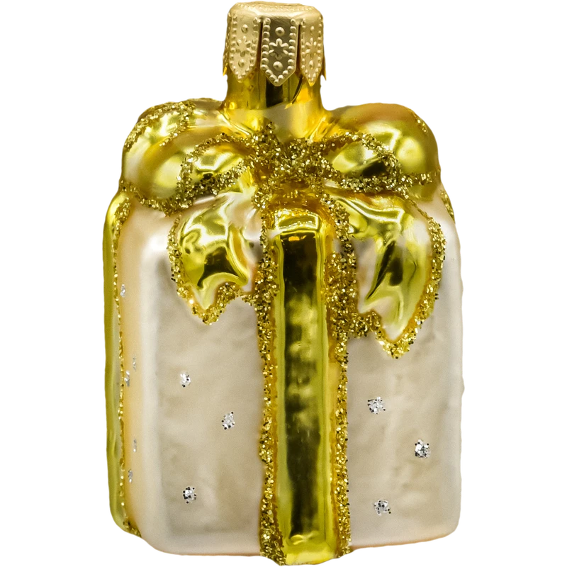 Szklana bombka choinkowa Prezent w złocie i perle – ręcznie zdobiona ozdoba świąteczna