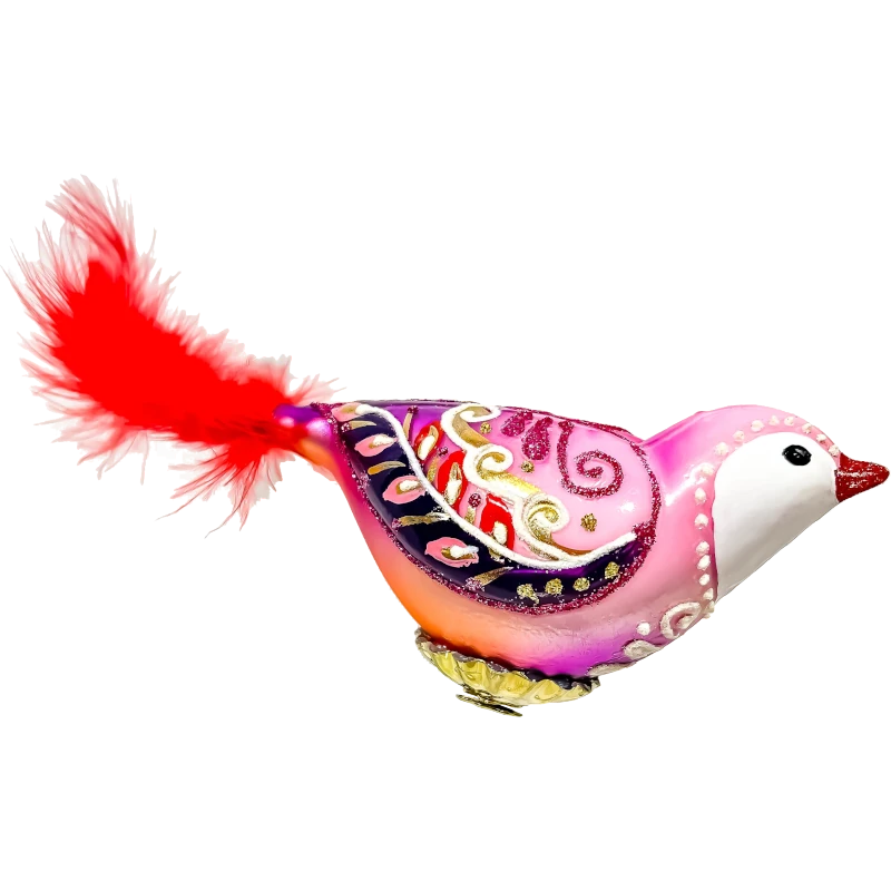 Bombka „Różowy ptaszek z piórkiem” to wyjątkowa ozdoba, która ożywi każdą choinkę. Ręcznie malowana, wykonana z najwyższej jakości szkła i ozdobiona delikatnymi piórkami, ta bombka zachwyca bogactwem kolorów i precyzją detali. Dzięki intensywnym odcieniom różu, pomarańczu i fioletu, a także brokatowym zdobieniom i eleganckiemu czerwono-pomarańczowemu ogonowi z piór, bombka emanuje radością i artystycznym stylem. To idealna dekoracja dla osób, które chcą wprowadzić na swoją choinkę nutę fantazji i kreatywności.
