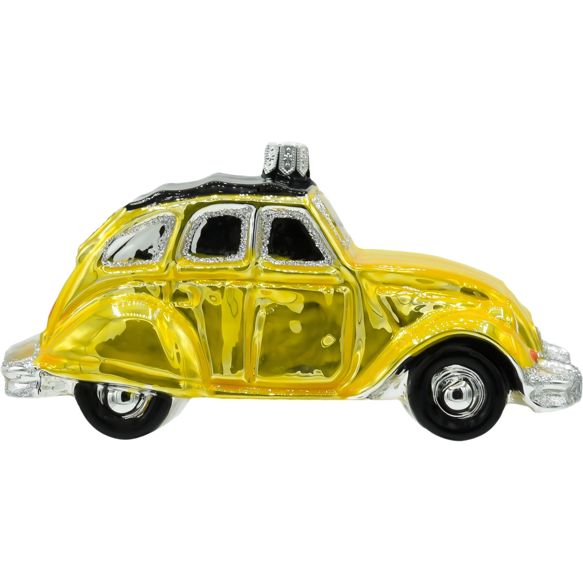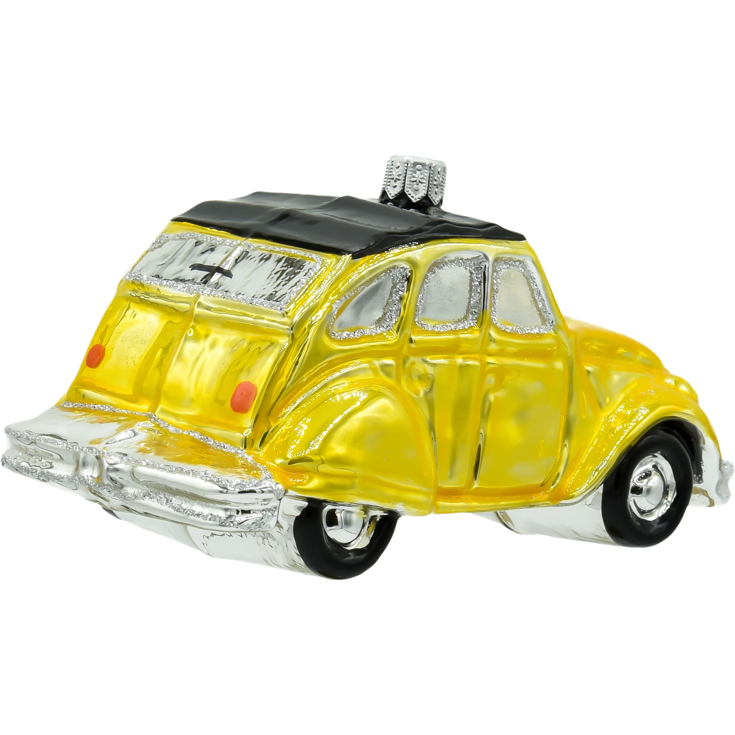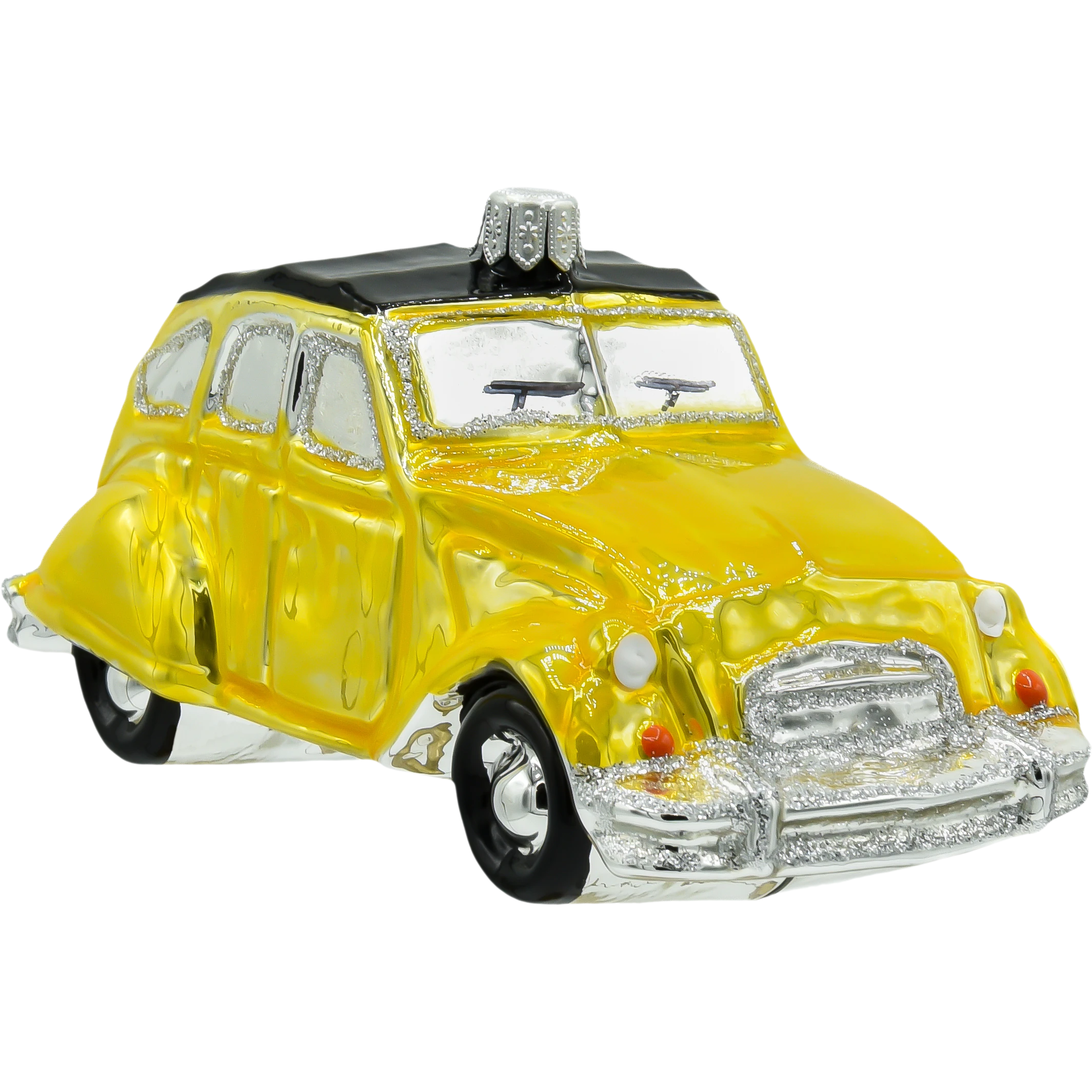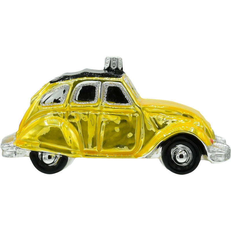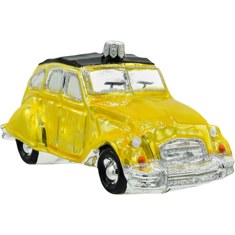 Szklana bombka w kształcie żółtego Citroëna 2CV to niezwykle urokliwa ozdoba choinkowa, która przenosi nas prosto na francuskie drogi lat 60. i 70. Ręcznie malowana z dbałością o detale, lśni ciepłym odcieniem żółci, uzupełnionym srebrzystymi akcentami i subtelnym brokatem. Charakterystyczny kształt nadwozia z pofalowaną maską i czarnym dachem od razu przywołuje wspomnienie kultowego modelu, który zyskał miano „ludowego auta Francji”.