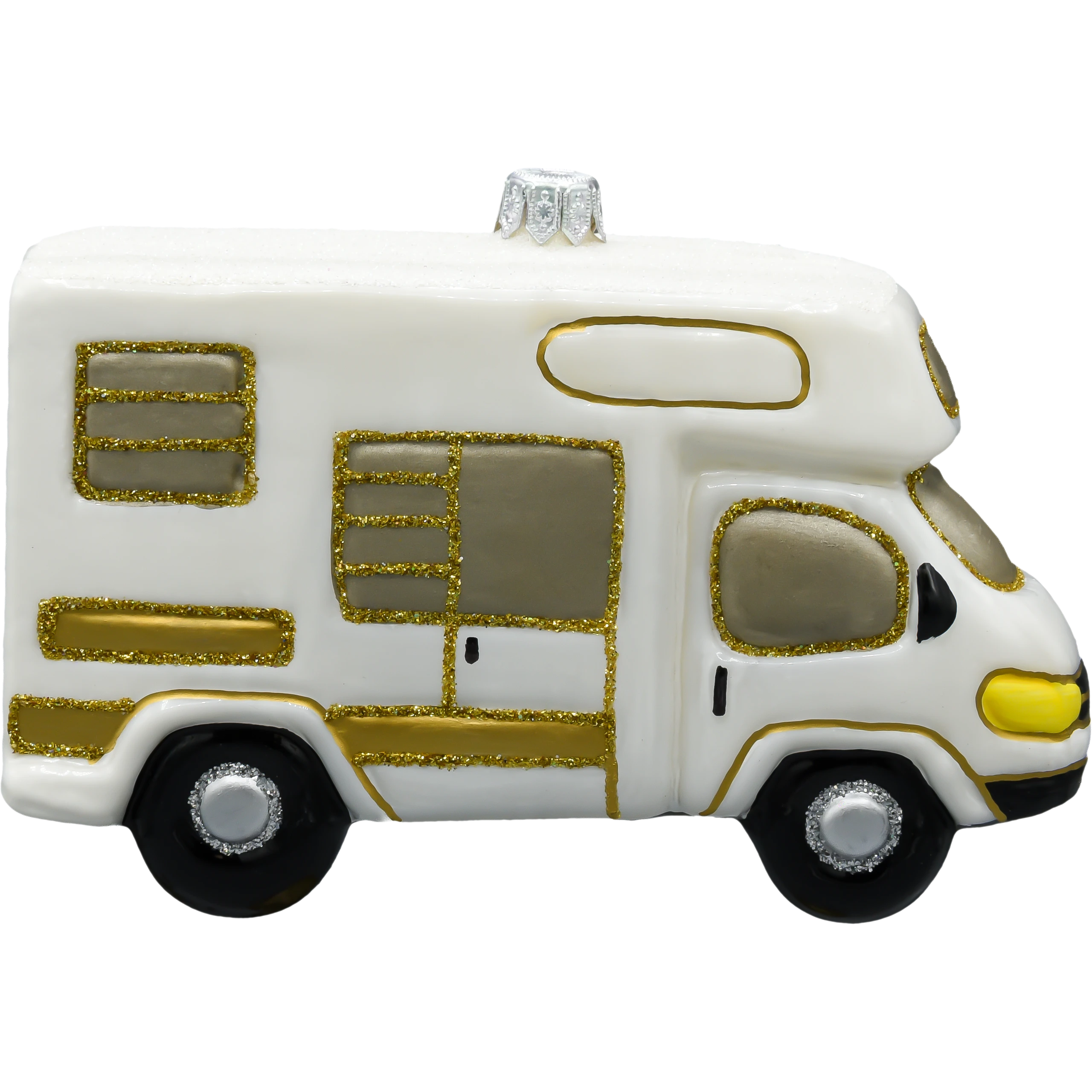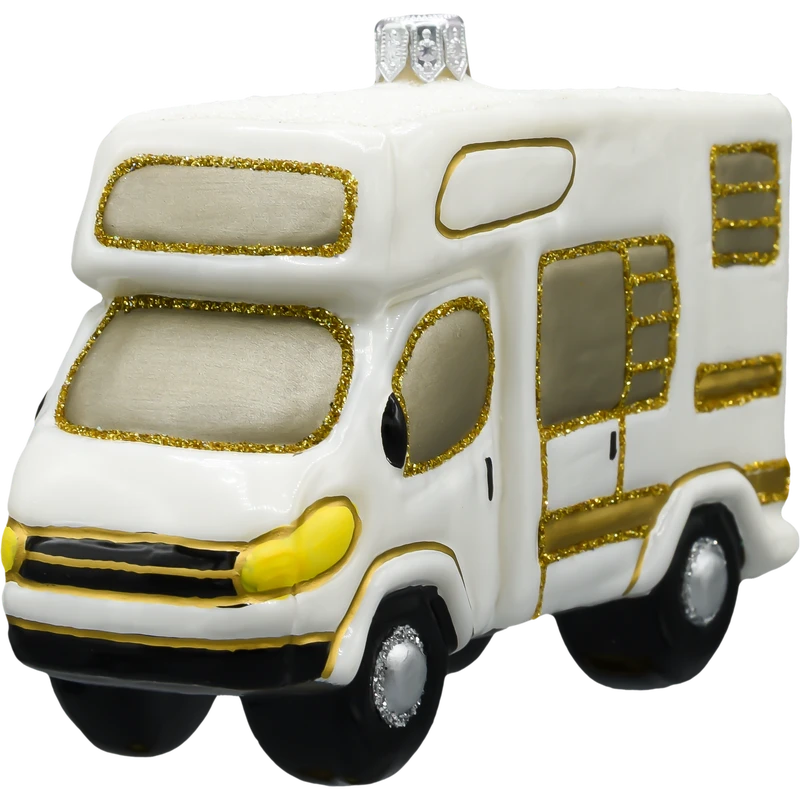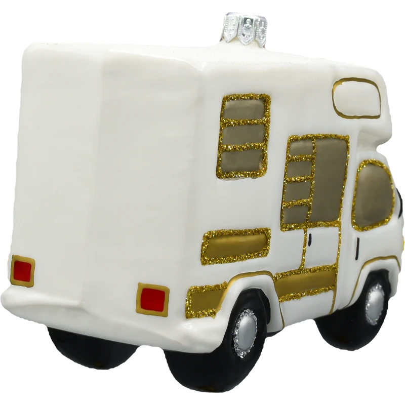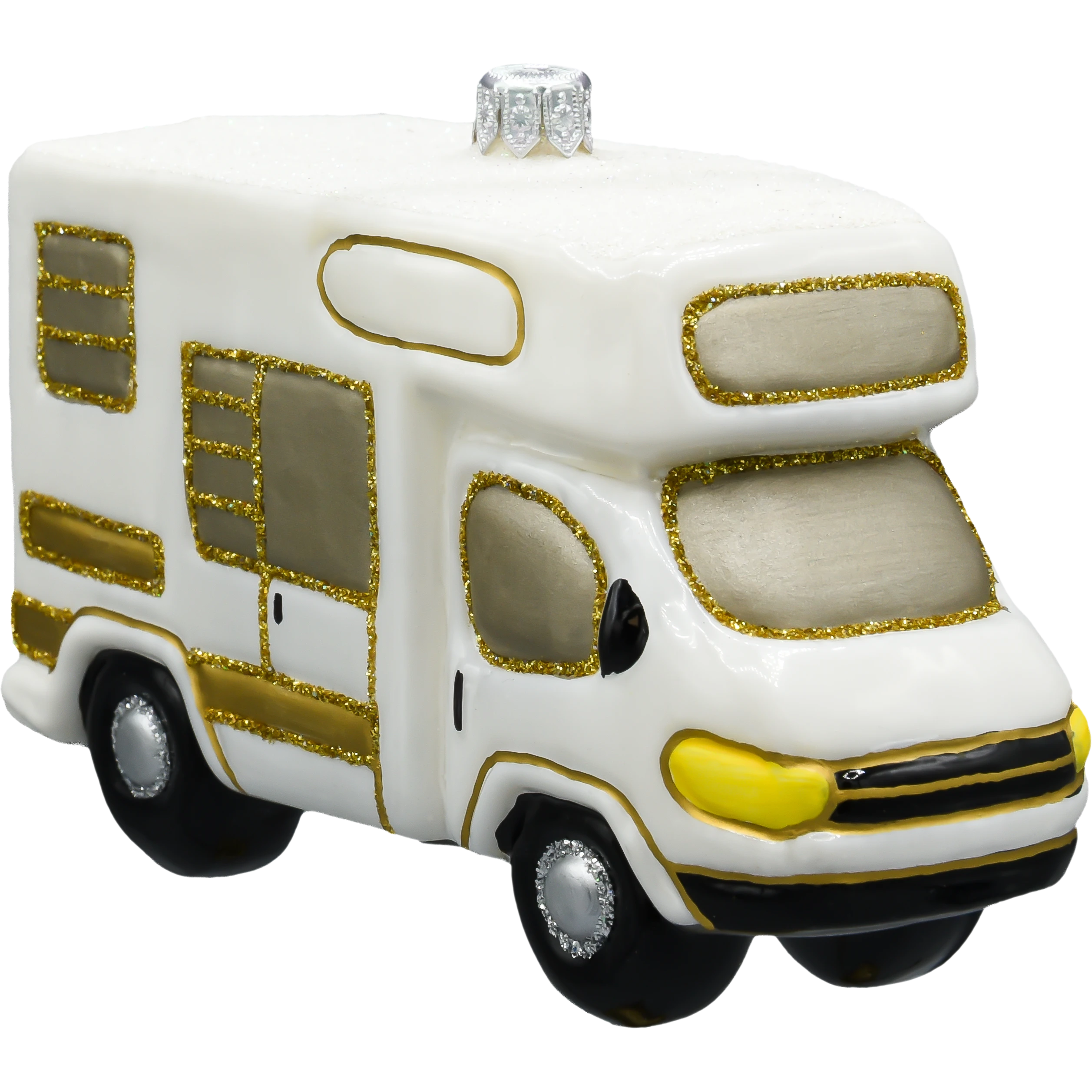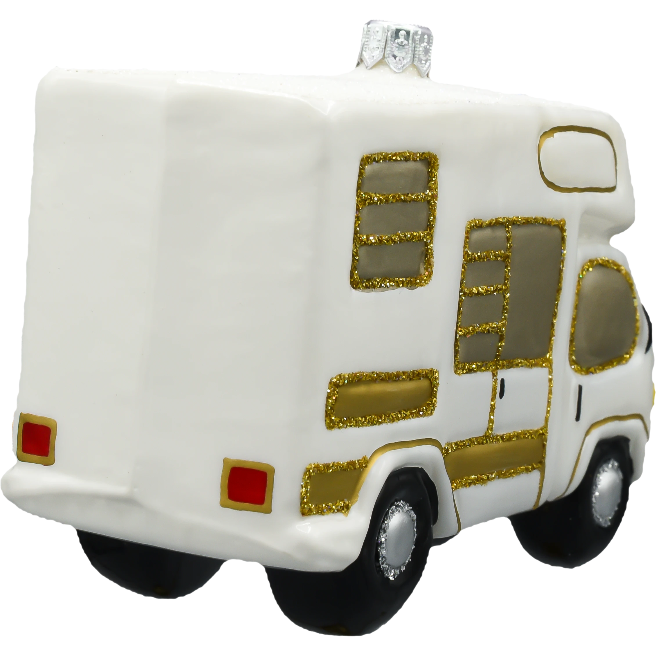 Bombka „Kamper” została wykonana ręcznie przez doświadczonych rzemieślników, co nadaje jej unikalnego charakteru i sprawia, że każda sztuka jest jedyna w swoim rodzaju. Stonowana, elegancka biel kampera kontrastuje z delikatnymi złotymi detalami, które podkreślają kształt pojazdu i dodają mu świątecznego blasku. Błyszczące okna, precyzyjnie pomalowane reflektory i drobne akcenty, takie jak klamki i linie podziału na karoserii, dodają bombce charakterystycznego wyglądu, który doskonale komponuje się z innymi ozdobami na choince.