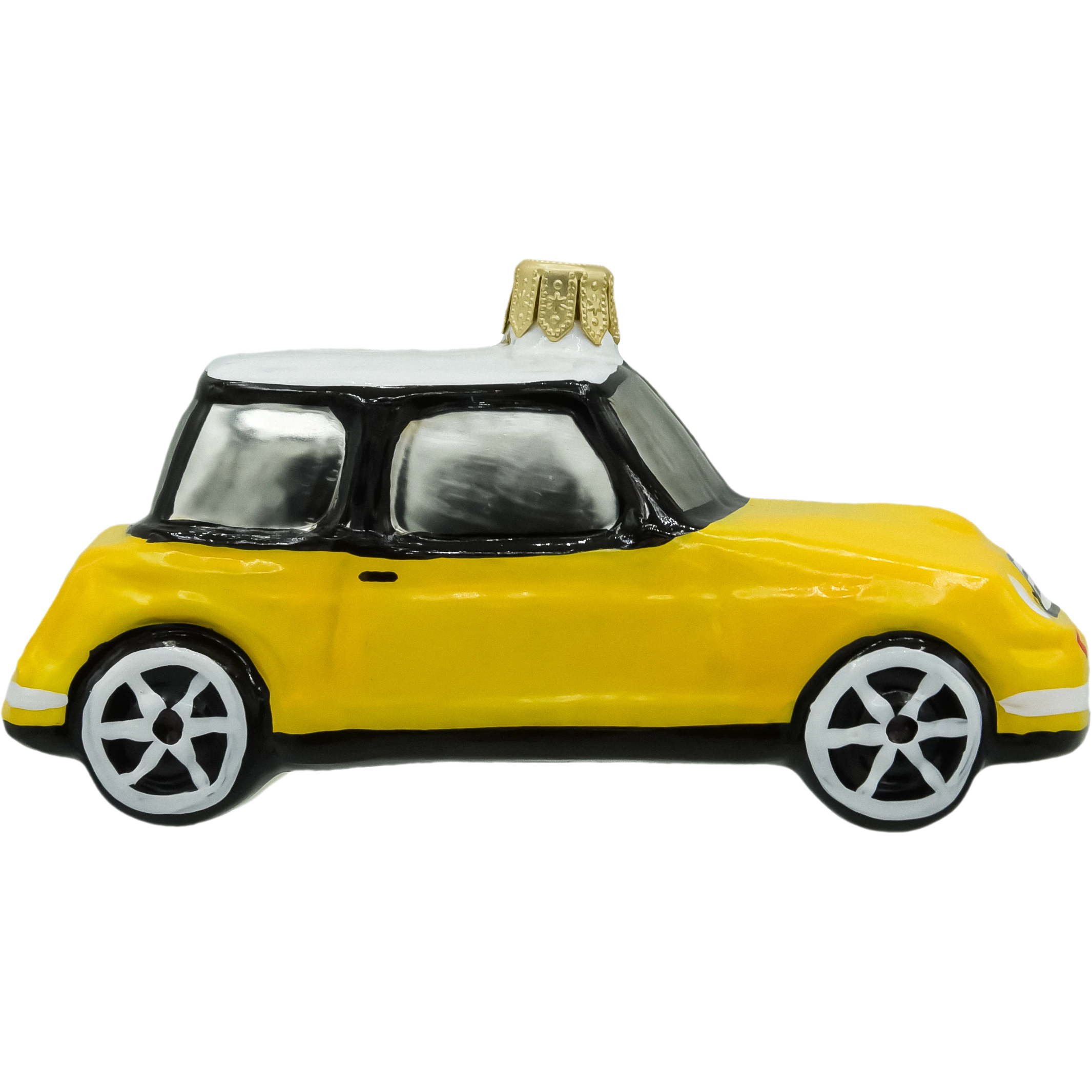 Szklana bombka choinkowa w kształcie żółtego Mini Coopera / Morrisa – ręcznie malowana ozdoba świąteczna z dmuchanego szkła. Oryginalny pomysł na prezent dla fanów motoryzacji. Elegancka i nowoczesna dekoracja na choinkę.