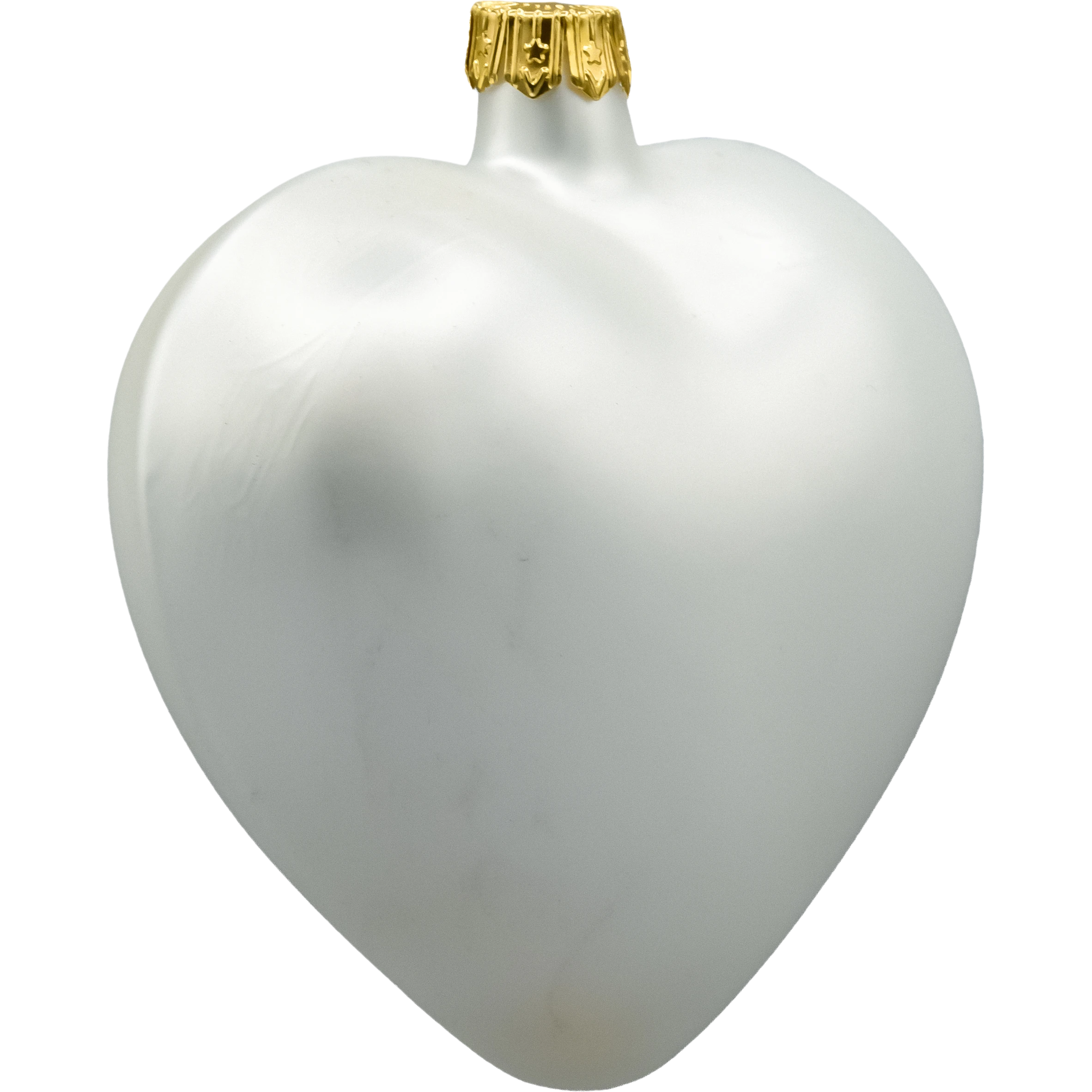 Szklana bombka serce w matowej bieli z eleganckim złotym kapturkiem. Subtelna ozdoba choinkowa w klasycznym stylu – idealna na święta.