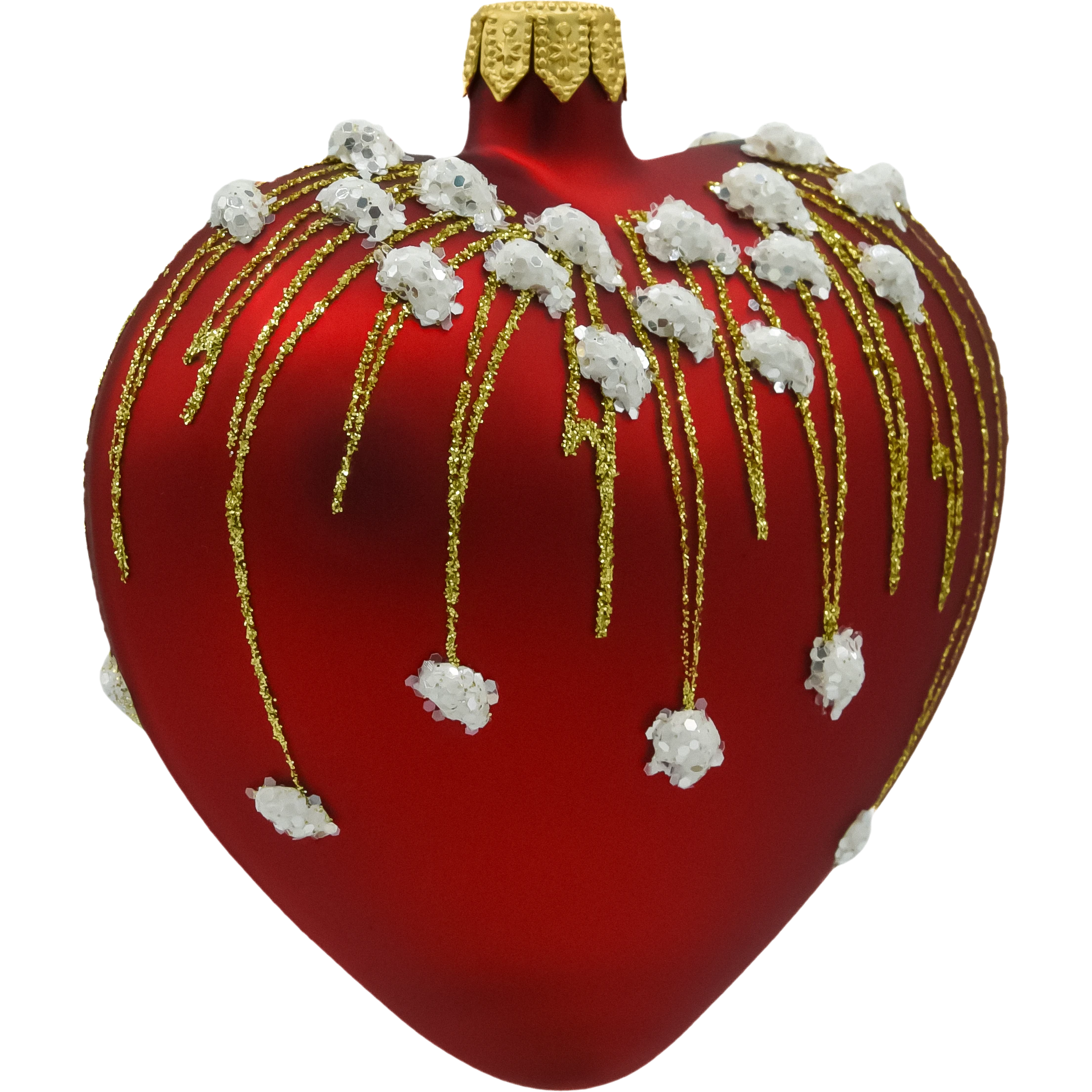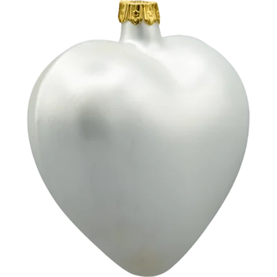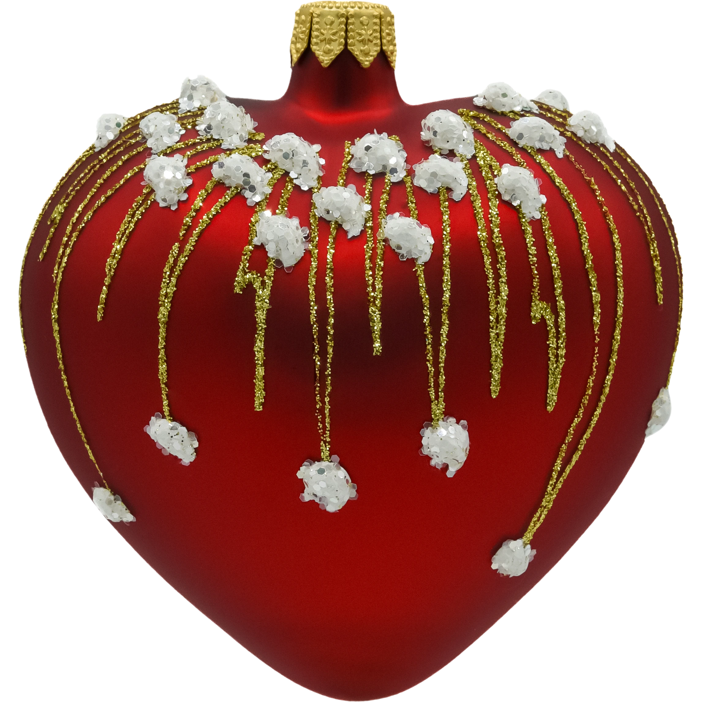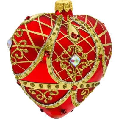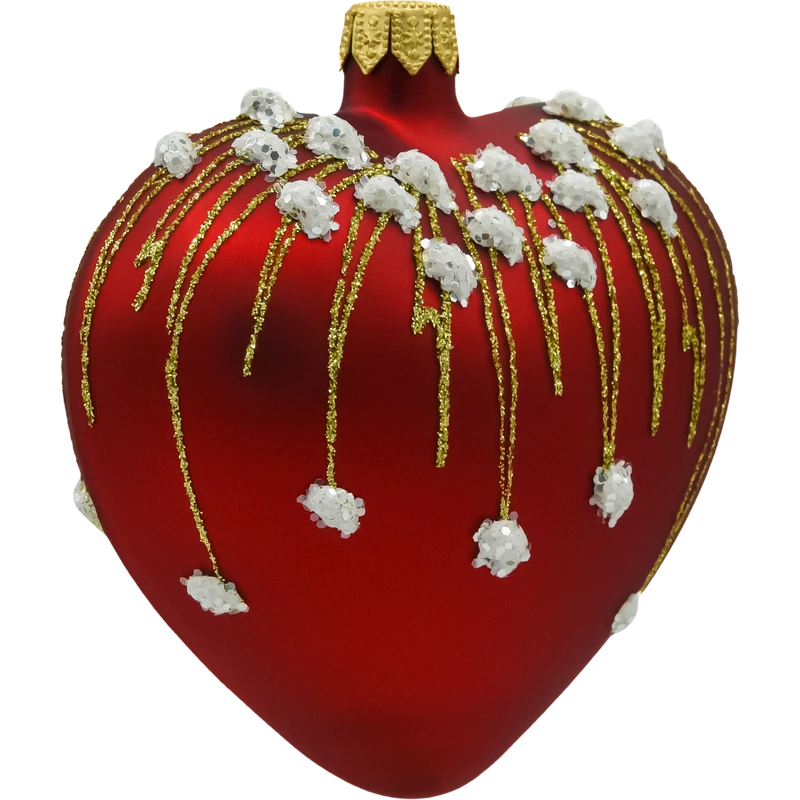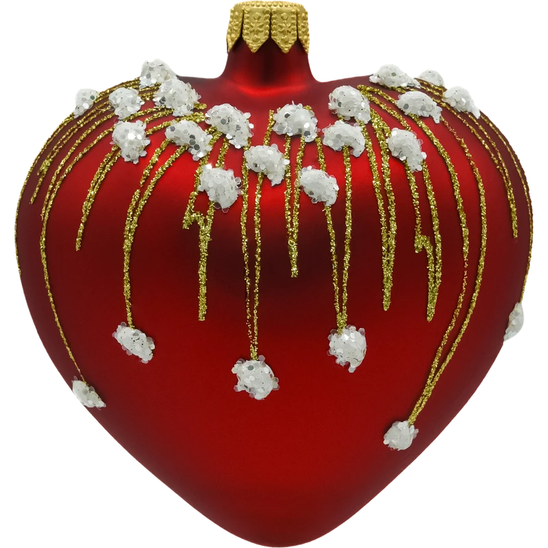 Szklana bombka w kształcie serca w intensywnym, matowym odcieniu czerwieni to prawdziwa perełka wśród świątecznych ozdób. Zdobiona złotymi strużkami brokatu i wypukłymi, białymi koralikami przypominającymi śnieżne płatki, emanuje elegancją i świątecznym ciepłem.