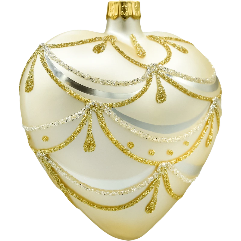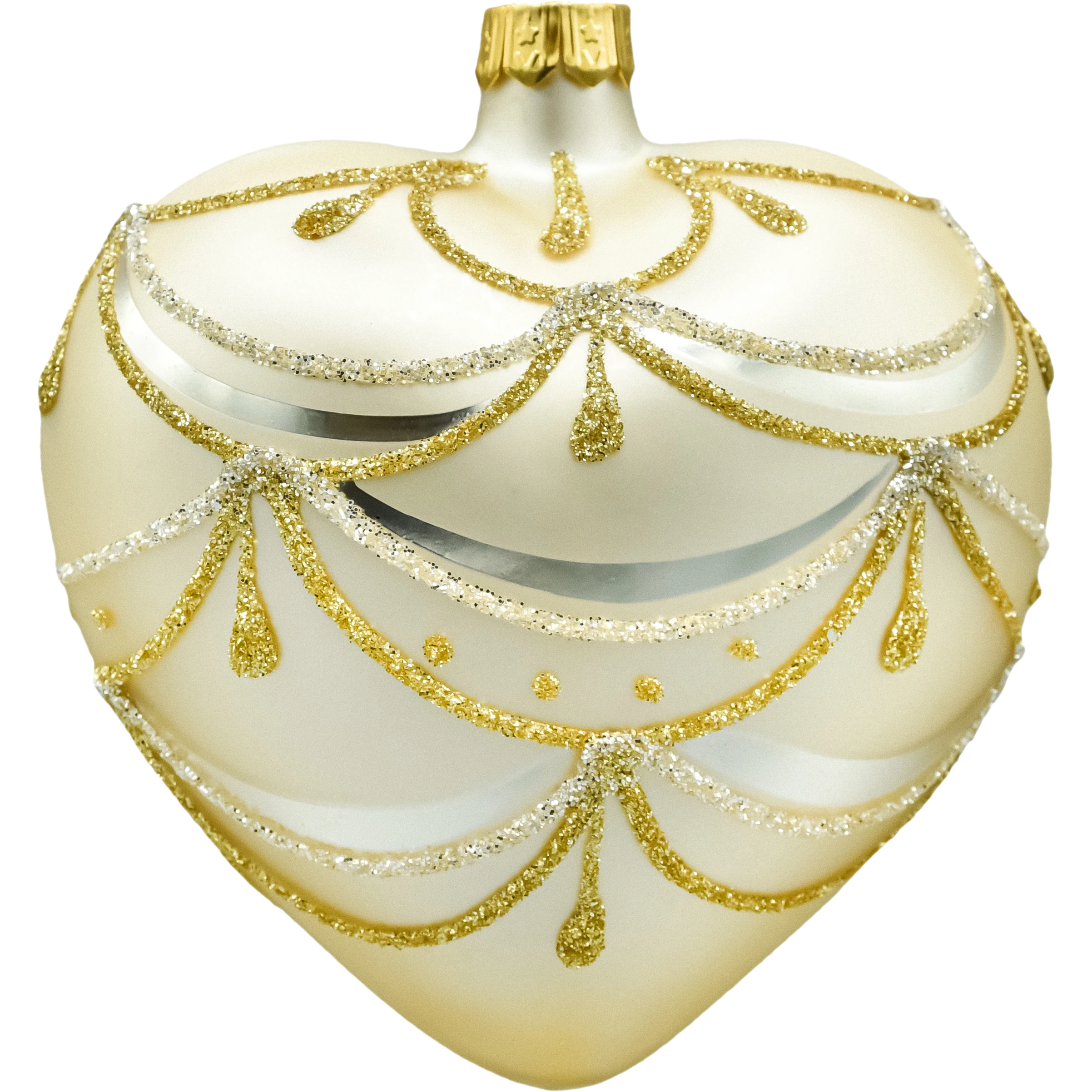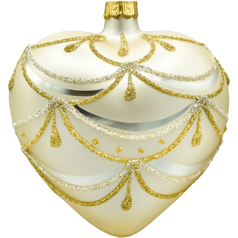 Ręcznie dmuchane i ręcznie malowane serce z delikatnym, satynowym wykończeniem w kolorze kości słoniowej zdobi misterny rysunek girland wykonanych złotym i srebrnym brokatem. Płynne łuki, drobne kropki oraz lustrzane wstawki pięknie odbijają światło lampek – bombka mieni się z każdego kąta i nadaje choince szyk w stylu glamour. To ponadczasowa szklana bombka choinkowa o biżuteryjnym charakterze, idealna zarówno do klasycznych aranżacji w złocie i bieli, jak i do nowoczesnych, minimalistycznych wystrojów.