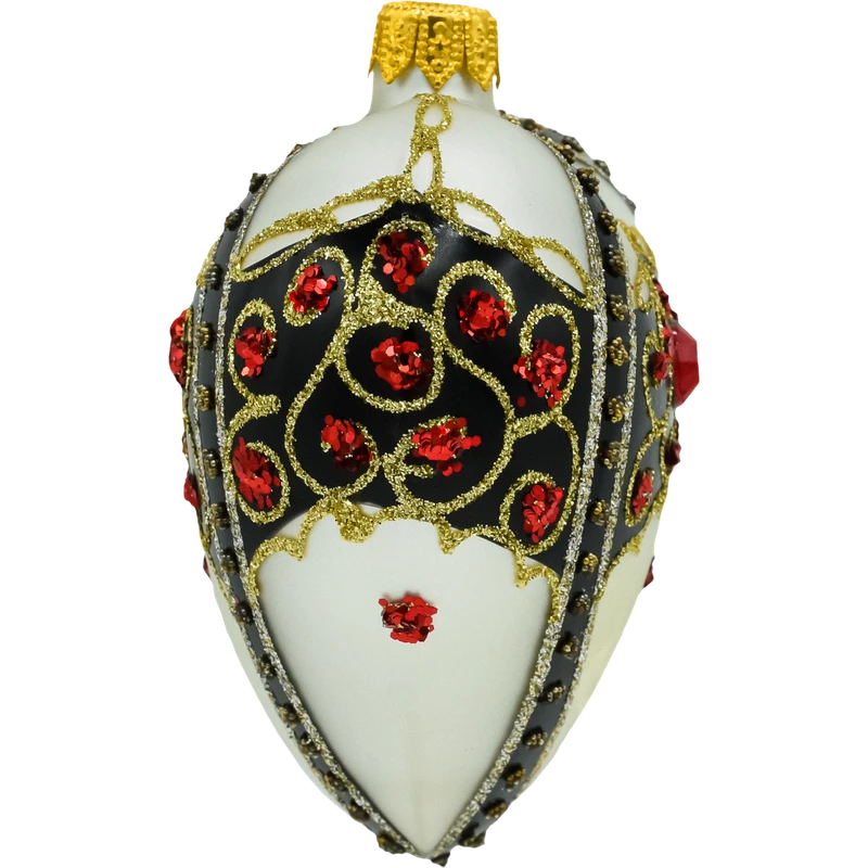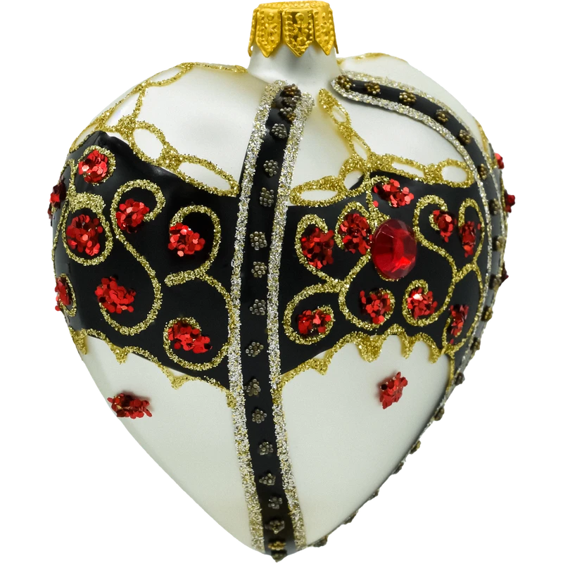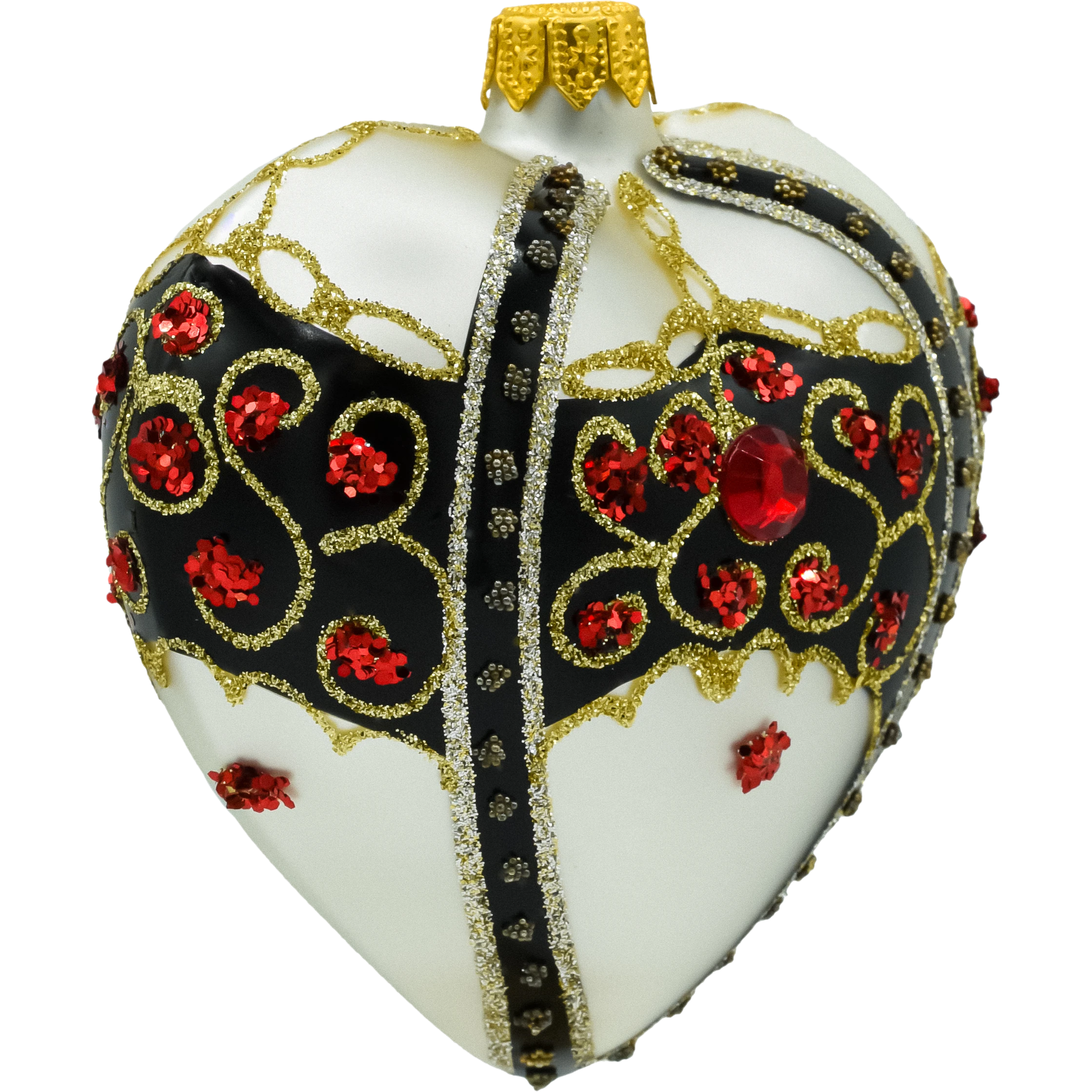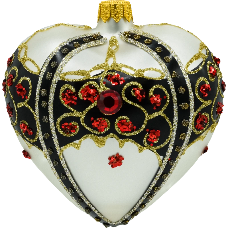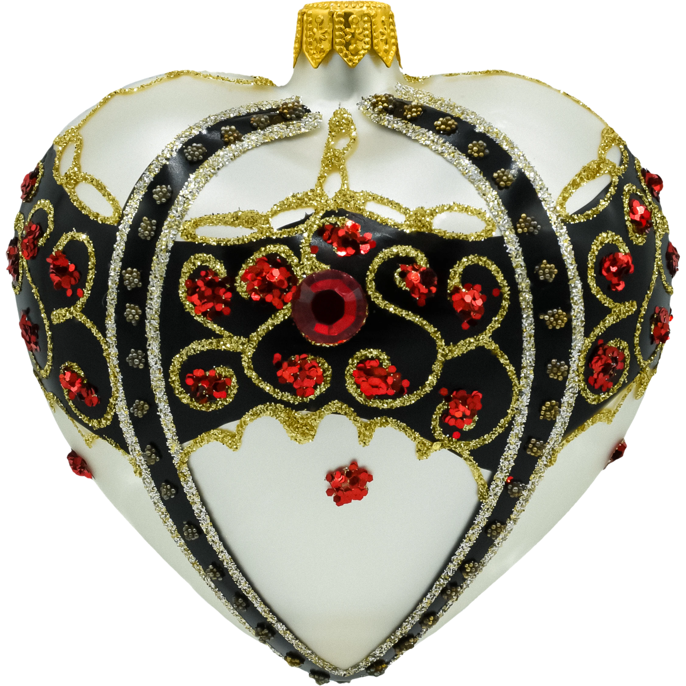 Biała powierzchnia bombki została ozdobiona złotymi wzorami w stylu barokowym oraz delikatnymi kryształami w odcieniach czerwieni i żółci. Całość tworzy elegancki i majestatyczny efekt, który wprowadza atmosferę luksusu i prestiżu. Ta ozdoba choinkowa w kształcie serca jest idealnym wyborem dla tych, którzy pragną wyróżnić swoją choinkę i nadać jej wyjątkowego charakteru.