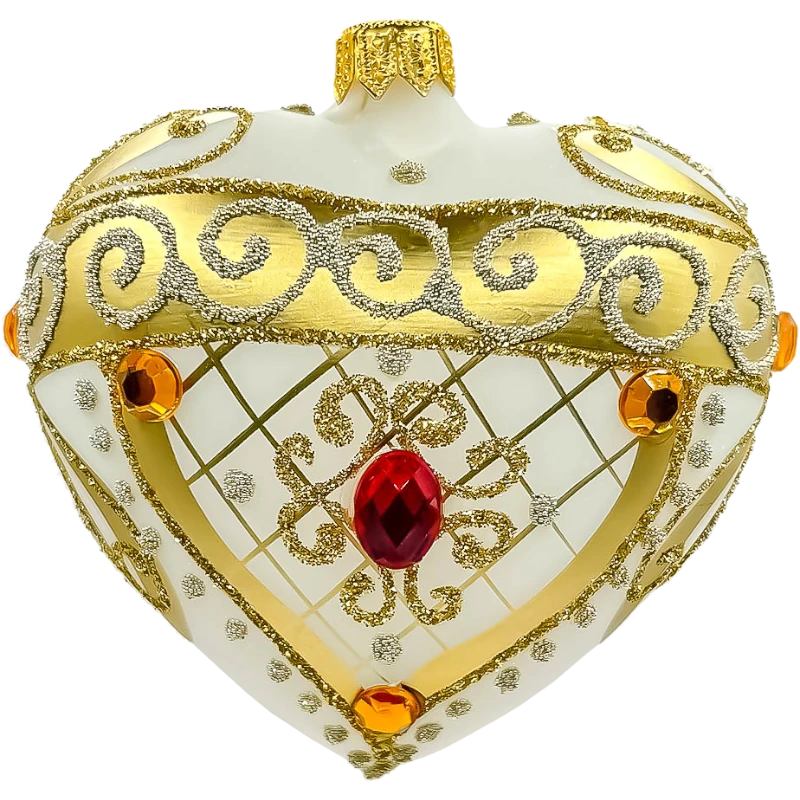Wprowadź do swojego domu odrobinę luksusu dzięki tej eleganckiej bombce w kształcie serca, wykonanej z najwyższej jakości szkła. Bombka w kolorze złamanej bieli zdobiona jest bogatymi, złotymi ornamentami i ozdobnymi kamieniami, które nadają jej królewski wygląd. Ręczne wykonanie oraz dbałość o każdy detal sprawiają, że jest to ozdoba o wyjątkowym charakterze. W centralnym punkcie bombki znajduje się wyrazisty, czerwony kryształ, który przyciąga wzrok i dodaje całości wyrafinowanego blasku.