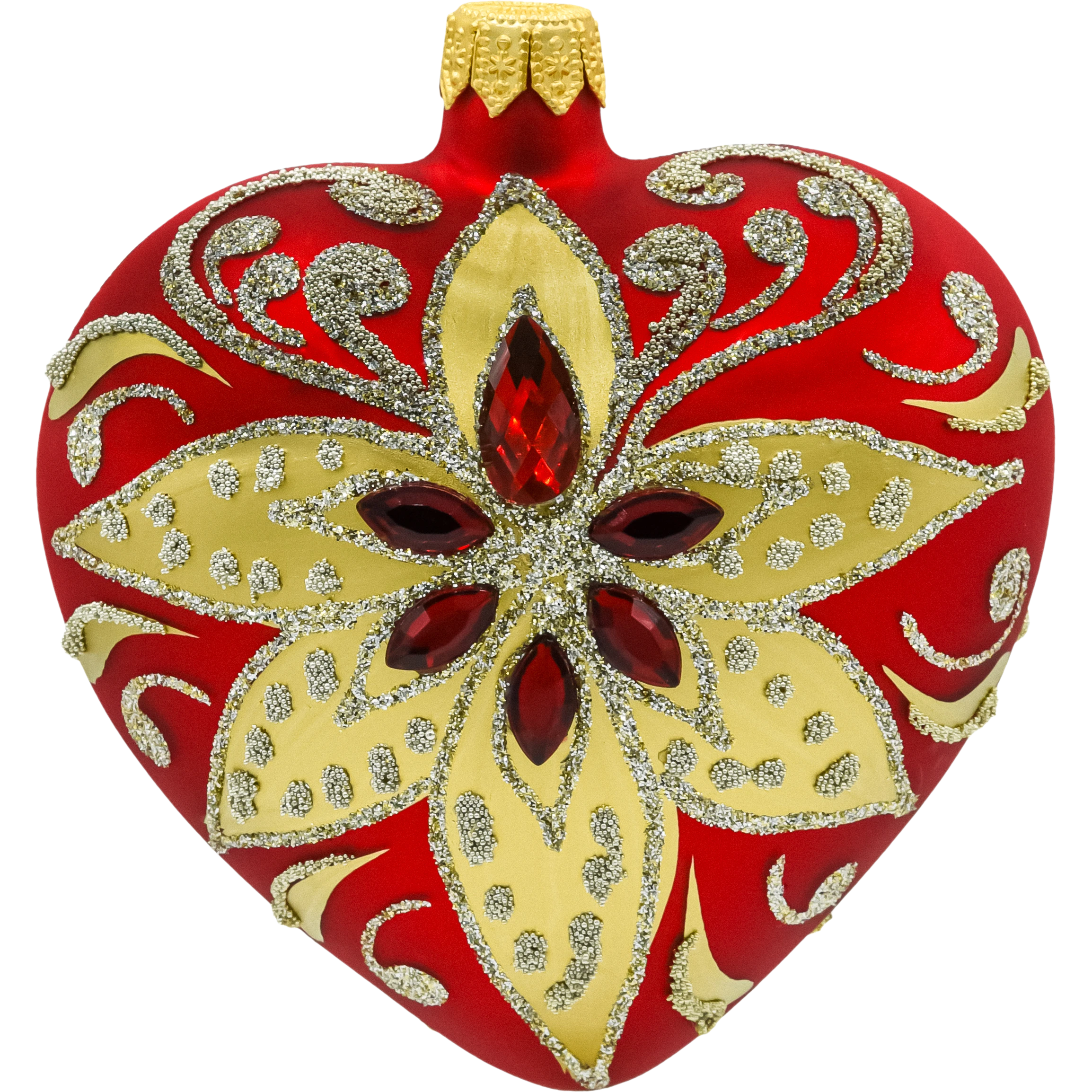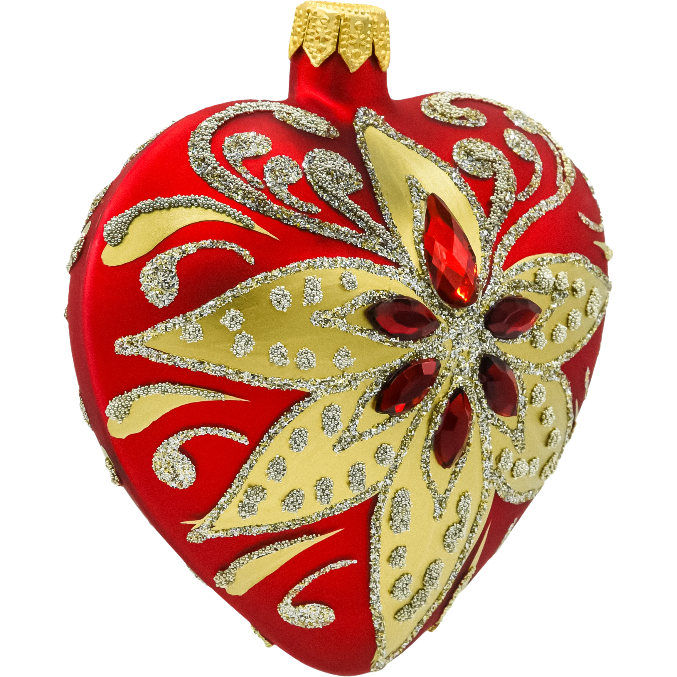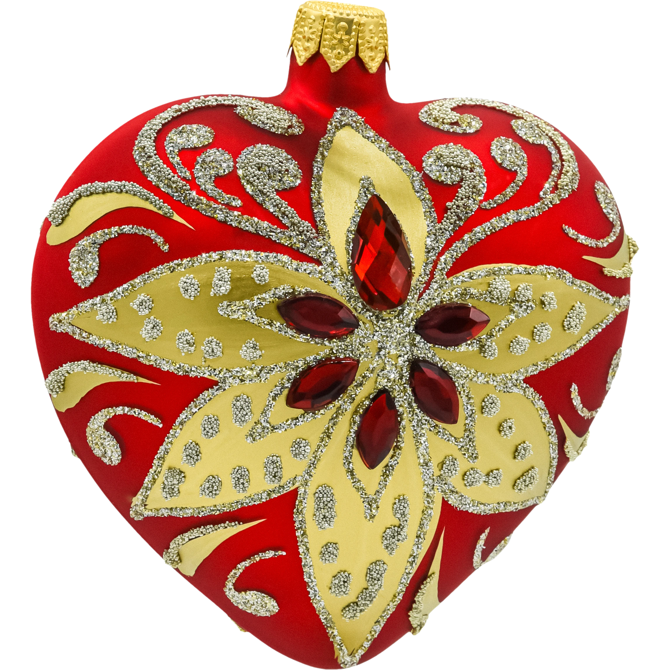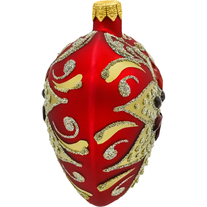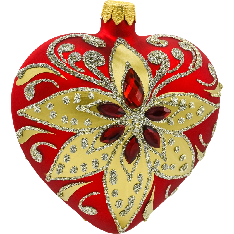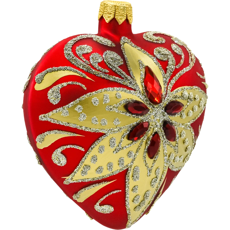 Bombka serce w intensywnym czerwonym kolorze to symbol miłości, idealnie wpisujący się w świąteczną atmosferę. Złote i srebrzyste wzory oraz wkomponowane kryształki sprawiają, że bombka mieni się pod każdym kątem, tworząc wyjątkowy efekt wizualny. Ta ozdoba świetnie komponuje się zarówno w klasycznych, jak i nowoczesnych aranżacjach choinkowych.