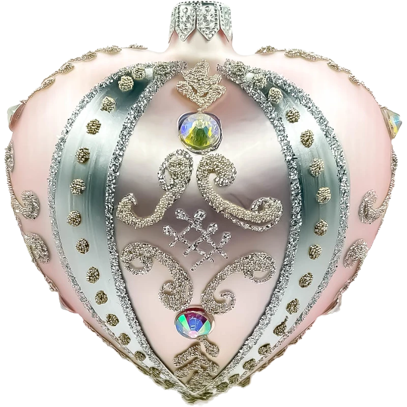 Dodaj subtelnego luksusu do swojej choinki z tą wyjątkową bombką w kształcie serca, ozdobioną eleganckim perłowo-różowym wykończeniem. Bombka została ręcznie zdobiona srebrnymi i złotymi akcentami, tworząc misterny, klasyczny wzór z użyciem brokatu i kryształków, które pięknie odbijają światło. W centrum bombki znajdują się połyskujące kryształki, które dodają jej wyjątkowego blasku i nadają królewskiego charakteru, doskonale komponując się w eleganckich świątecznych aranżacjach.