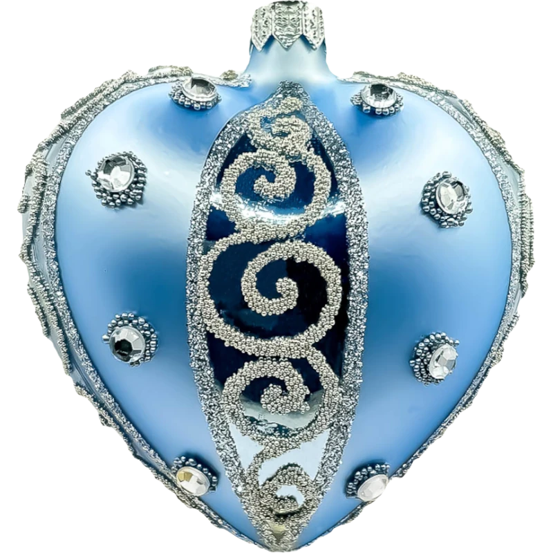 Dodaj swojej choince elegancji i wyrafinowania dzięki tej luksusowej bombce w kształcie serca. Wykonana z najwyższej jakości szkła, bombka przyciąga uwagę głębokim, błękitnym odcieniem oraz srebrnymi zdobieniami w formie spiralnych ornamentów i kryształków. Srebrzyste akcenty, misternie nakładane przez doświadczonych rzemieślników, nadają bombce królewski charakter, a odbijające światło kryształki sprawiają, że bombka lśni na choince niczym prawdziwy klejnot.