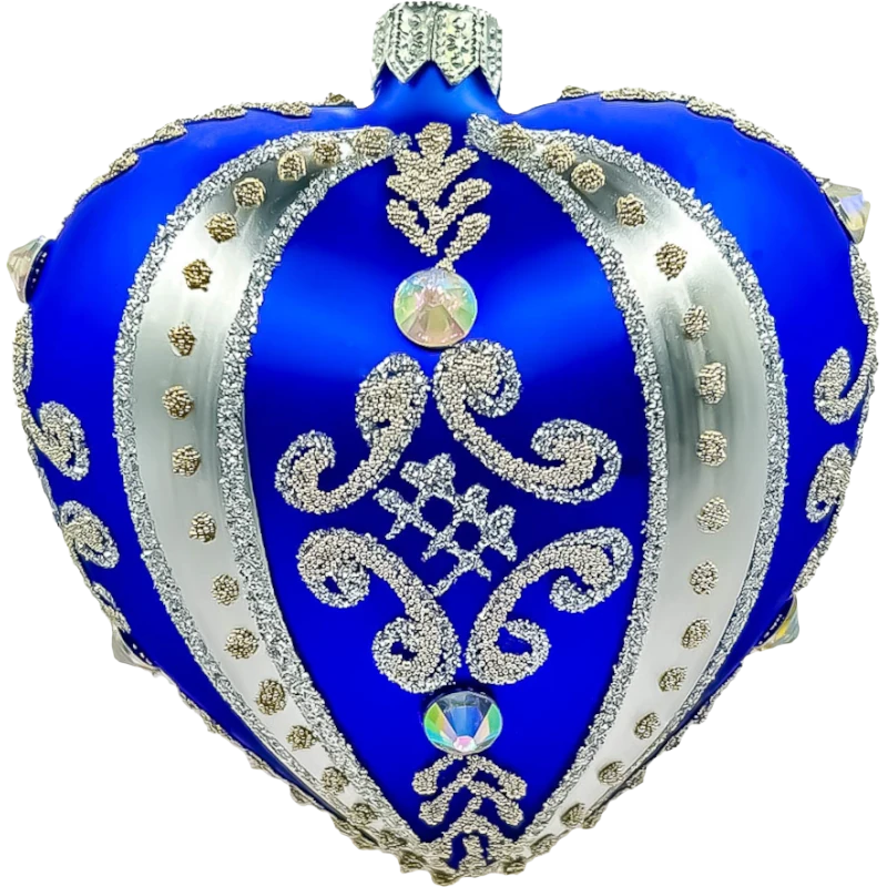 Nadaj swojej choince wyjątkowy charakter z tą elegancką bombką w kształcie serca, wykonaną z najwyższej jakości szkła. Bombka ta wyróżnia się głębokim, kobaltowym kolorem, który harmonijnie komponuje się ze srebrnymi zdobieniami, tworząc luksusowy i świąteczny wygląd. Misternie wykonane, ręcznie nakładane zdobienia w stylu barokowym oraz połyskujące kryształy sprawiają, że ta bombka to nie tylko ozdoba, ale małe dzieło sztuki. Idealna dla miłośników klasycznego stylu i wysokiej jakości dekoracji świątecznych.