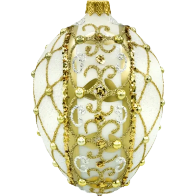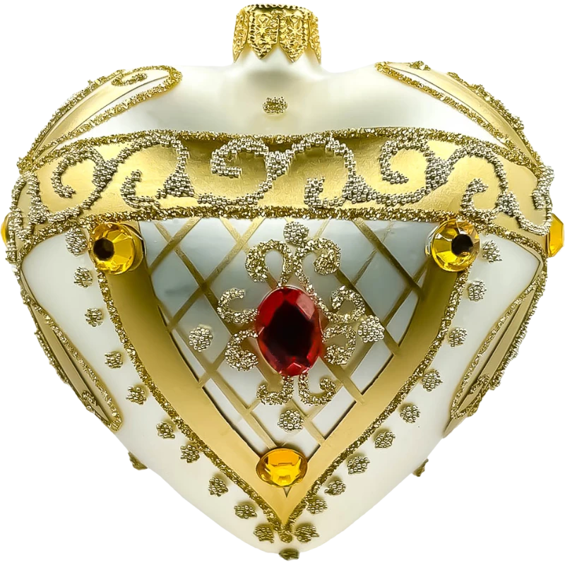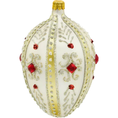 Połączenie kremowej barwy z bogatymi, złotymi zdobieniami i centralnym rubinowym kryształem przywodzi na myśl ozdoby pałacowe i nadaje bombce ponadczasowy wygląd. Subtelna siatka wzorów oraz misternie wykonane detale tworzą harmonijną kompozycję, która wprowadza do wnętrza świąteczny nastrój pełen luksusu i elegancji.