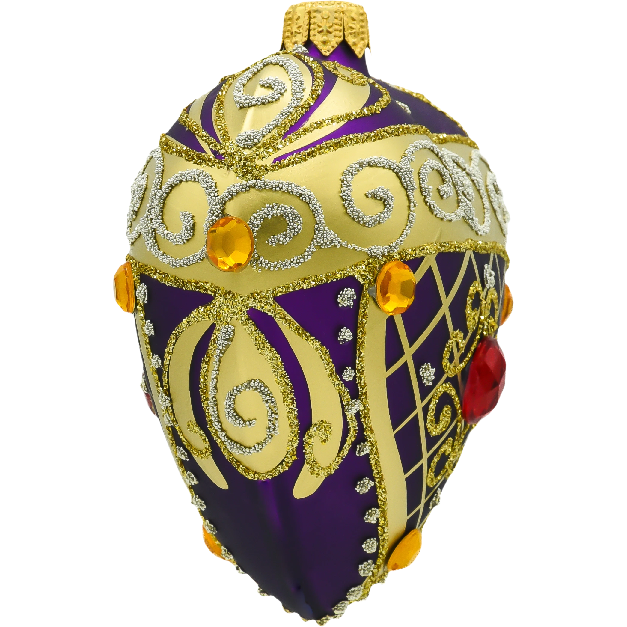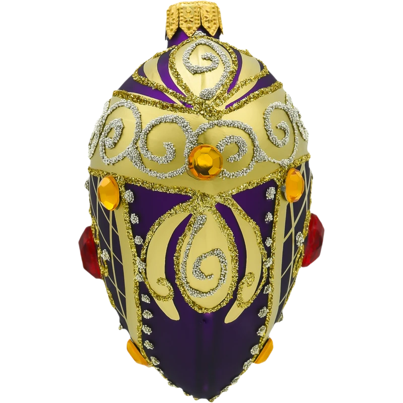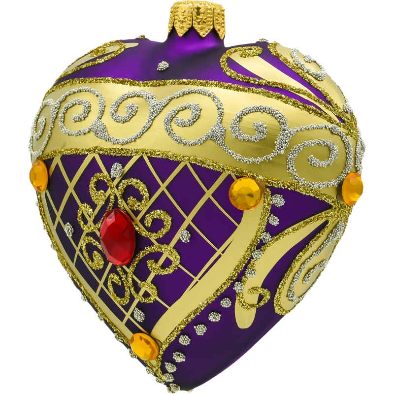 Wzbogać swoją świąteczną aranżację o bombkę w kształcie serca w głębokim odcieniu fioletu, która z pewnością stanie się główną ozdobą Twojej choinki. Wykonana z najwyższej jakości szkła, bombka zachwyca bogatymi złotymi ornamentami w stylu barokowym oraz subtelnym, czerwonym kryształem umieszczonym w centrum. Ręcznie wykonane zdobienia oraz intensywny, fioletowy kolor sprawiają, że bombka ta jest luksusowym dodatkiem, który przyciąga uwagę i nadaje wnętrzu wyjątkowego charakteru.
