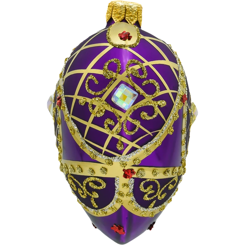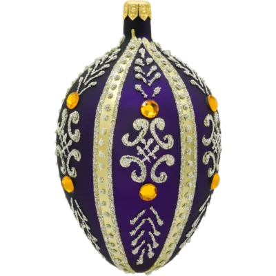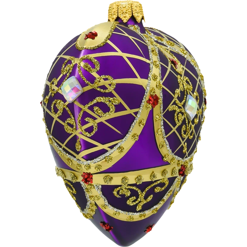 Fioletowy kolor bombki symbolizuje luksus i bogactwo, a złote zdobienia nadają jej elegancki, królewski styl. Siatka złotych linii przeplatana misternymi ornamentami oraz centralnie umieszczony kryształ sprawiają, że bombka wygląda jak prawdziwy klejnot na choince. To idealna dekoracja dla osób, które pragną, aby ich choinka wyróżniała się w wyjątkowy sposób.