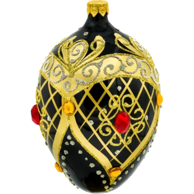 Dekoracje: Złota siatka z ornamentami oraz czerwone i przezroczyste kryształki, które nadają bombce luksusowego wyglądu