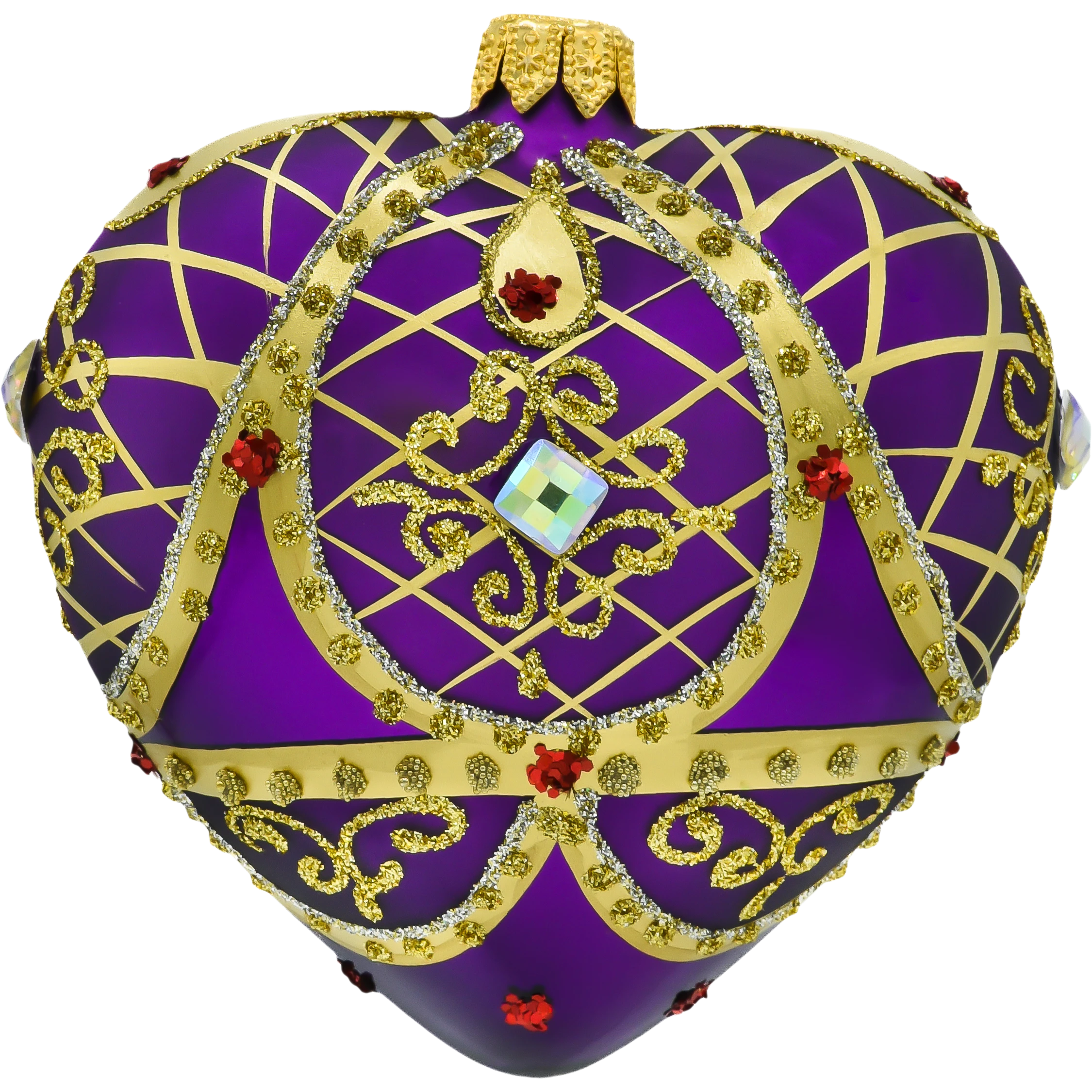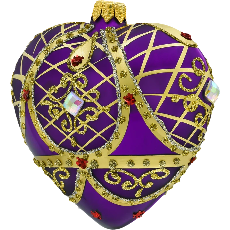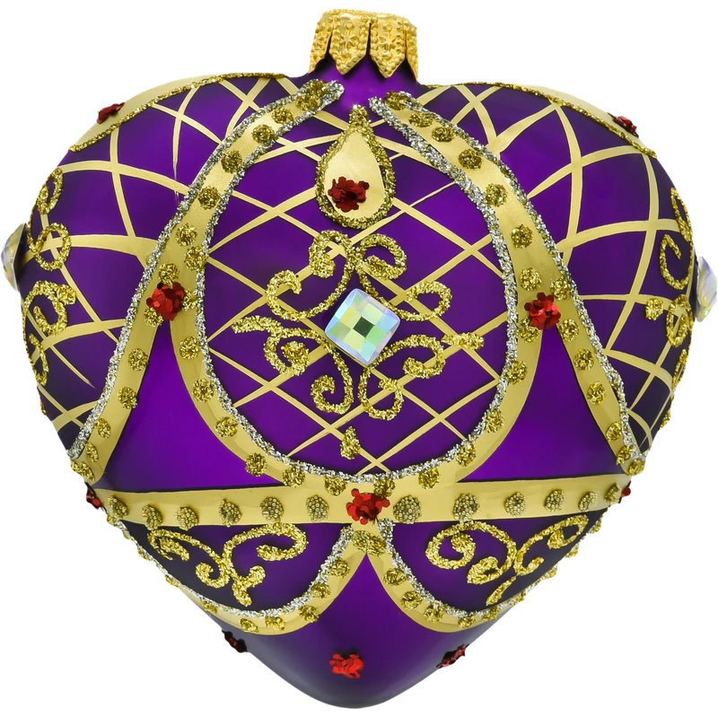 Odkryj wyjątkowy urok tej luksusowej bombki choinkowej w kształcie serca, która doda świątecznej elegancji każdemu wnętrzu. Bombka w głębokim, królewskim odcieniu fioletu zdobiona jest misterną złotą siatką i ozdobiona błyszczącymi, czerwonymi i przezroczystymi kryształkami. Ręcznie wykonane złote ornamenty oraz centralny kwadratowy kryształ dodają bombce majestatycznego charakteru, przyciągając uwagę i nadając choince wyjątkowego blasku.