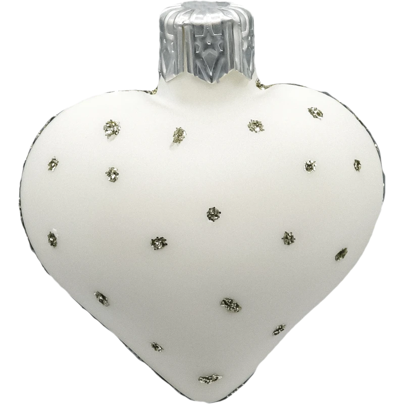 Szklana bombka choinkowa serce w białym kolorze z brokatowymi kropkami – elegancka ozdoba bożonarodzeniowa
