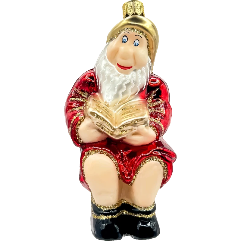 Bombka przedstawia uśmiechniętego skrzata w czerwonym stroju ze złotymi wykończeniami, który z zaciekawieniem czyta książkę. To symbol mądrości, spokoju i rodzinnych świątecznych chwil.