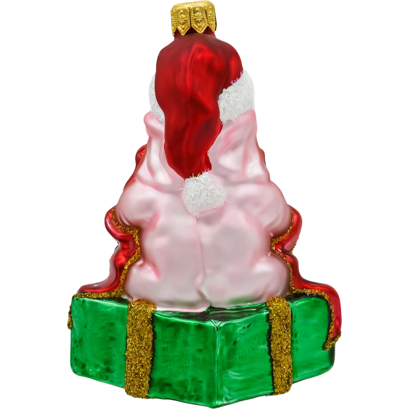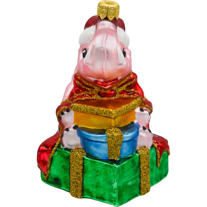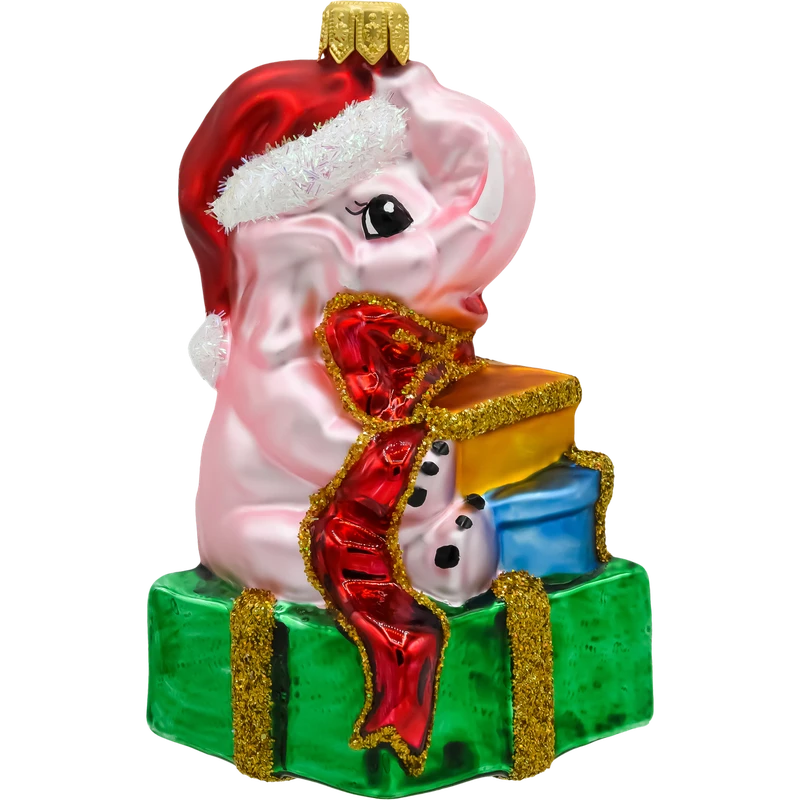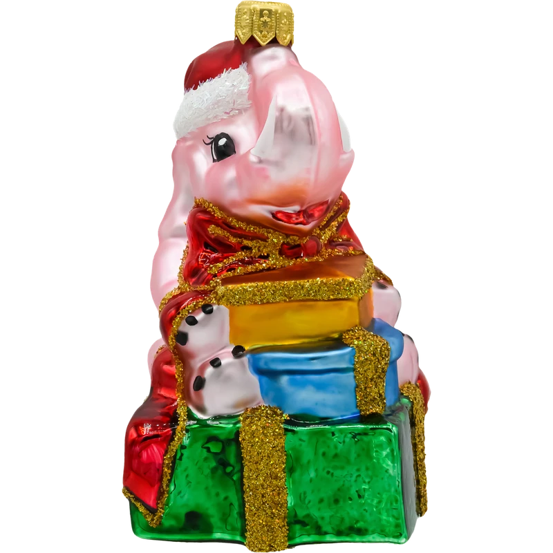Dodaj uroku i niepowtarzalności swojej choince dzięki wyjątkowej bombce w kształcie różowego słonika z prezentami. Ta urocza, ręcznie zdobiona ozdoba wykonana została z dmuchanego szkła i przedstawia siedzącego na zielonym pudełku słonia w czapce świętego Mikołaja, trzymającego dwa kolorowe prezenty – żółto-pomarańczowy oraz niebieski – przyozdobione błyszczącym brokatem. Całość zdobią również czerwony szal i starannie namalowane detale twarzy, które nadają słonikowi ciepły, sympatyczny wyraz.