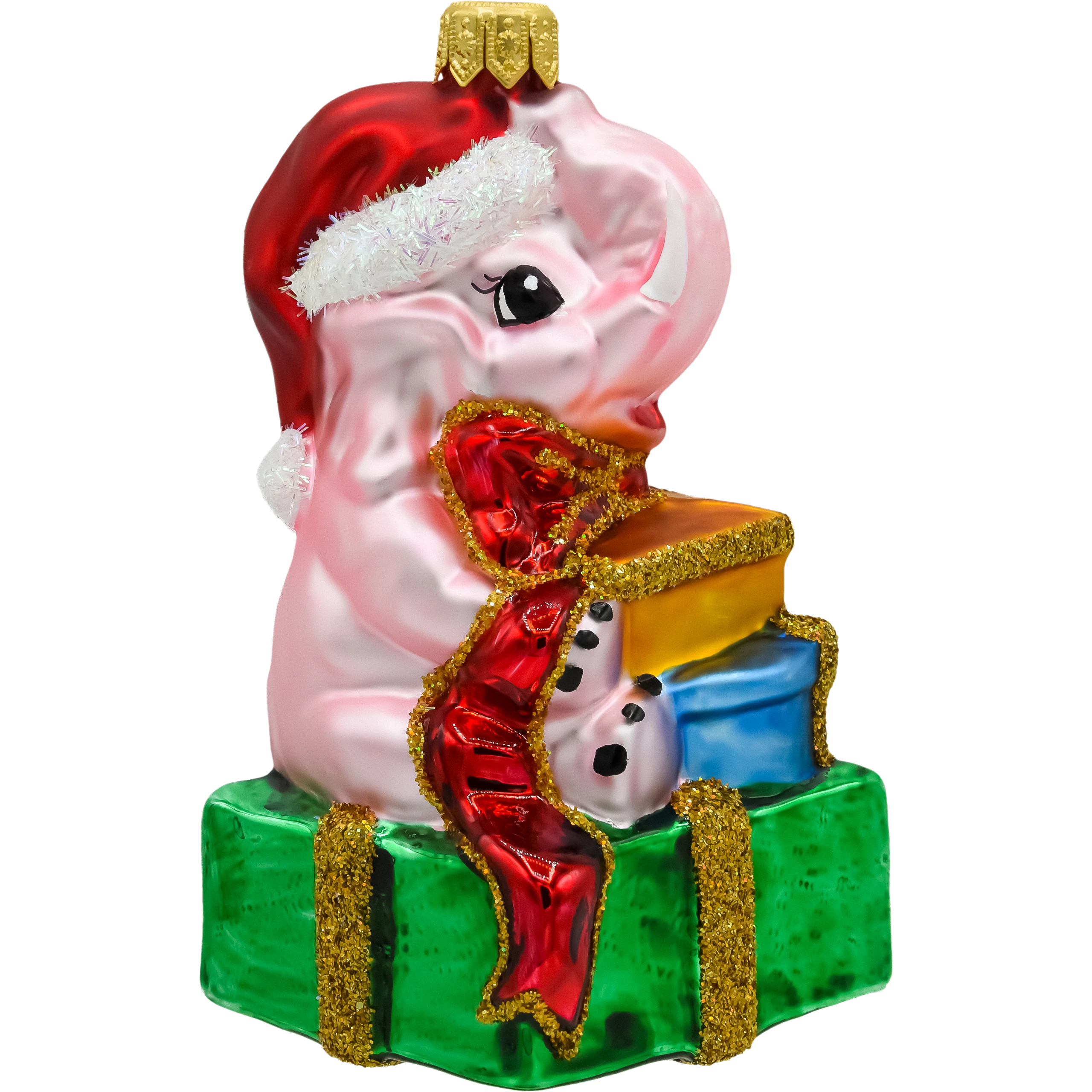Ręcznie malowana bombka szklana w kształcie różowego słonika z prezentami i czapką Mikołaja. Kolorowa ozdoba choinkowa dla dzieci i kolekcjonerów – idealna do bajkowej aranżacji świątecznego drzewka.